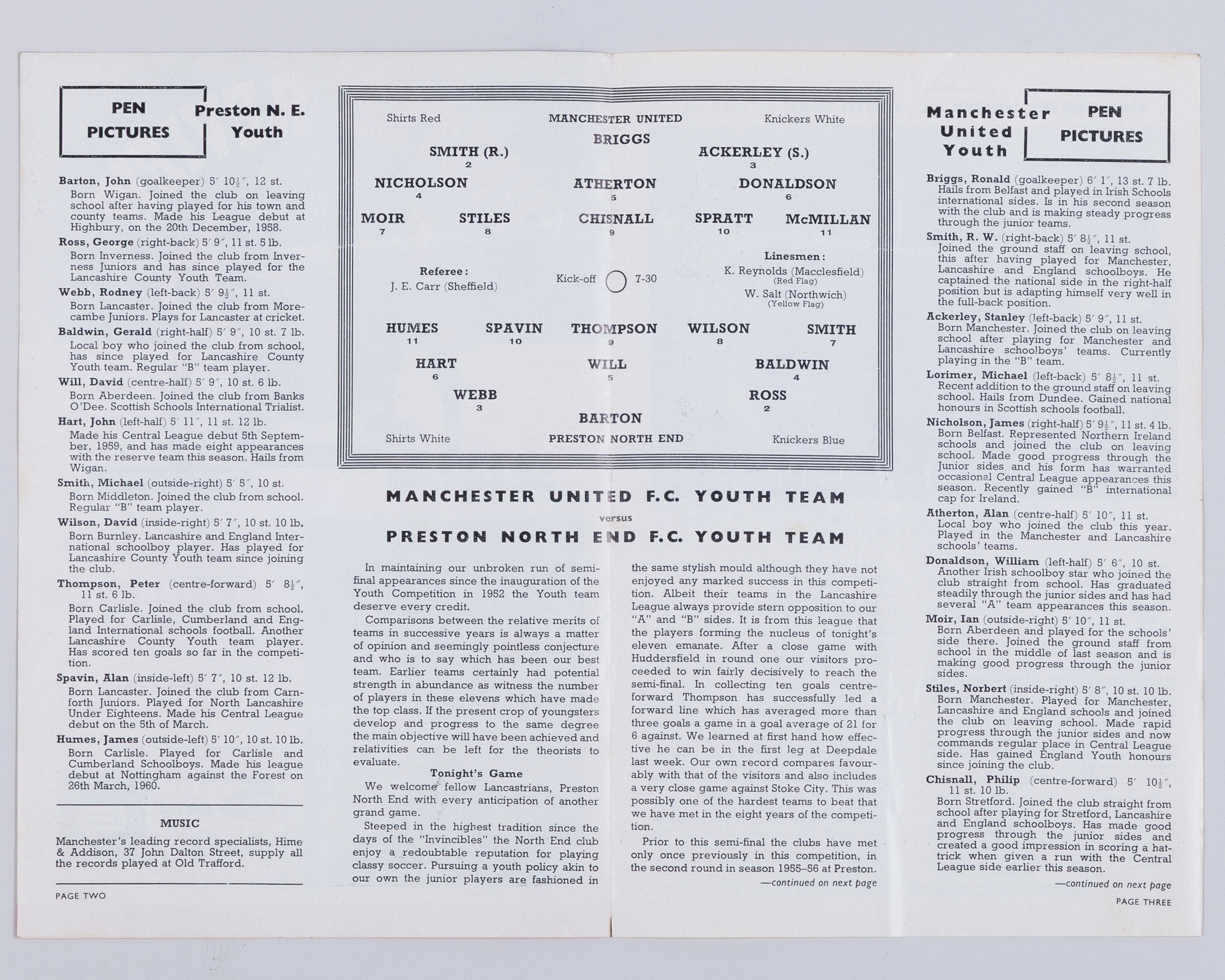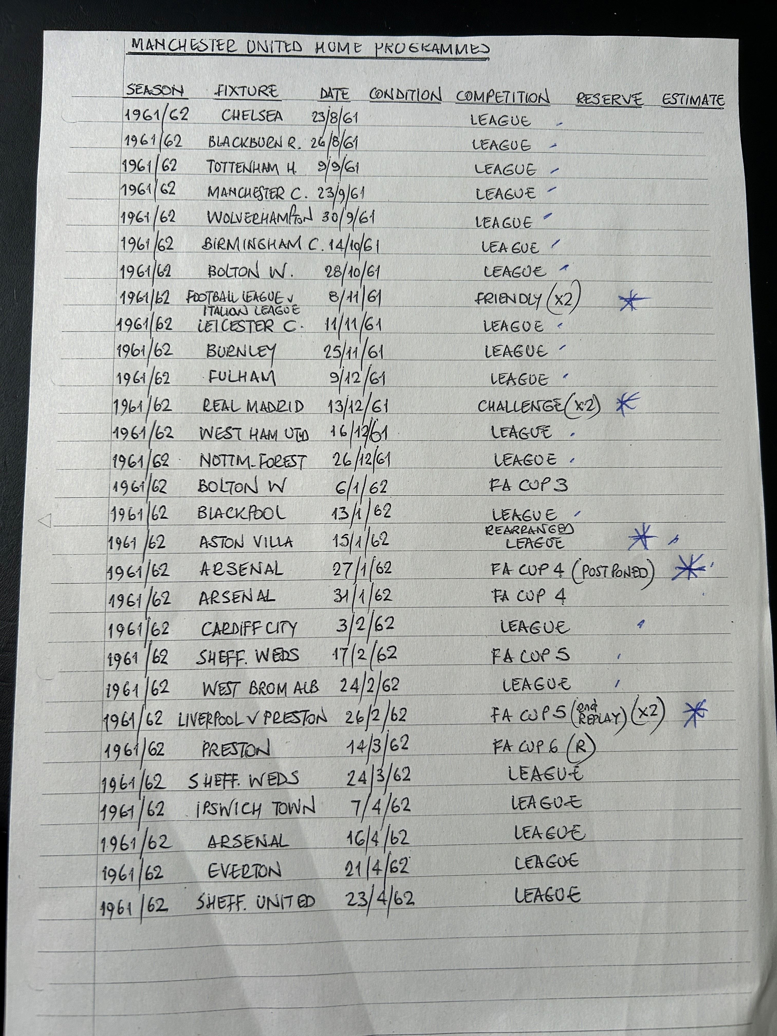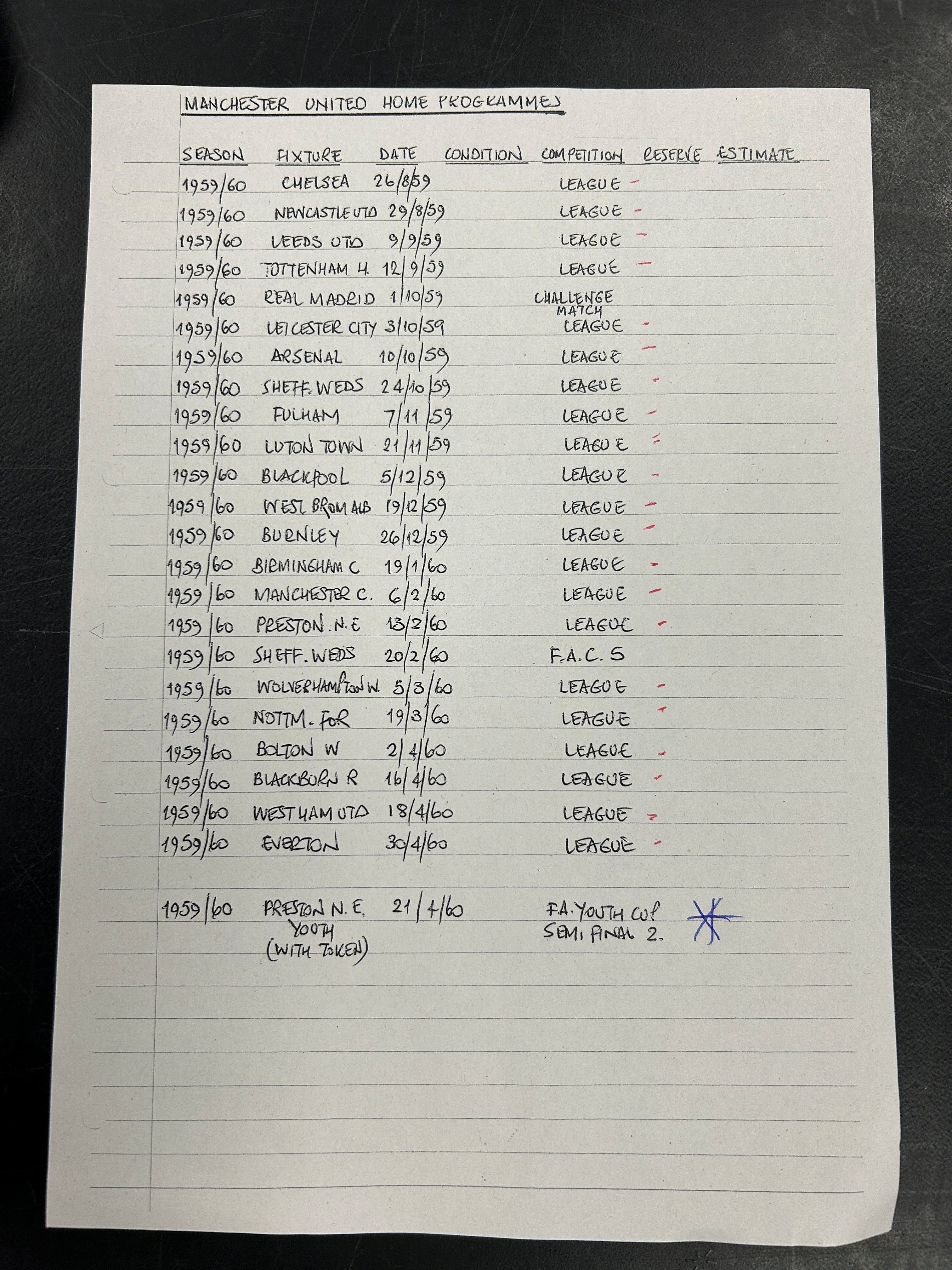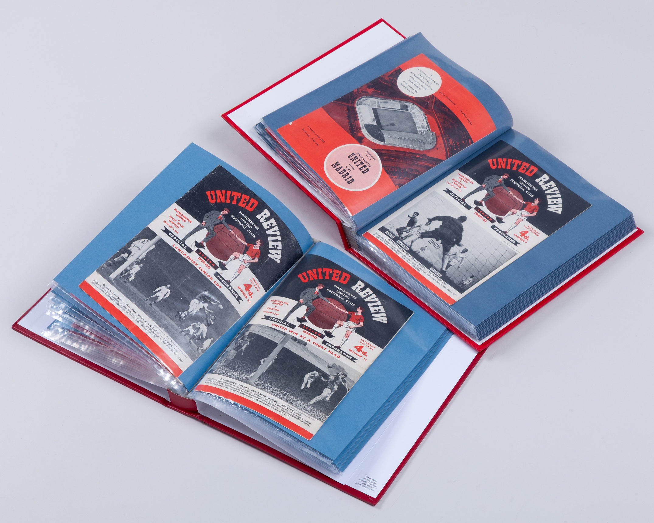 Complete run of Manchester United home league match programmes, 1959-60 to 1962-63, including Real Madrid, 1st October 1959, Preston North End, Youth Cup semi-final, 21st April 1960, 1960-61 including FA XI v. RAF XI, 5th October 1960, Liverpool Youth, 8th October 1960, Real Madrid, League Cup, F.A.Cup etc 1961-62, including F.A.Cup programmes, Football League v. Italian League, Real Madrid Challenge, Arsenal postponed match programme and complete run of Manchester United home league match programmes, 1962-63 including F.A.Cup and Arsenal, match abandoned match programme (a lot)