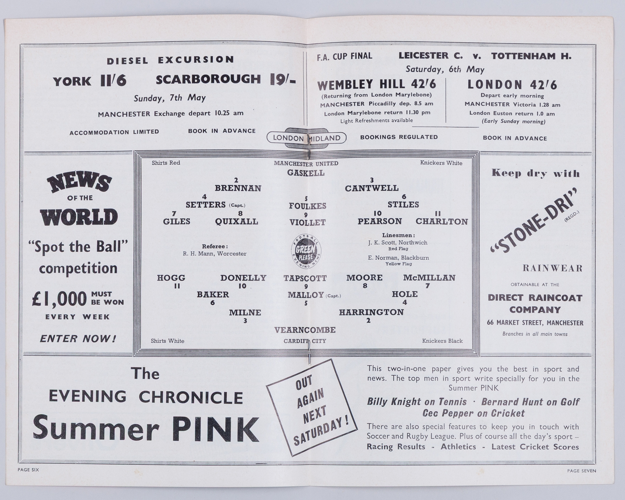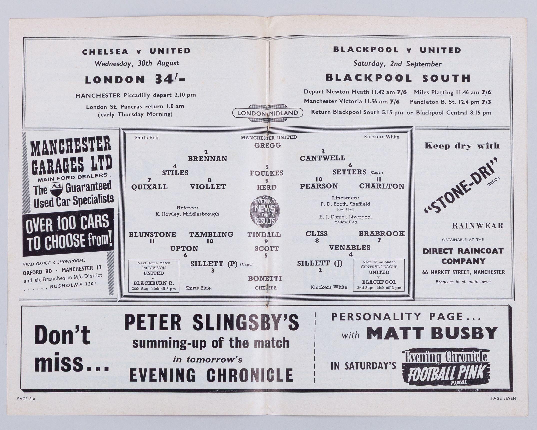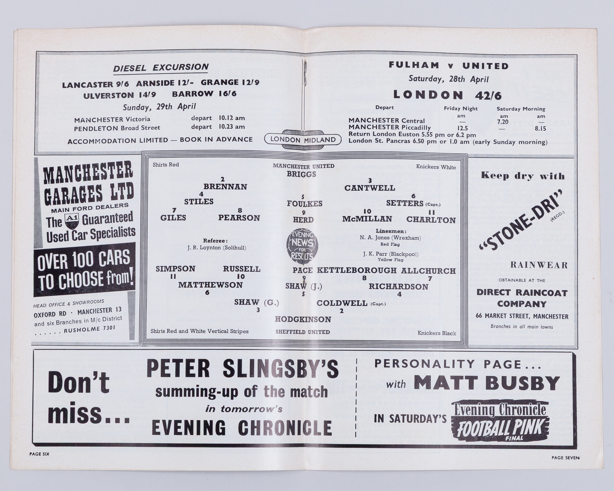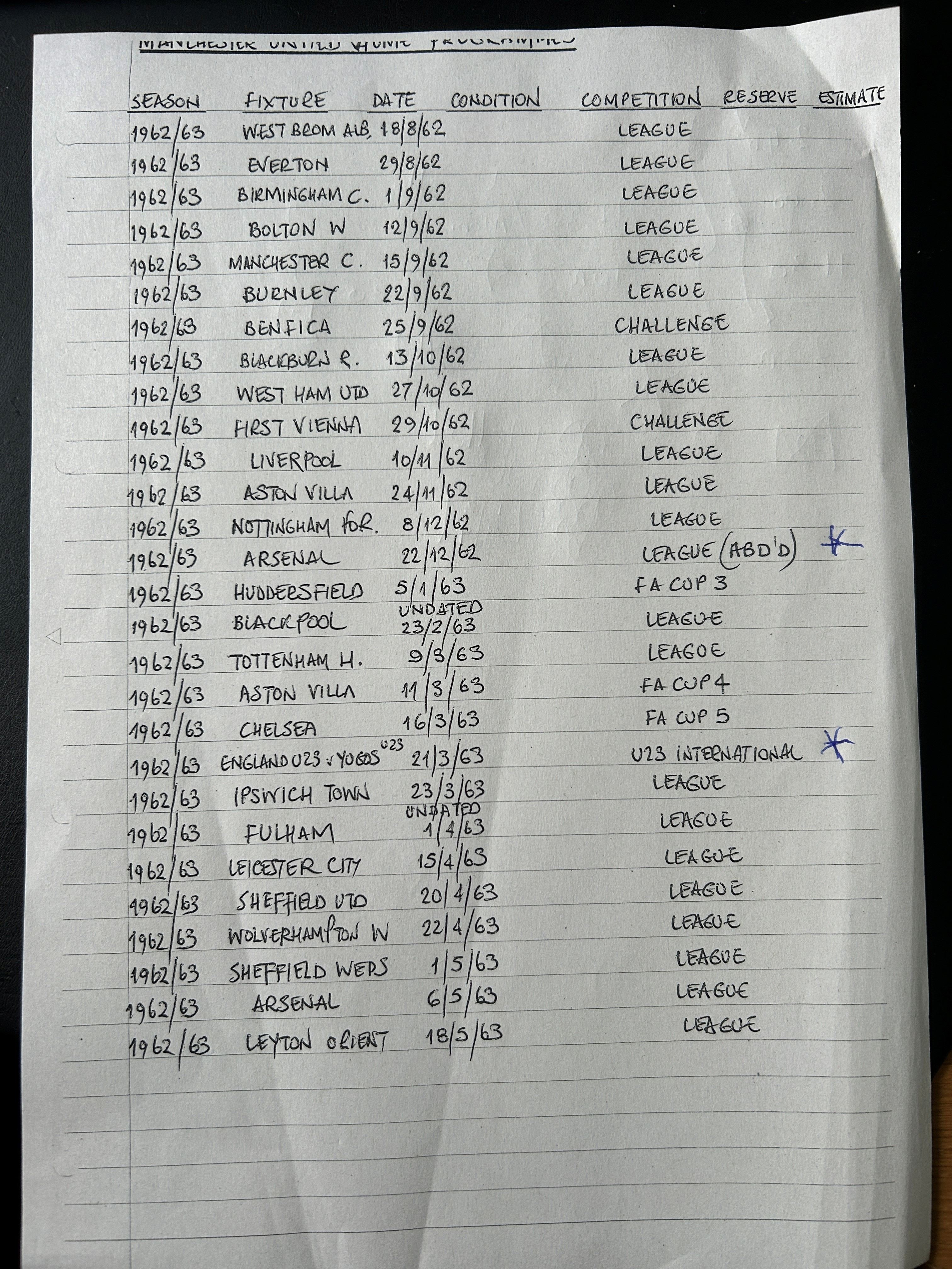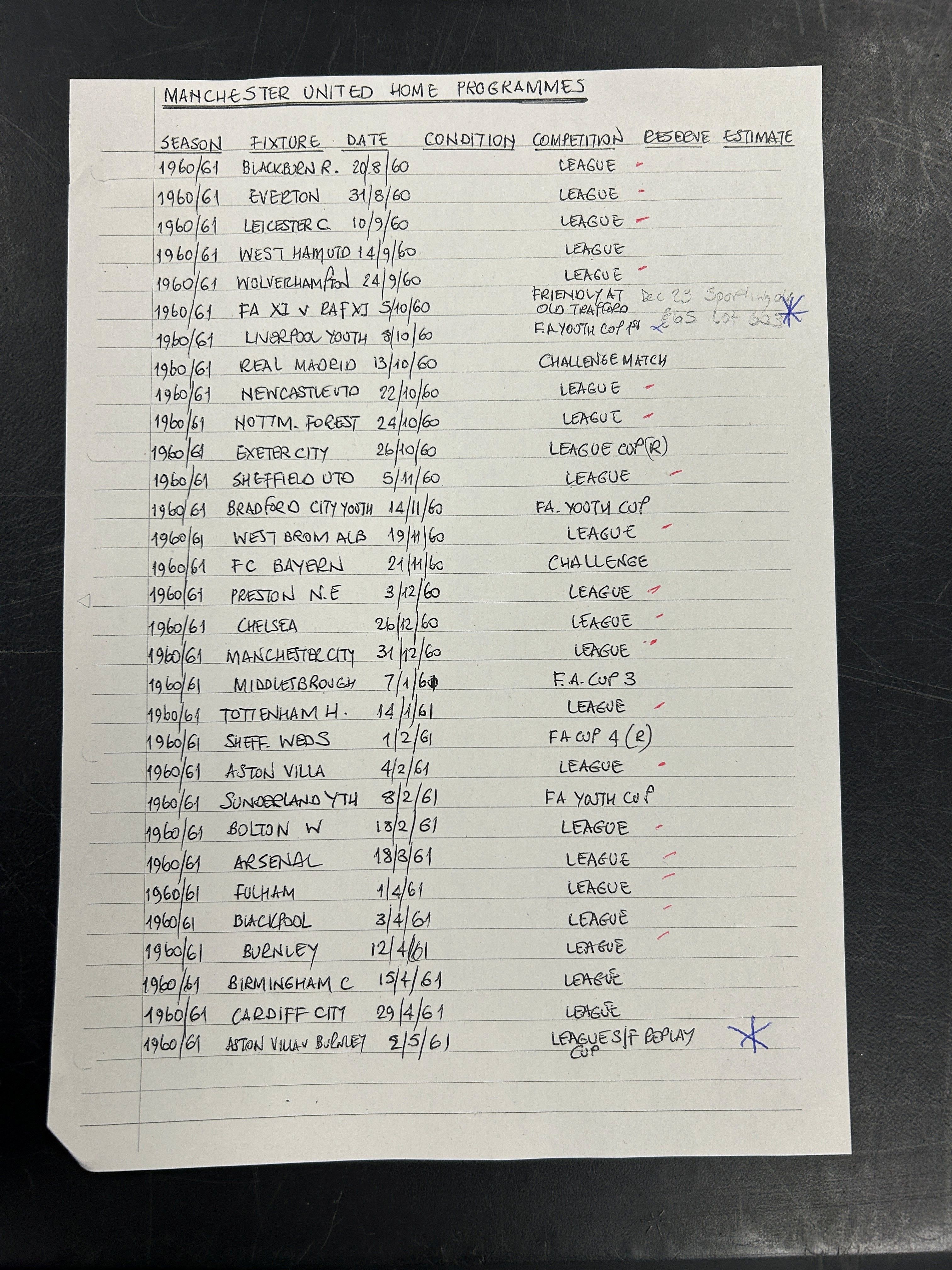 Complete run of Manchester United home league match programmes, 1959-60 to 1962-63, including Real Madrid, 1st October 1959, Preston North End, Youth Cup semi-final, 21st April 1960, 1960-61 including FA XI v. RAF XI, 5th October 1960, Liverpool Youth, 8th October 1960, Real Madrid, League Cup, F.A.Cup etc 1961-62, including F.A.Cup programmes, Football League v. Italian League, Real Madrid Challenge, Arsenal postponed match programme and complete run of Manchester United home league match programmes, 1962-63 including F.A.Cup and Arsenal, match abandoned match programme (a lot)
