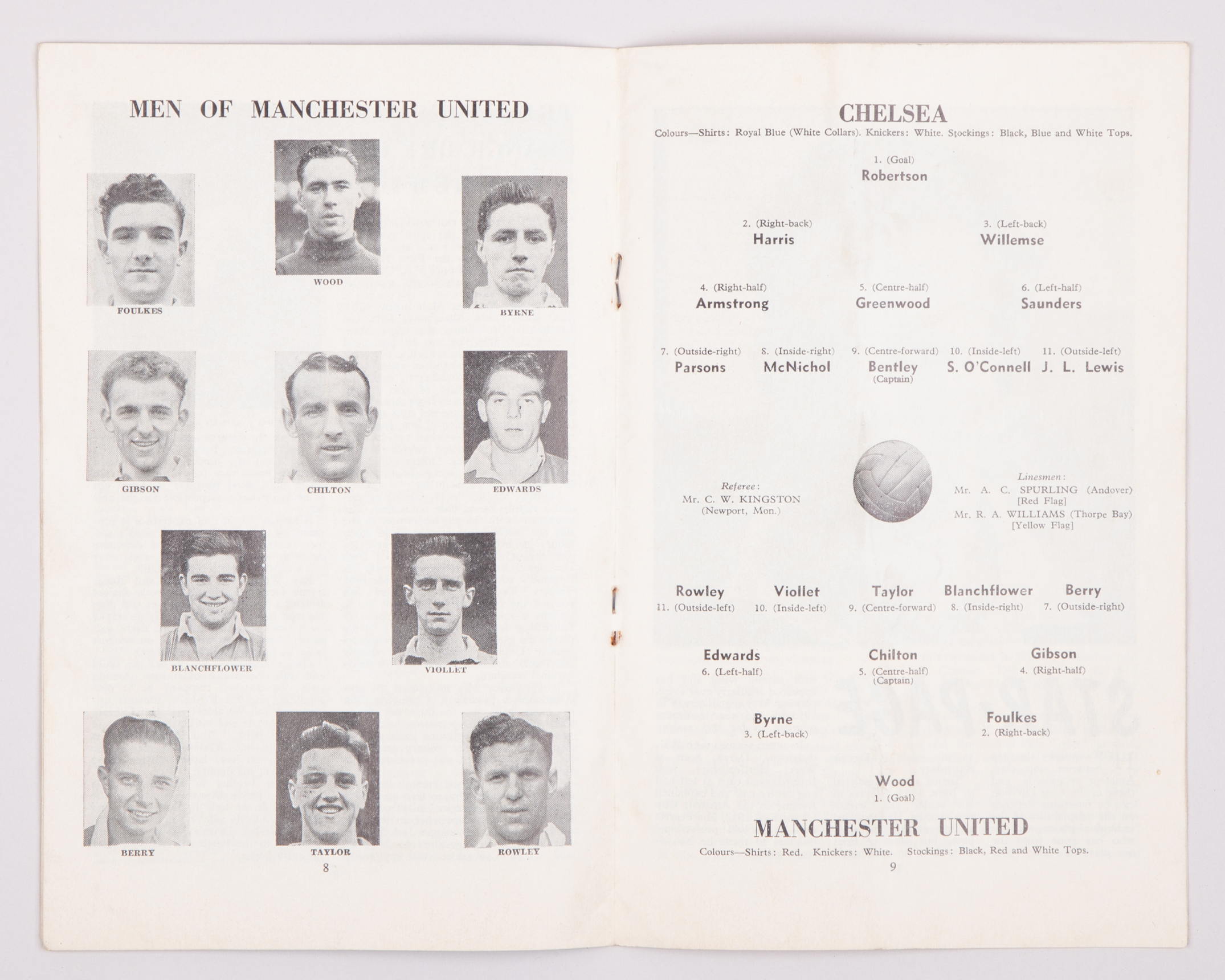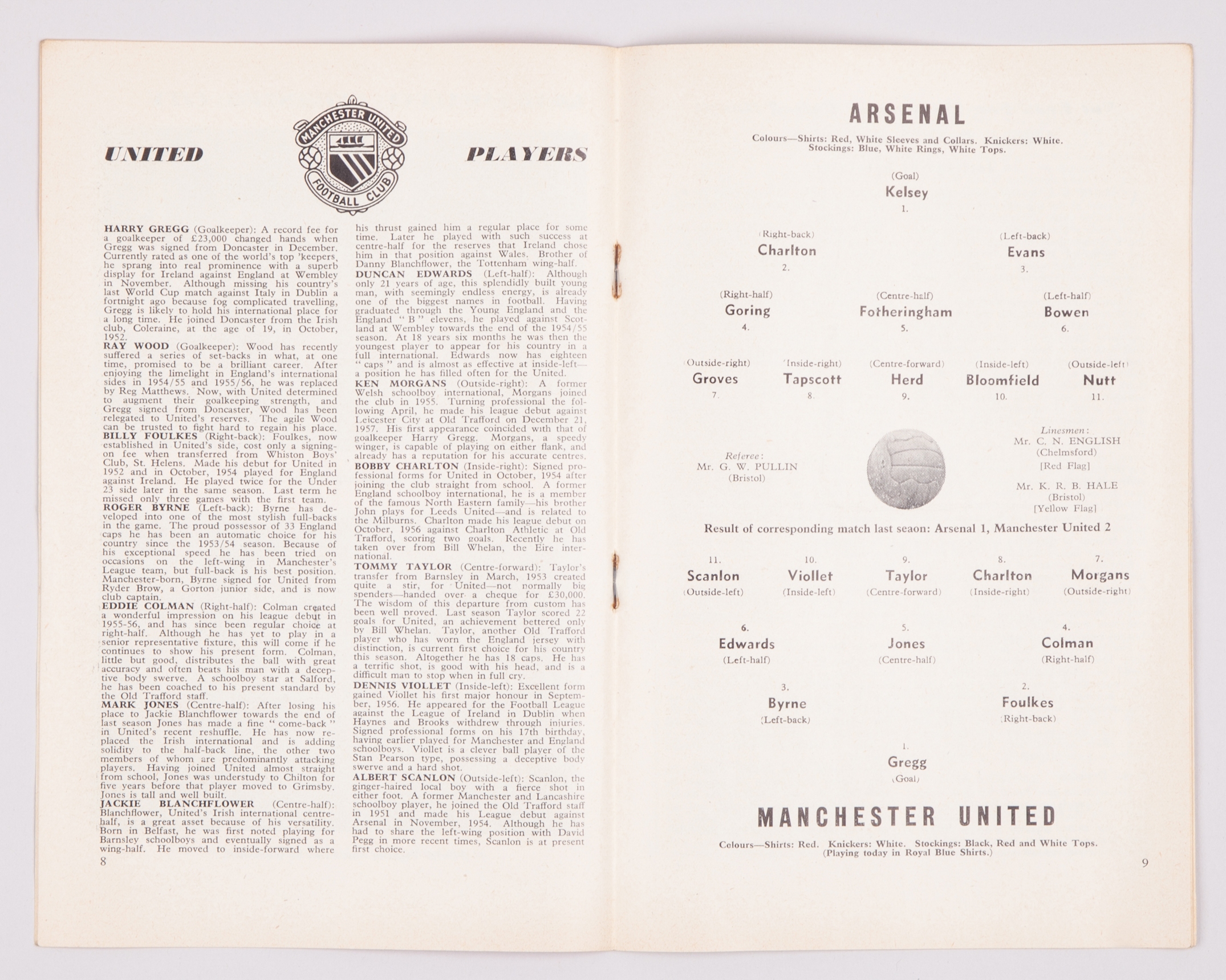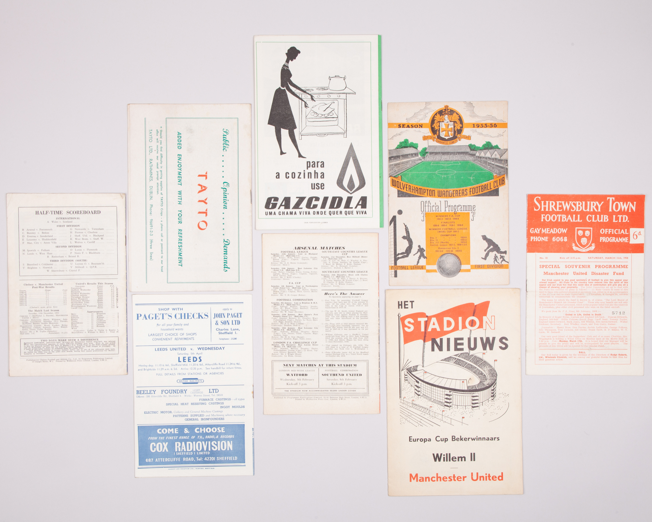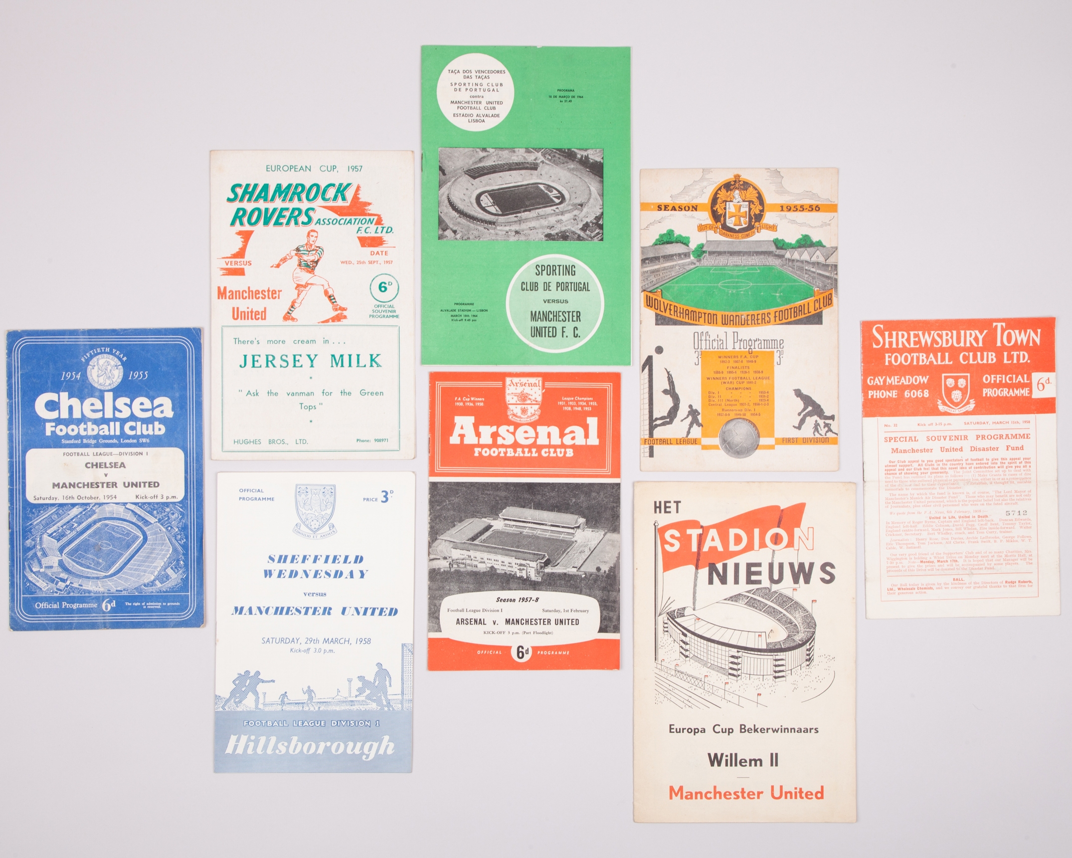 Arsenal v. Manchester United, match programme, 1st February 1958, last match before Munich Disaster, Chelsea v. Manchester United, 16th October 1954, Shrewsbury Town v Southend United souvenir Manchester United Disaster Fund match programme, 15th March 1958 and five other away match programmes