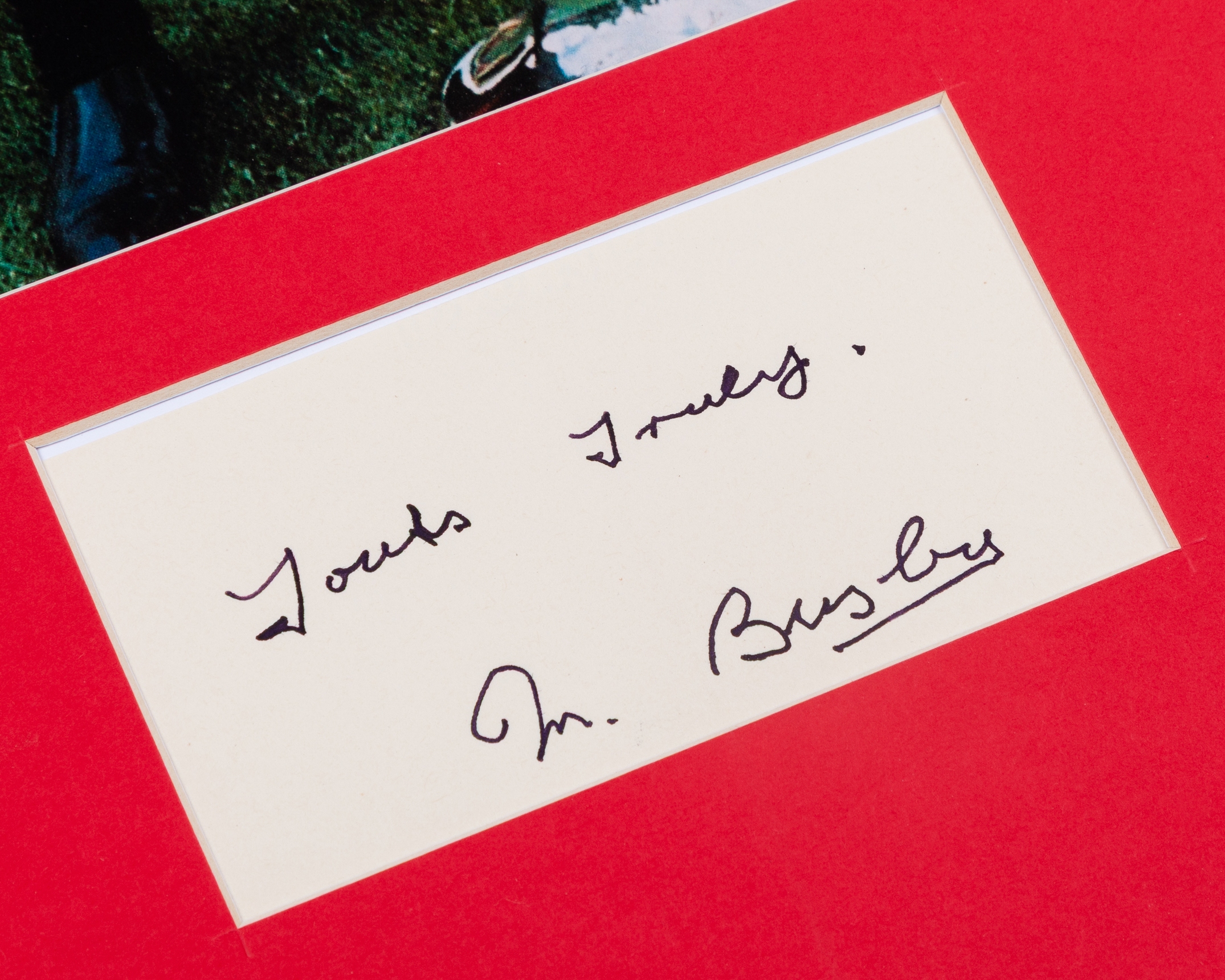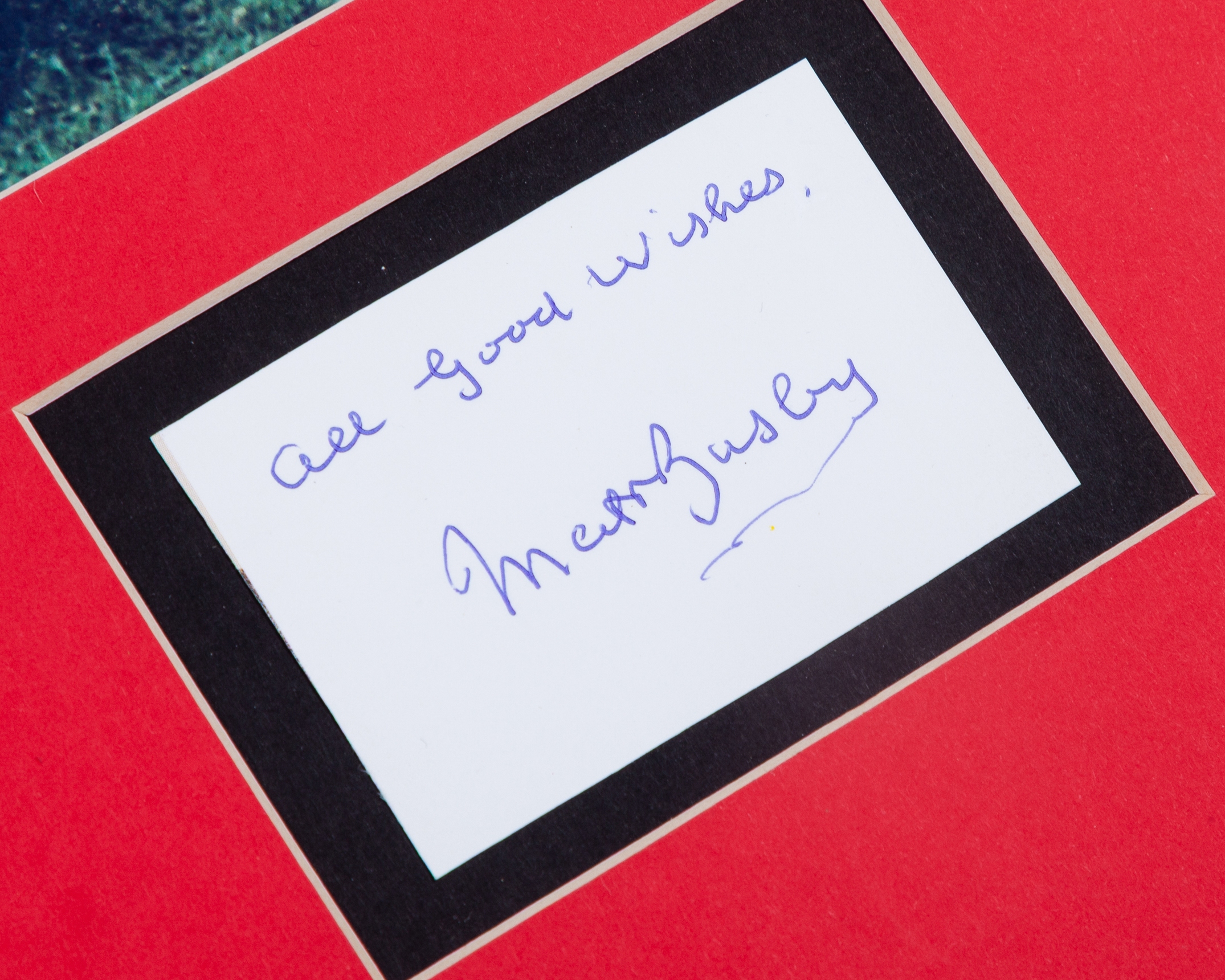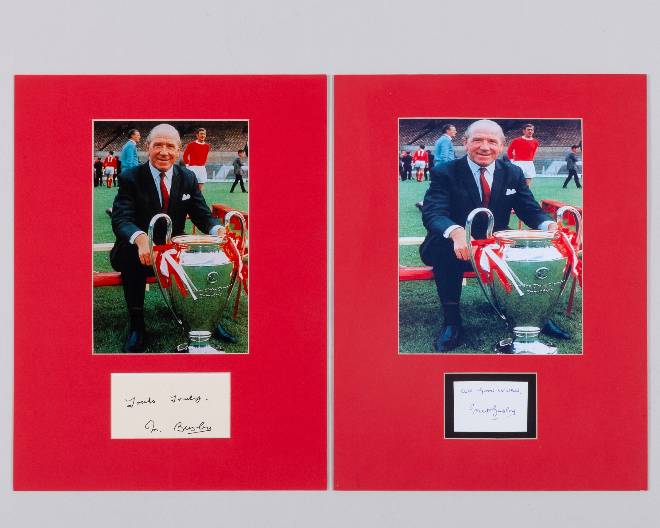 Two Matt Busby mounted autographed cards with colour photograph, 31 x 40cm