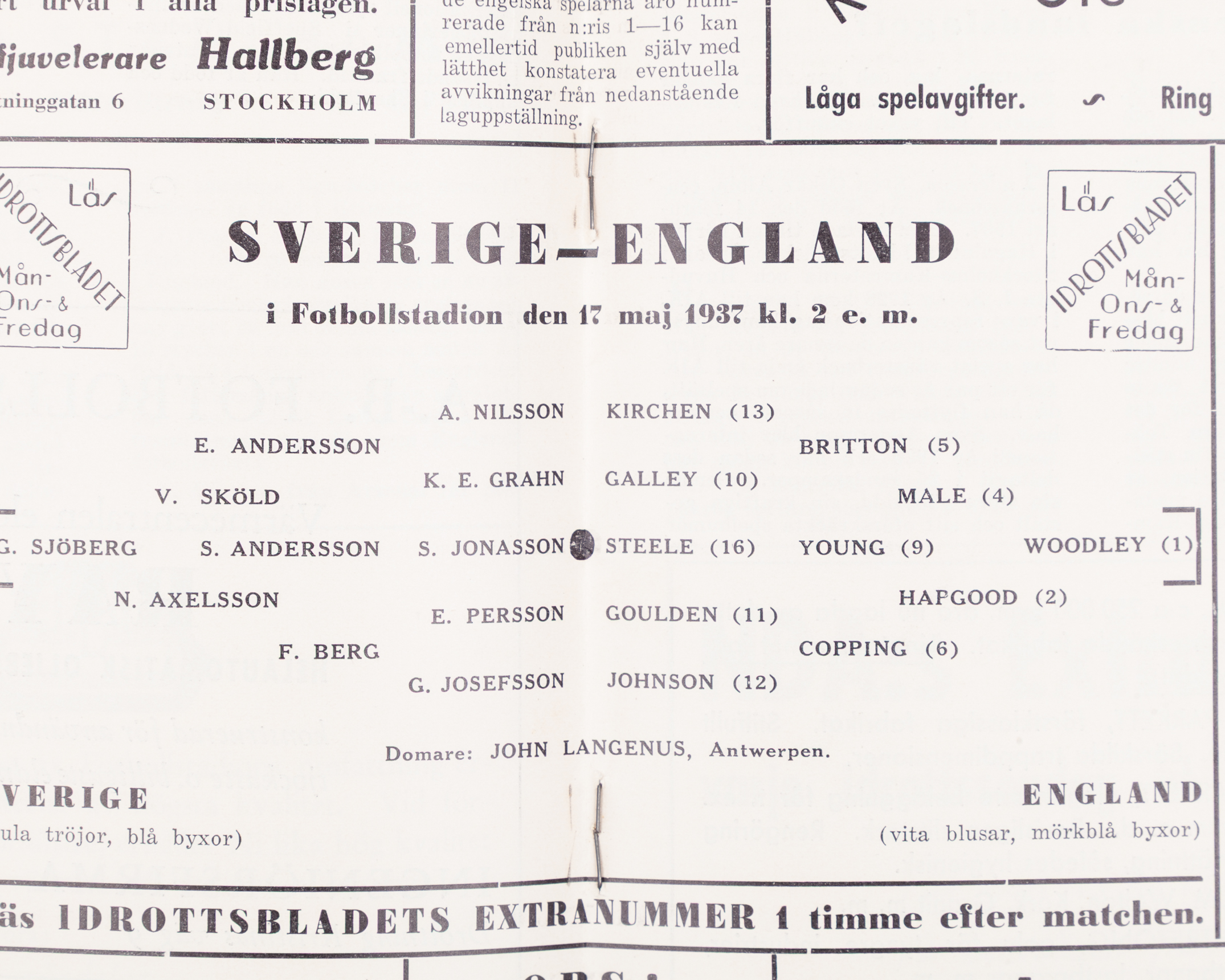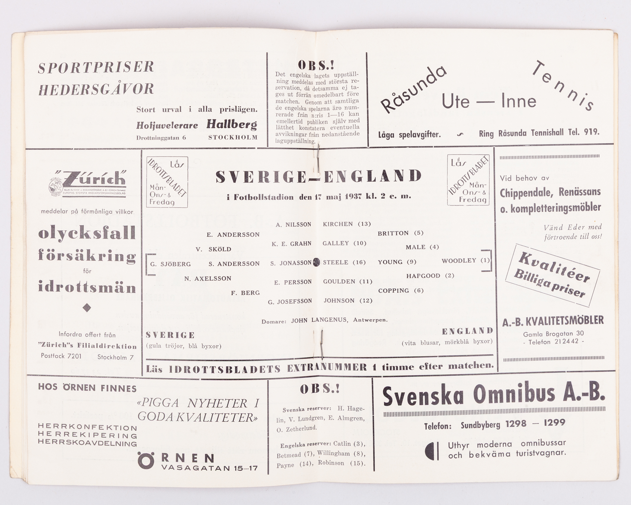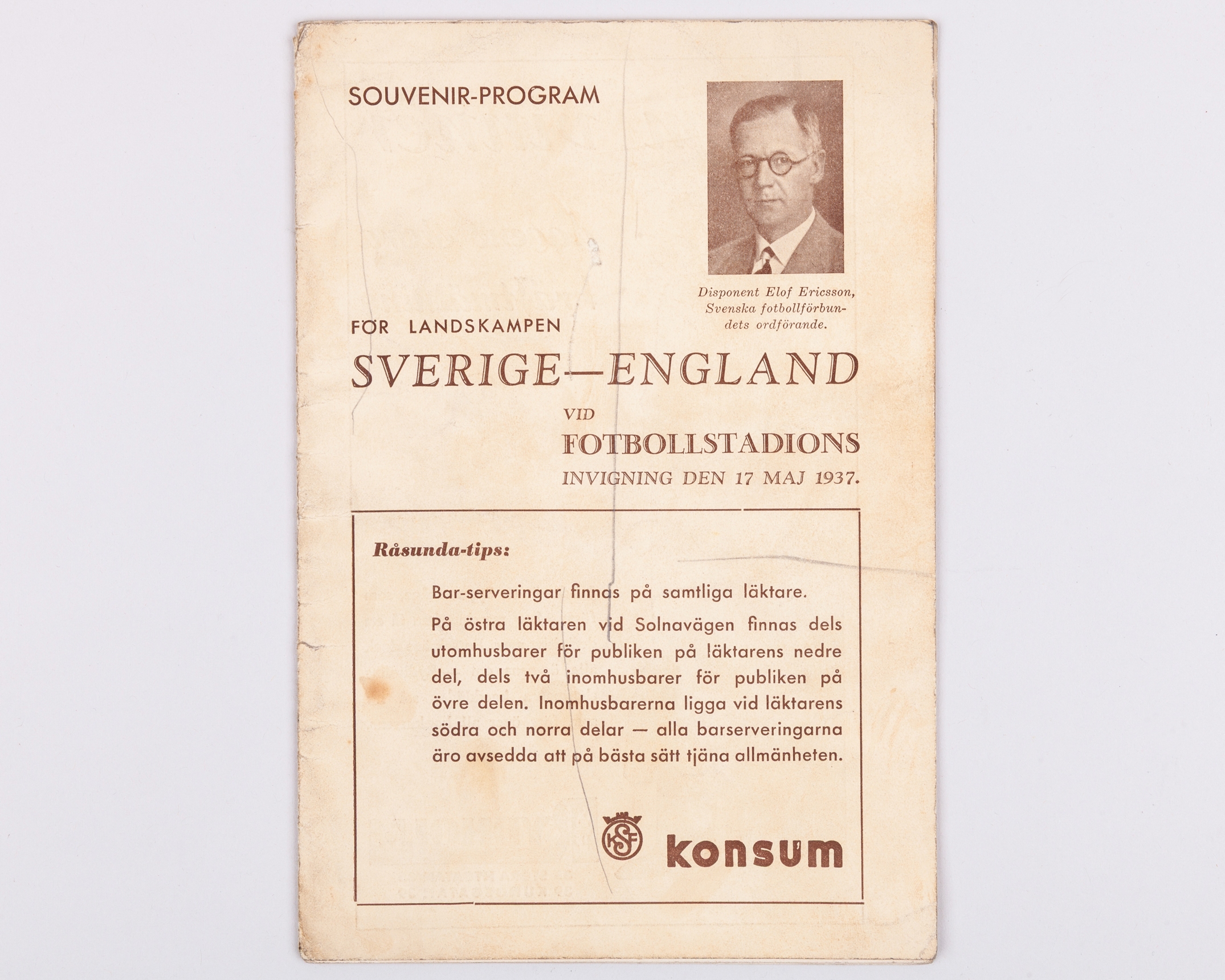Rare Sweden v England Tour match programme, 17th May 1937, match played in Stockholm, cover scored and stained