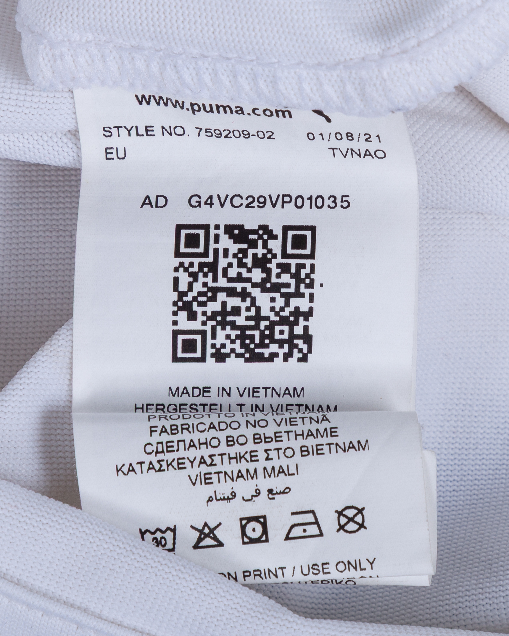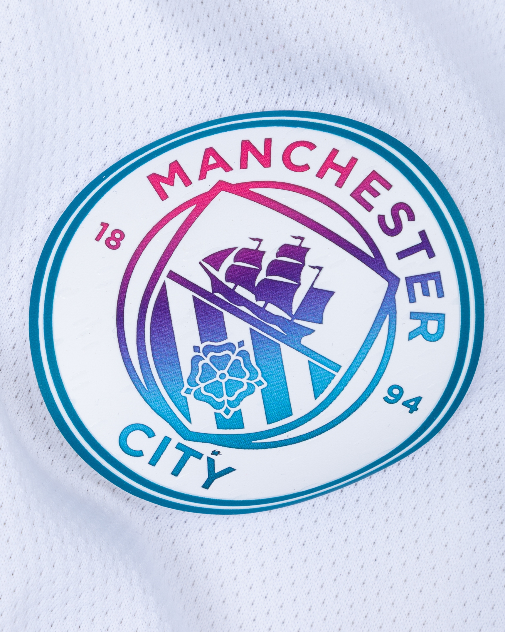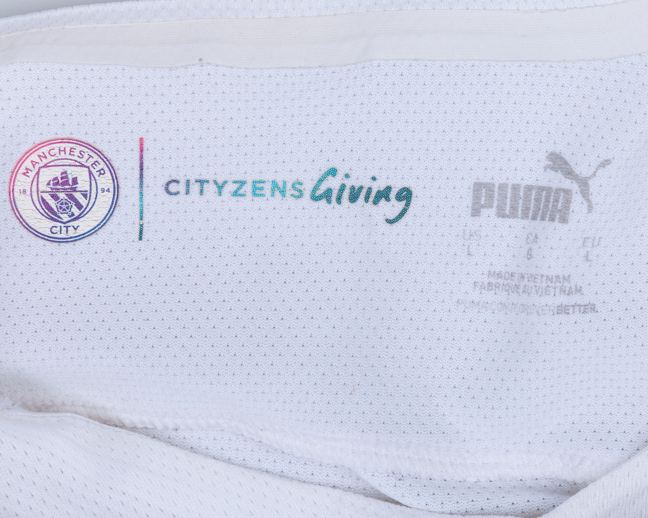 Jack Grealish white No.10 Manchester City v. Paris St Germaine Champions League match issued short-sleeved shirt, 2021-22, Puma, L, with v-neck collar and printed badge, the reverse lettered GREALISH, the right sleeve with Champions League and UEFA Foundation for Children flashes, some staining
