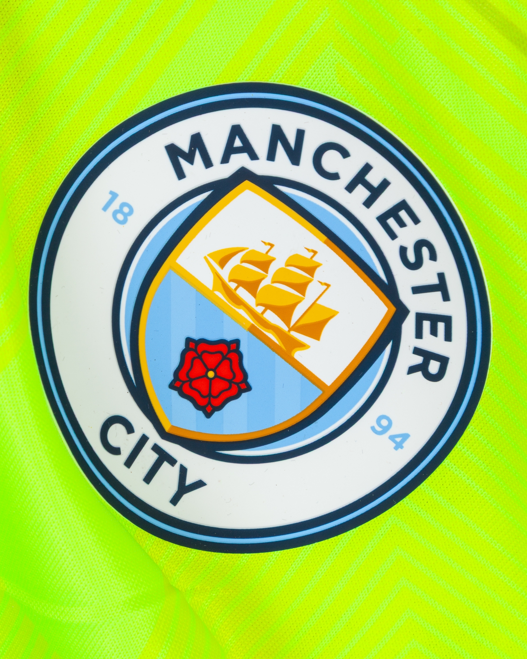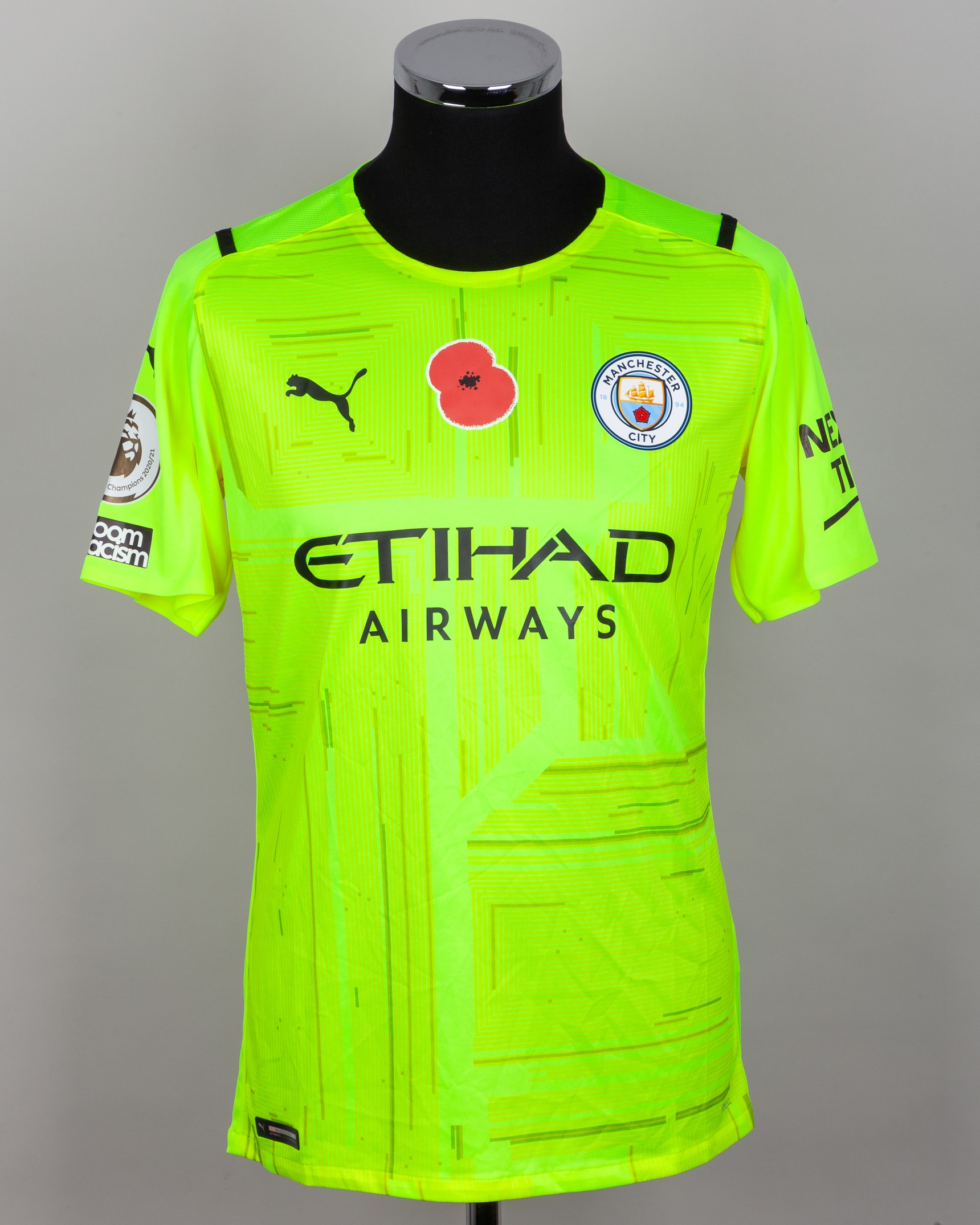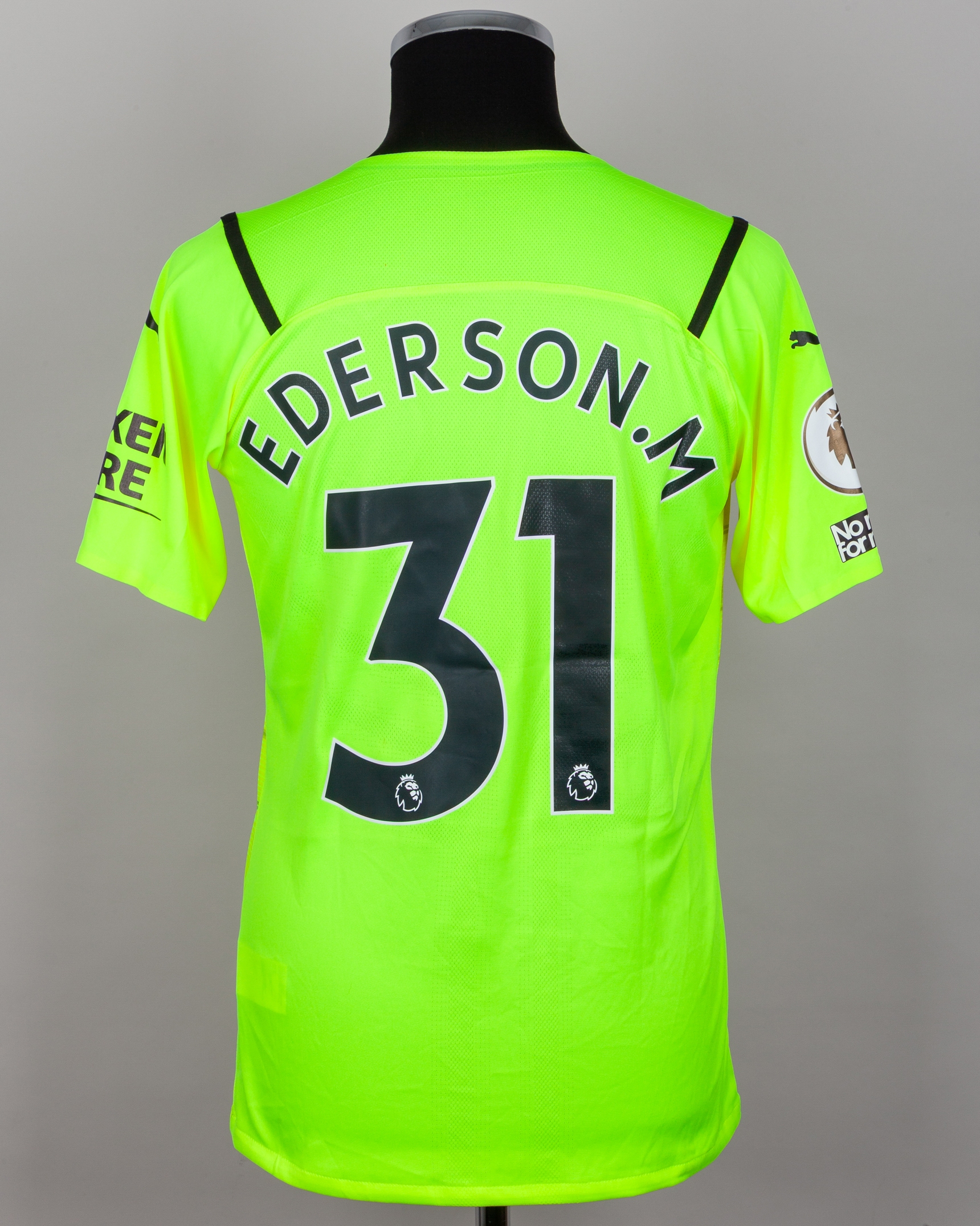 Ederson yellow No.31 Manchester City v. Manchester United match prepared short-sleeved shirt, 2021-22, Puma, L, with crew-neck collar and printed badge, with Poppy decal, the reverse lettered EDERSON. M, the right sleeve with Premier League Champions 2020-21 flash