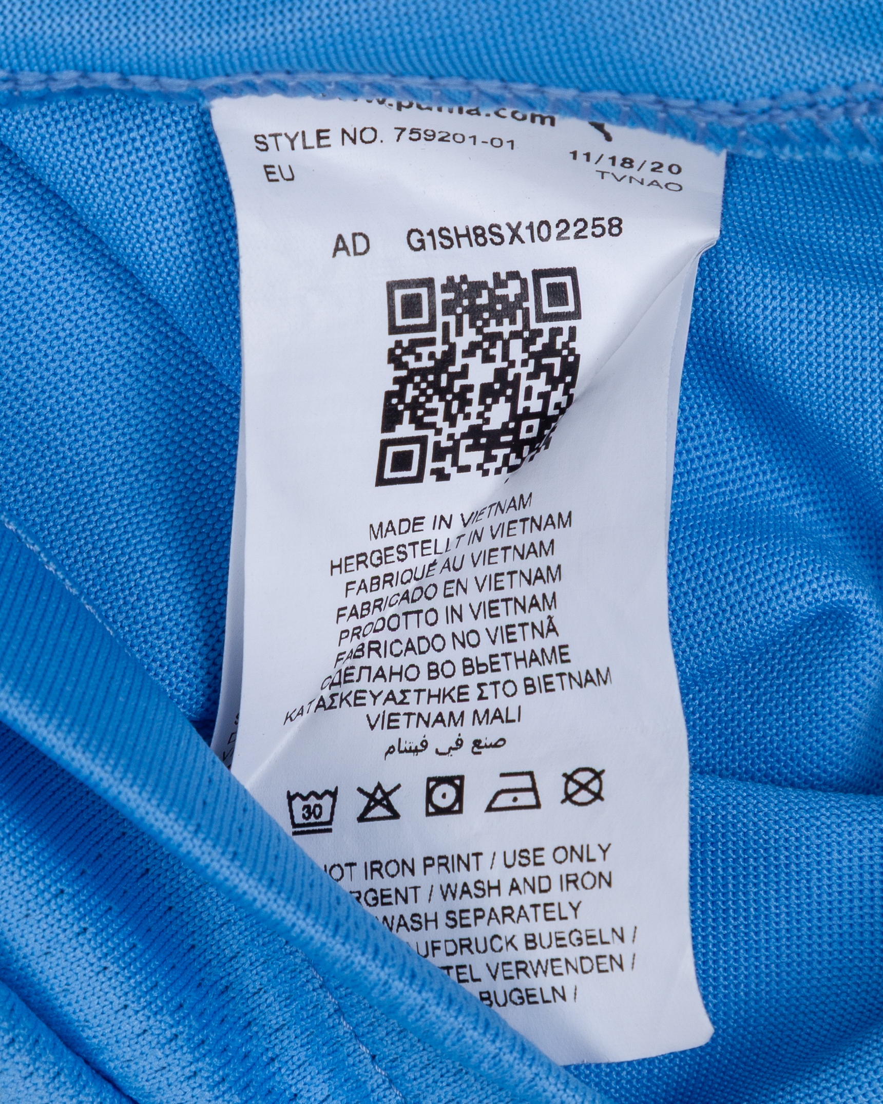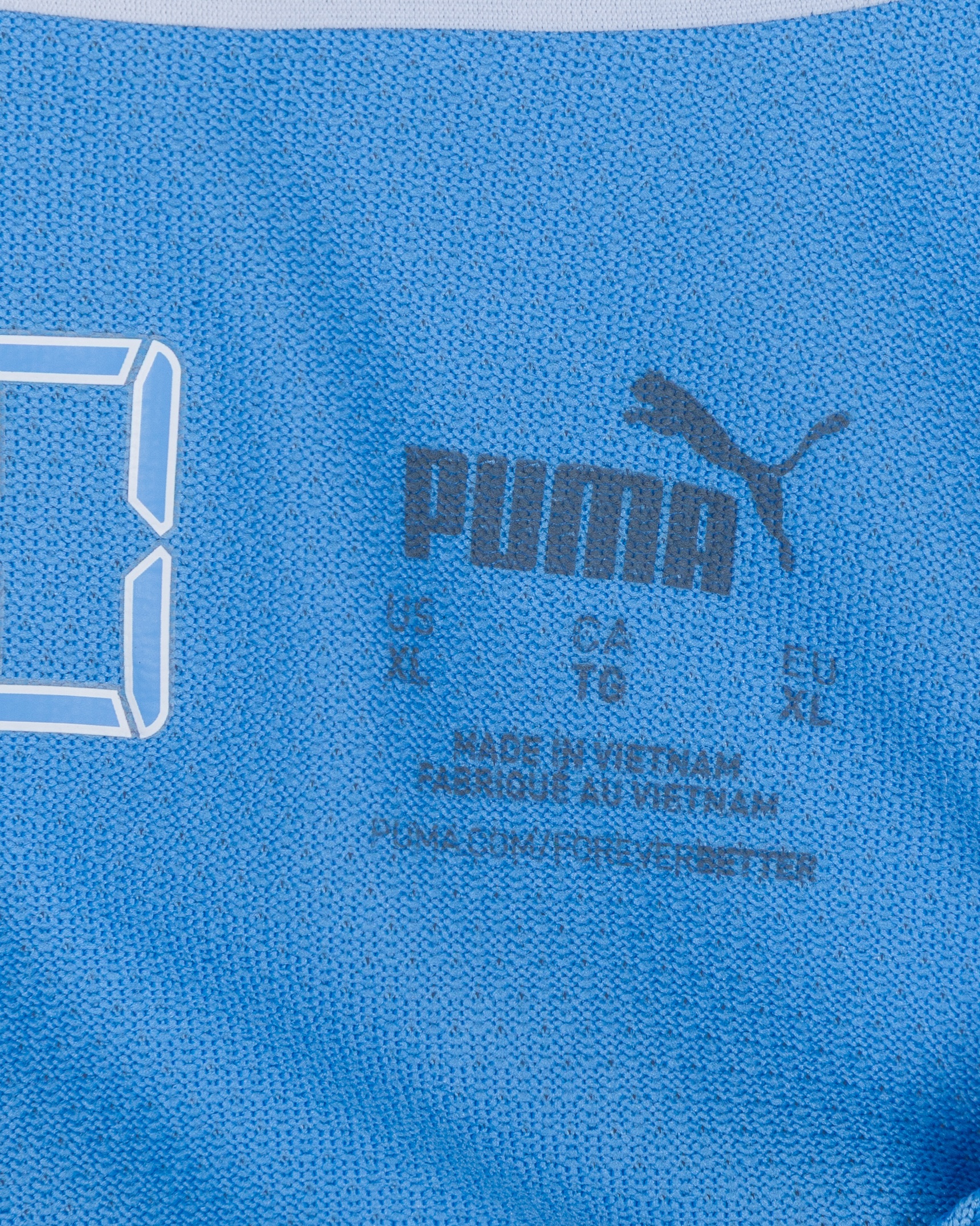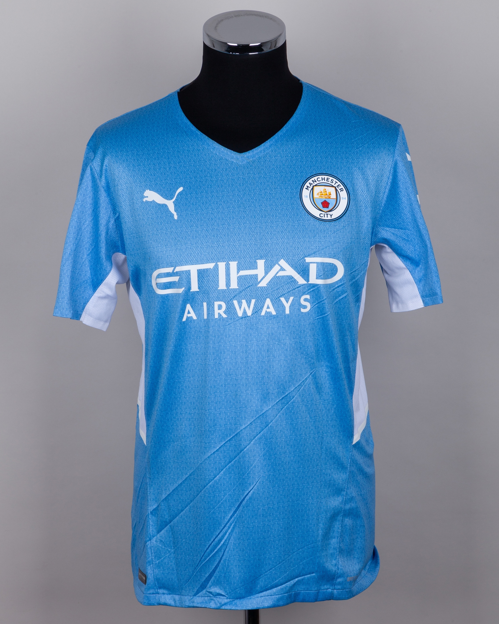 Rodrigo sky-blue No.16 Manchester City Champions League match issued short-sleeved shirt, 2021-22, Puma, XL, with v-neck collar and printed badge, the reverse lettered RODRIGO, the right sleeve with Champions League and UEFA Foundation for Children flashes