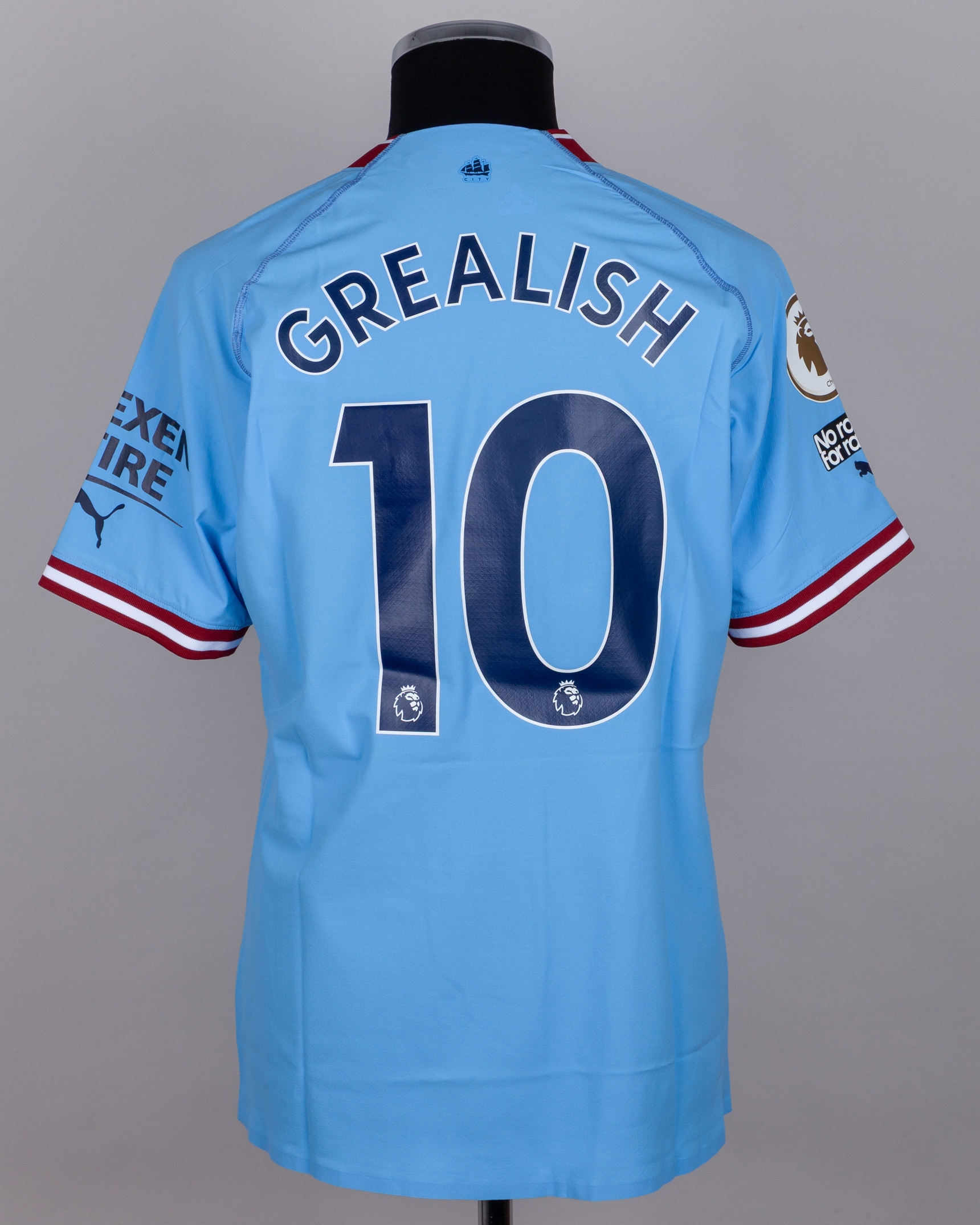 Jack Grealish blue No.10 Manchester City short-sleeved shirt, 2022-23, Puma, M, with crew-neck collar and printed badge, the reverse lettered GREALISH, the right sleeve with Premier League Champions 2021/22 flash