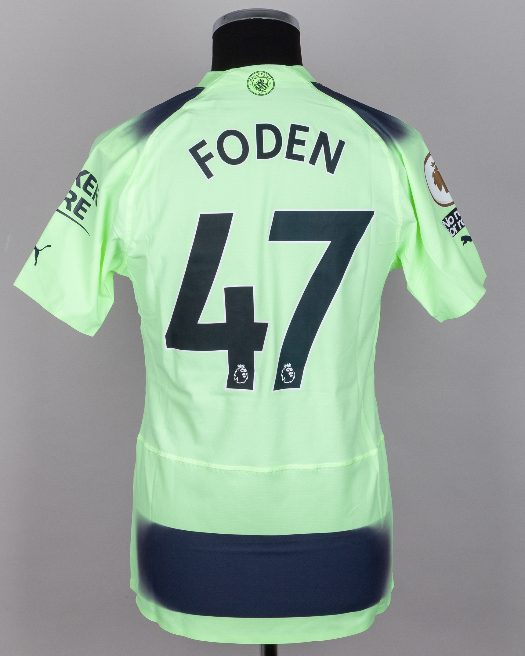 Phil Foden yellow and black No.47 Manchester City short-sleeved shirt, 2022-23, Puma, S, with crew-neck collar and printed badge, the reverse lettered FODEN, the right sleeve with Premier League Champions 2022/23 flash