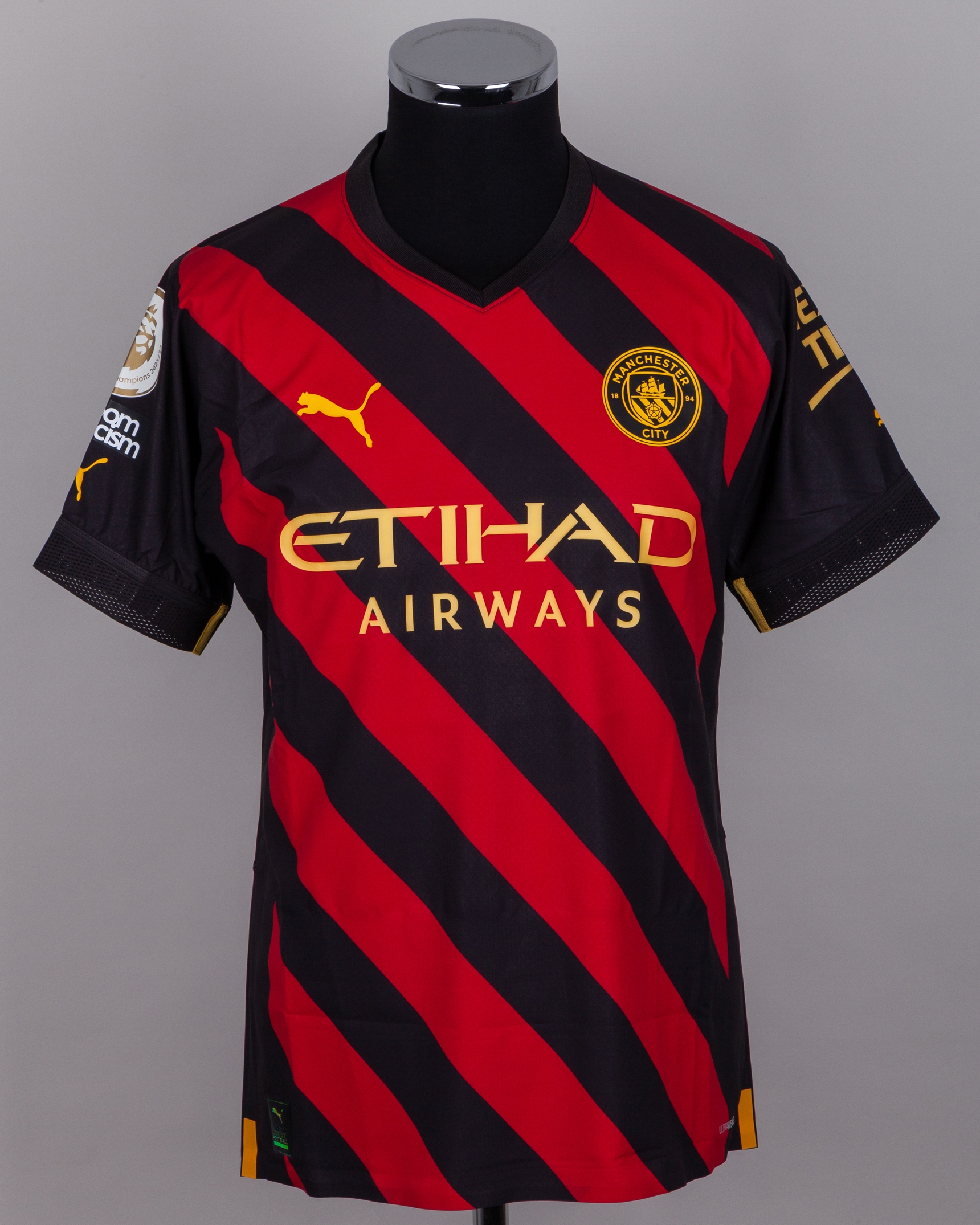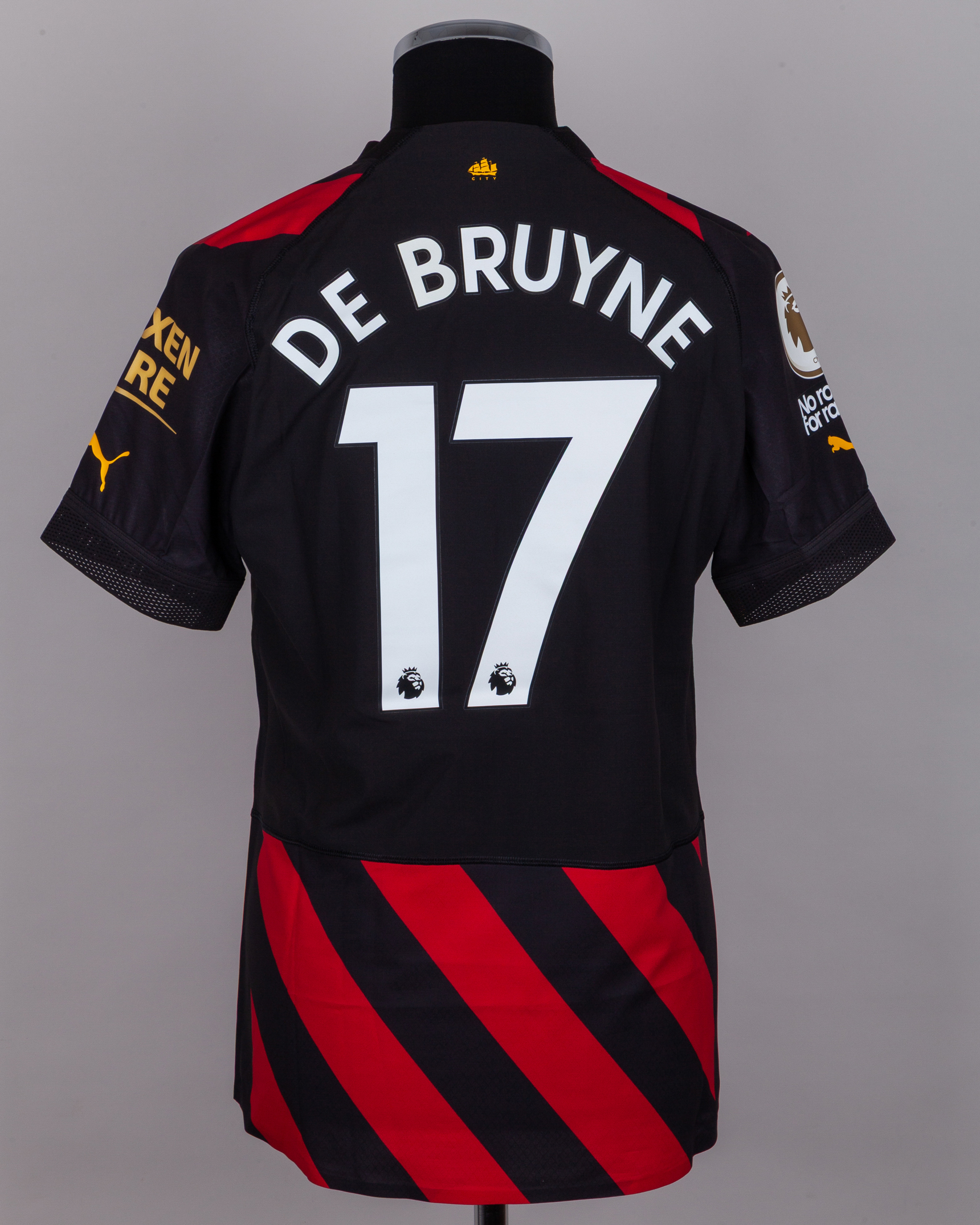 Kevin De Bruyne black and red No.17 Manchester City short-sleeved shirt, 2022-23, Puma, M, with v-neck collar and printed badge, the reverse lettered DE BRUYNE, the right sleeve with Premier League Champions 2021/22 flash