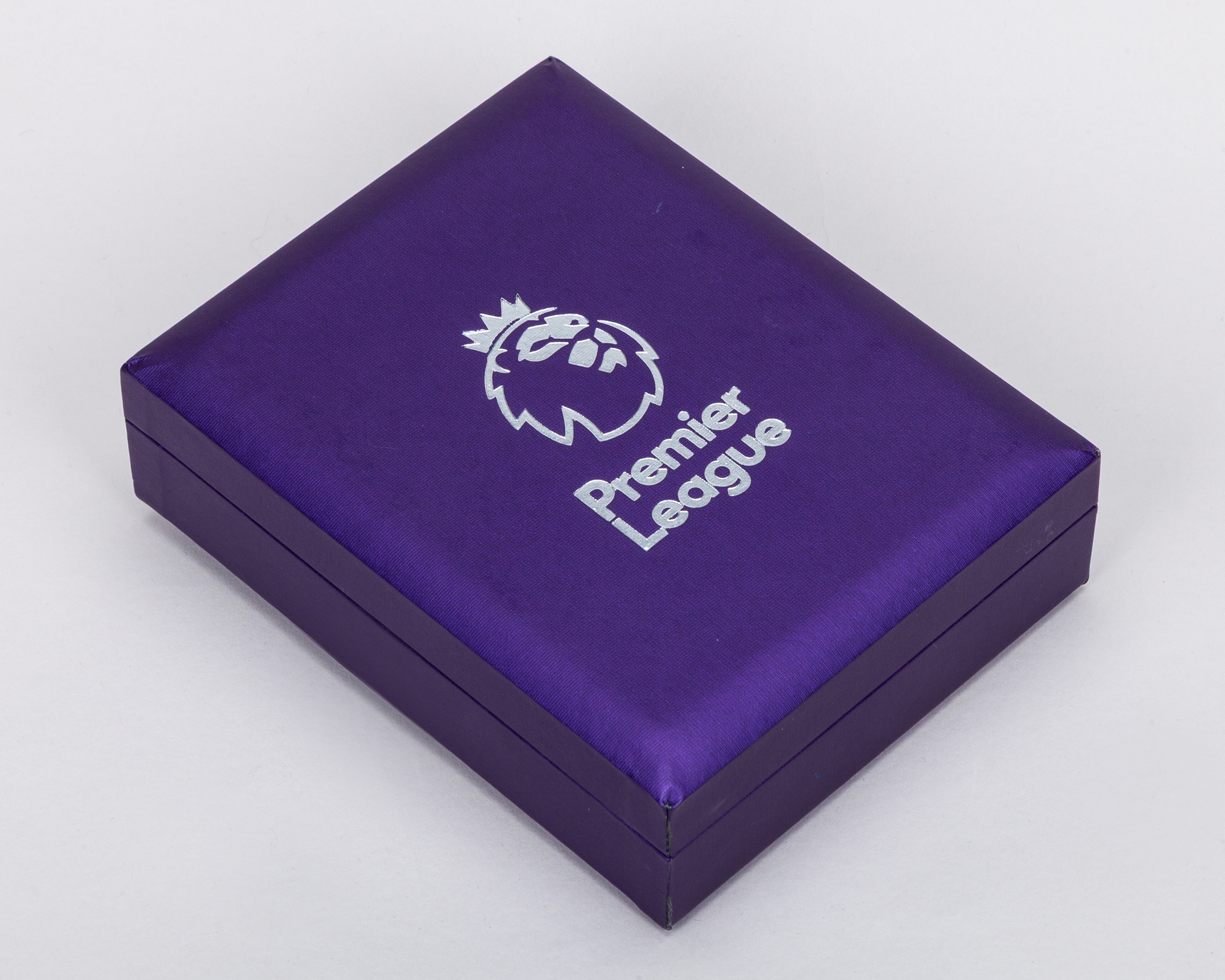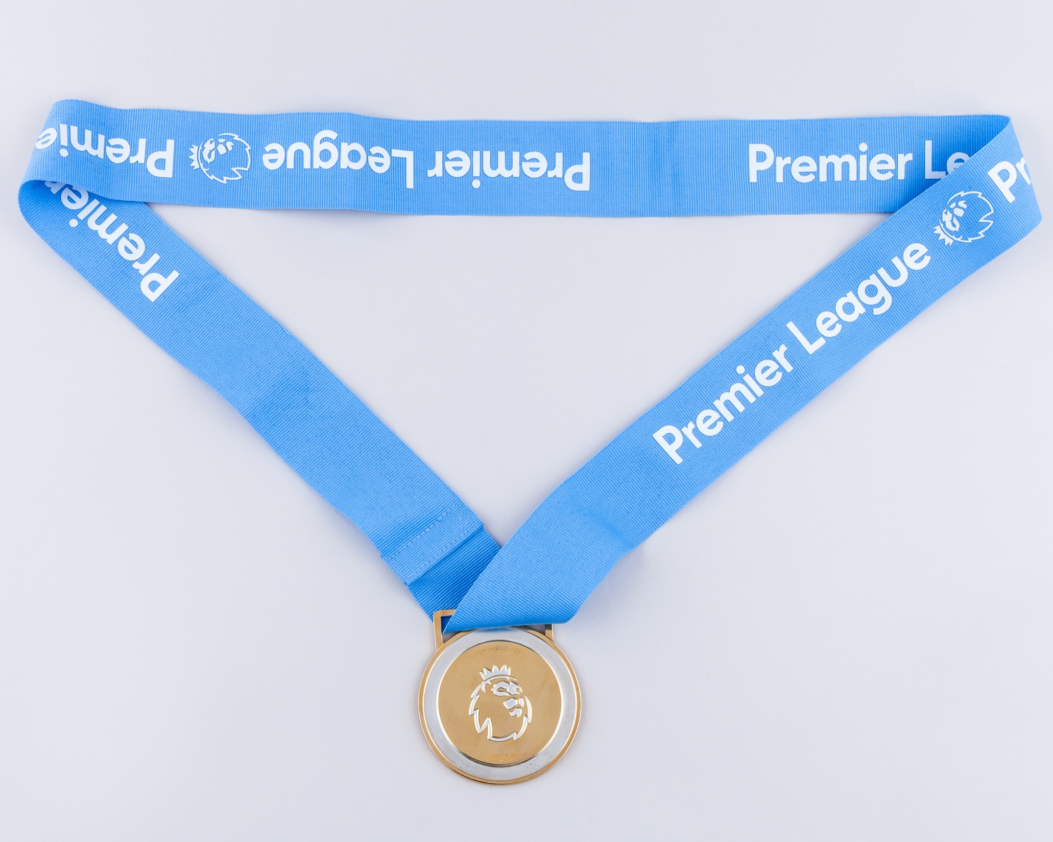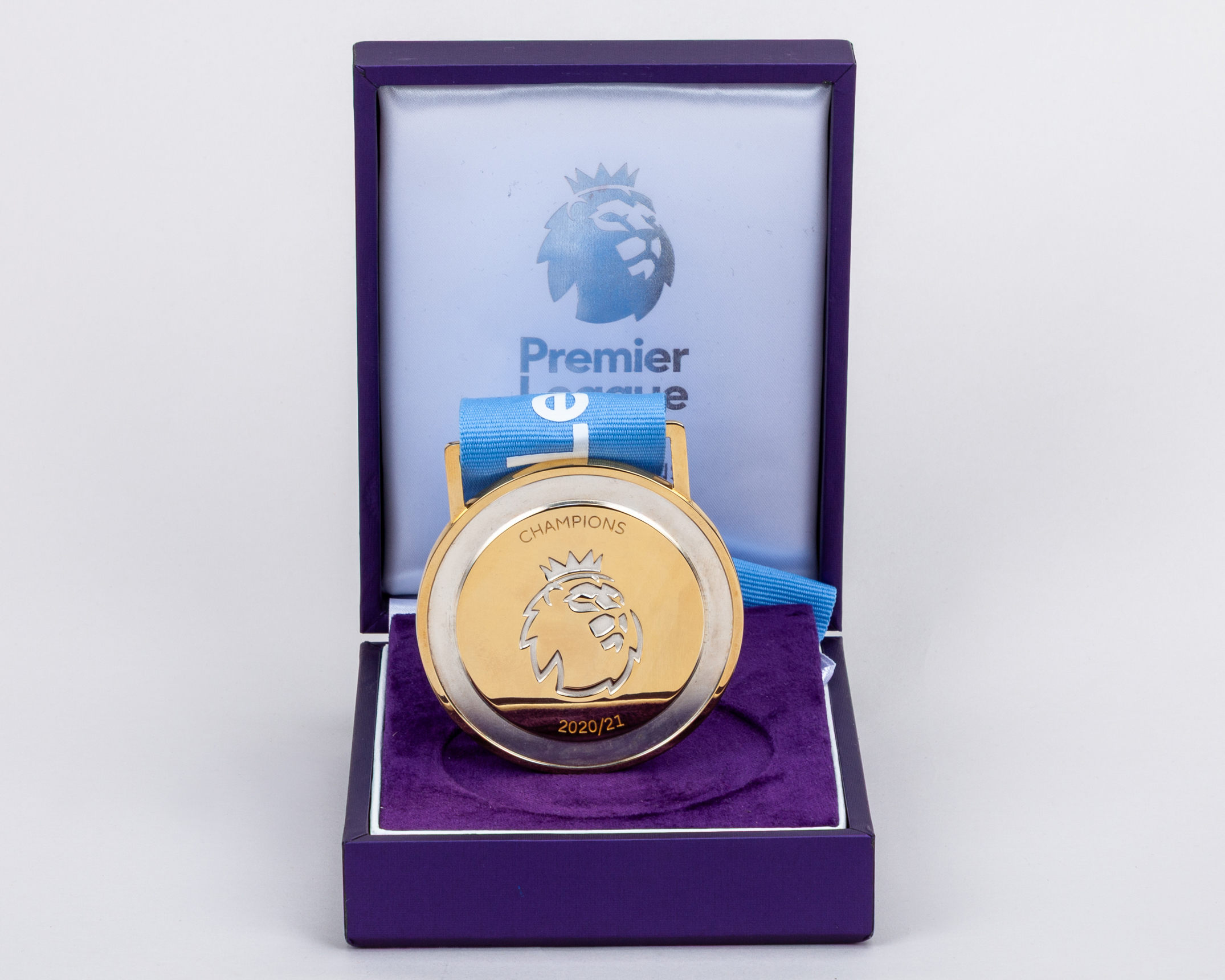 Gold-plated Manchester City Premier League Champions medal, 2020-21, inscribed CHAMPIONS 2020/21, the reverse inscribed PREMIER LEAGUE CHAMPIONS, with city blue ribbon and bespoke case