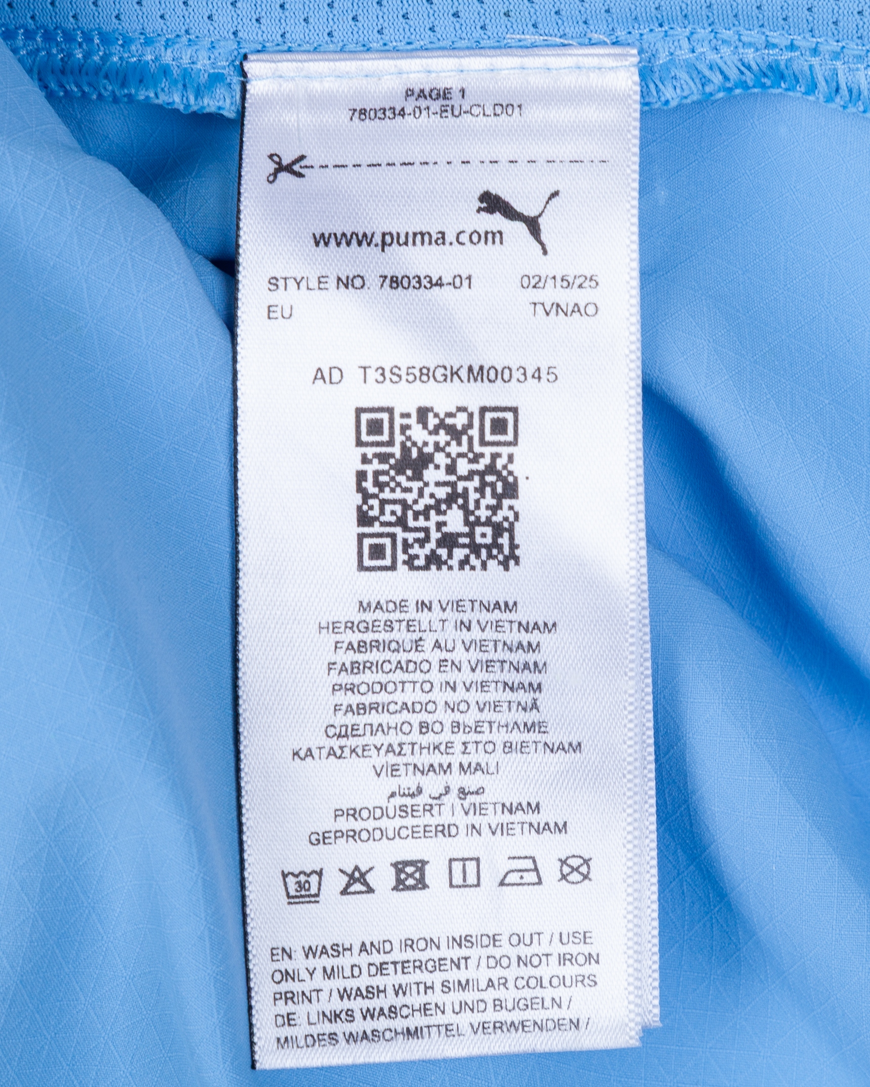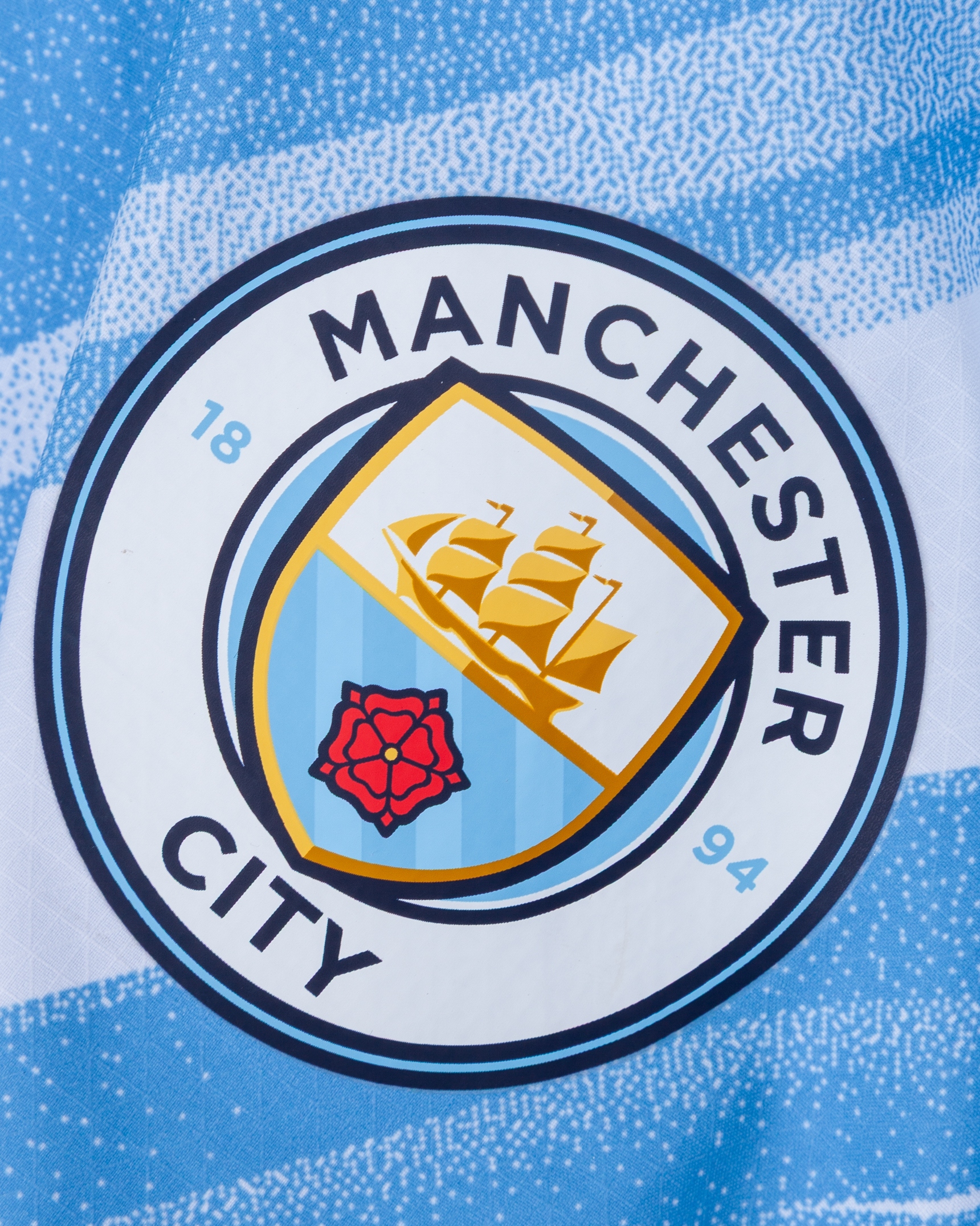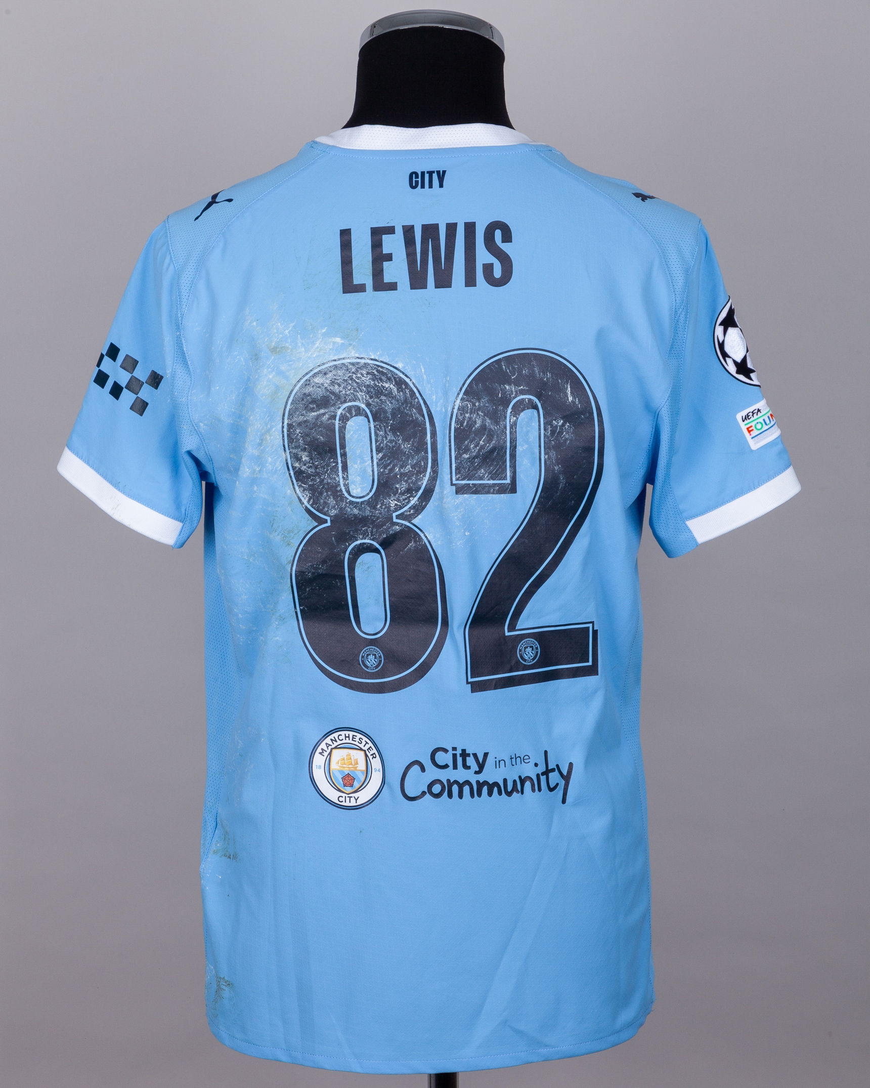 Rico Lewis blue and white No.82 Manchester City v. Napoli match worn short-sleeved shirt, 2025, Puma, M, with crew-neck collar and printed badge, the reverse lettered LEWIS, the right sleeve with Champions League and UEFA foundation flashes, with pitch staining