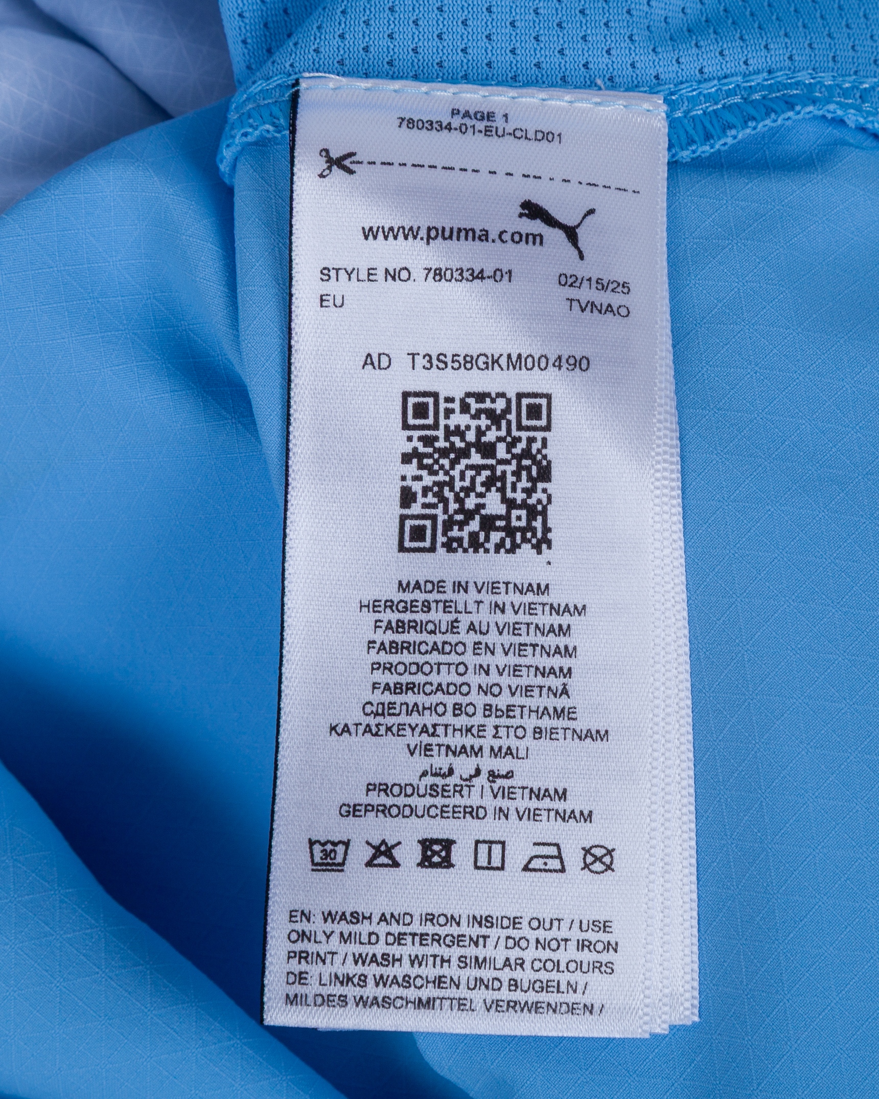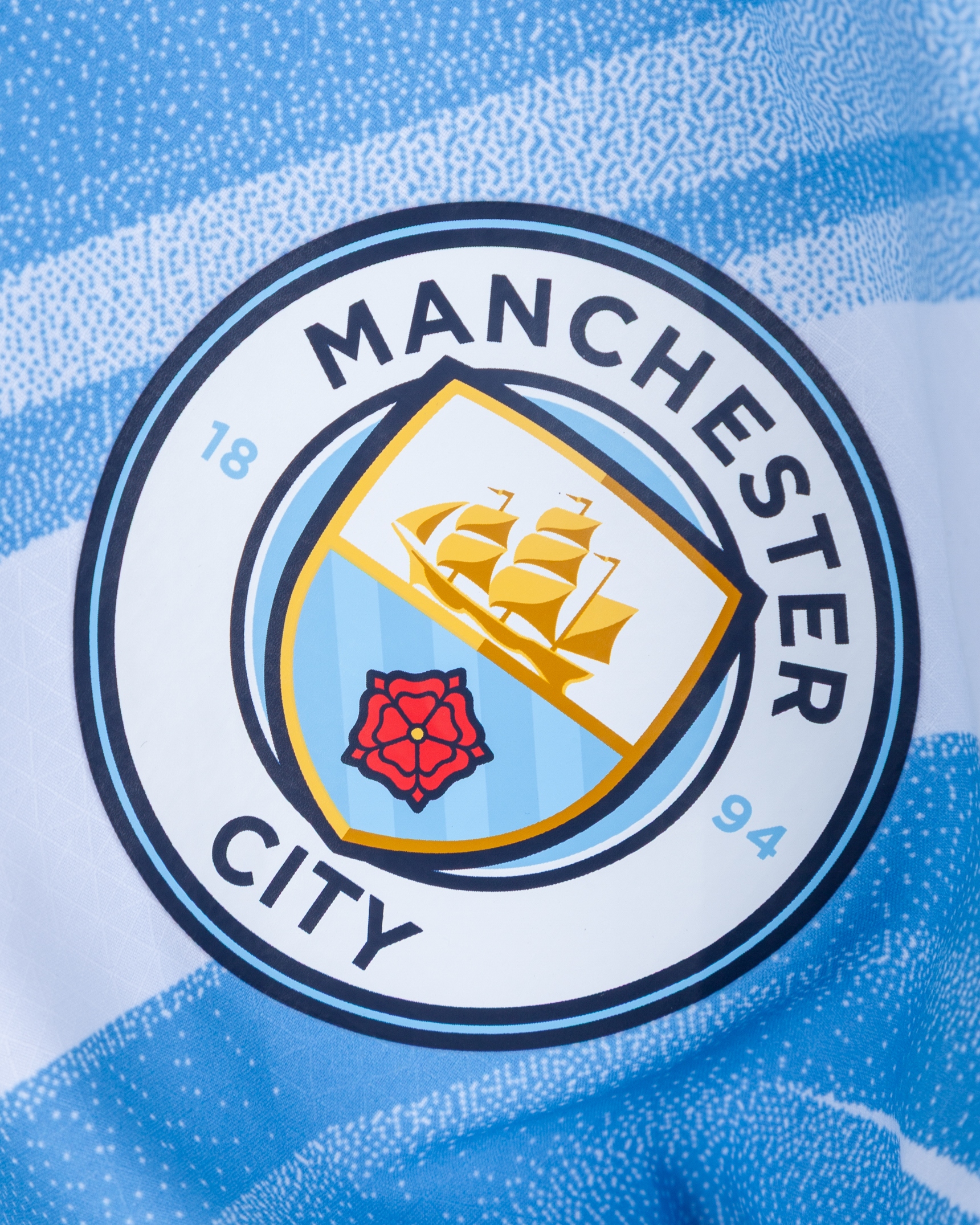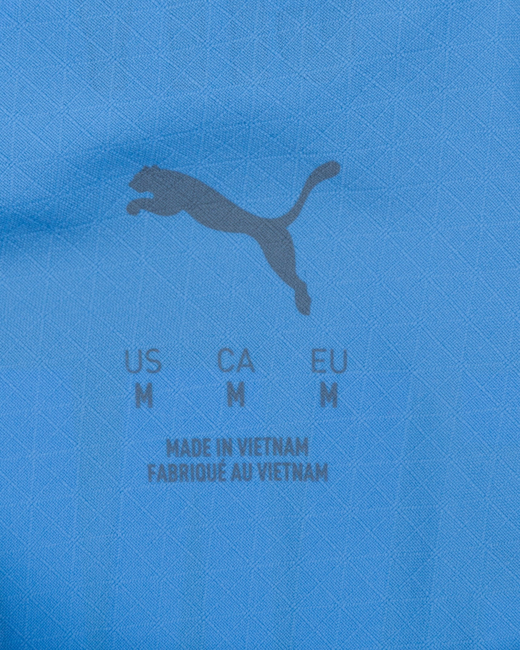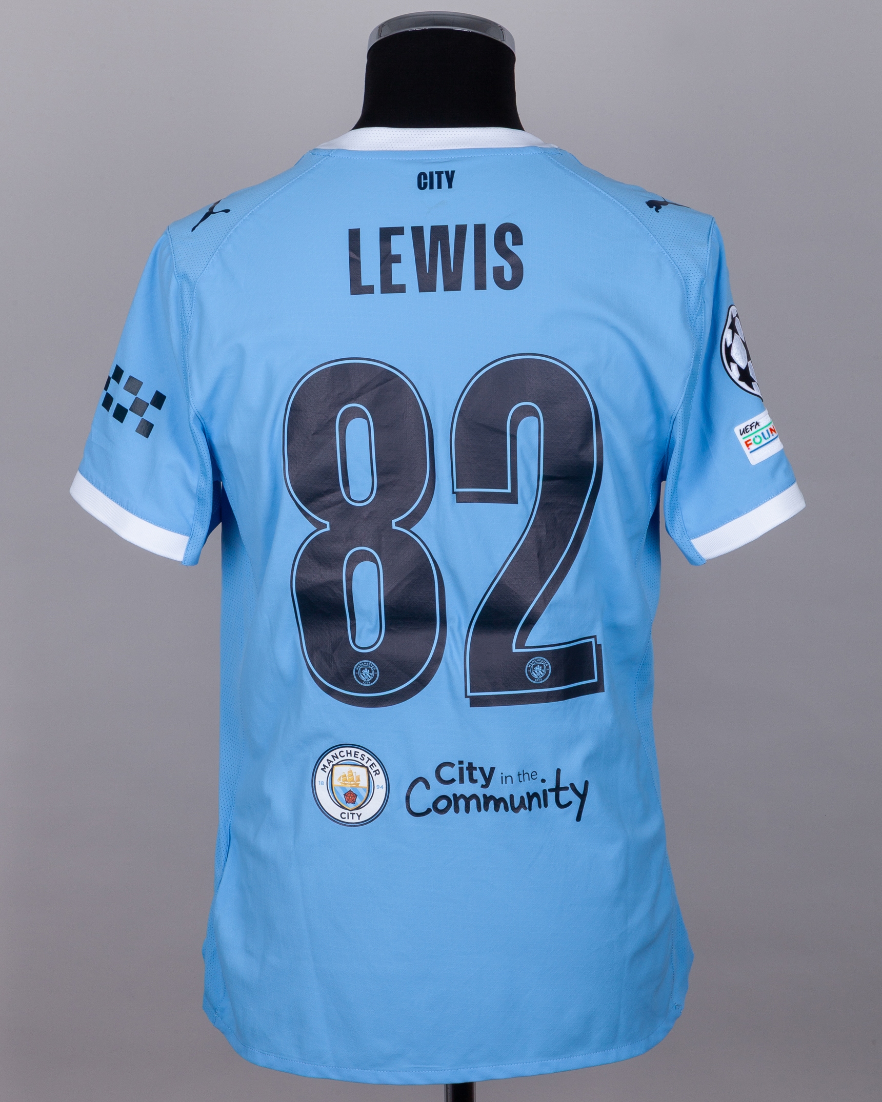 Rico Lewis blue and white No.82 Manchester City v. Napoli short-sleeved shirt, 2025, Puma, M, with crew-neck collar and printed badge, the reverse lettered LEWIS, the right sleeve with Champions League and UEFA foundation flashes