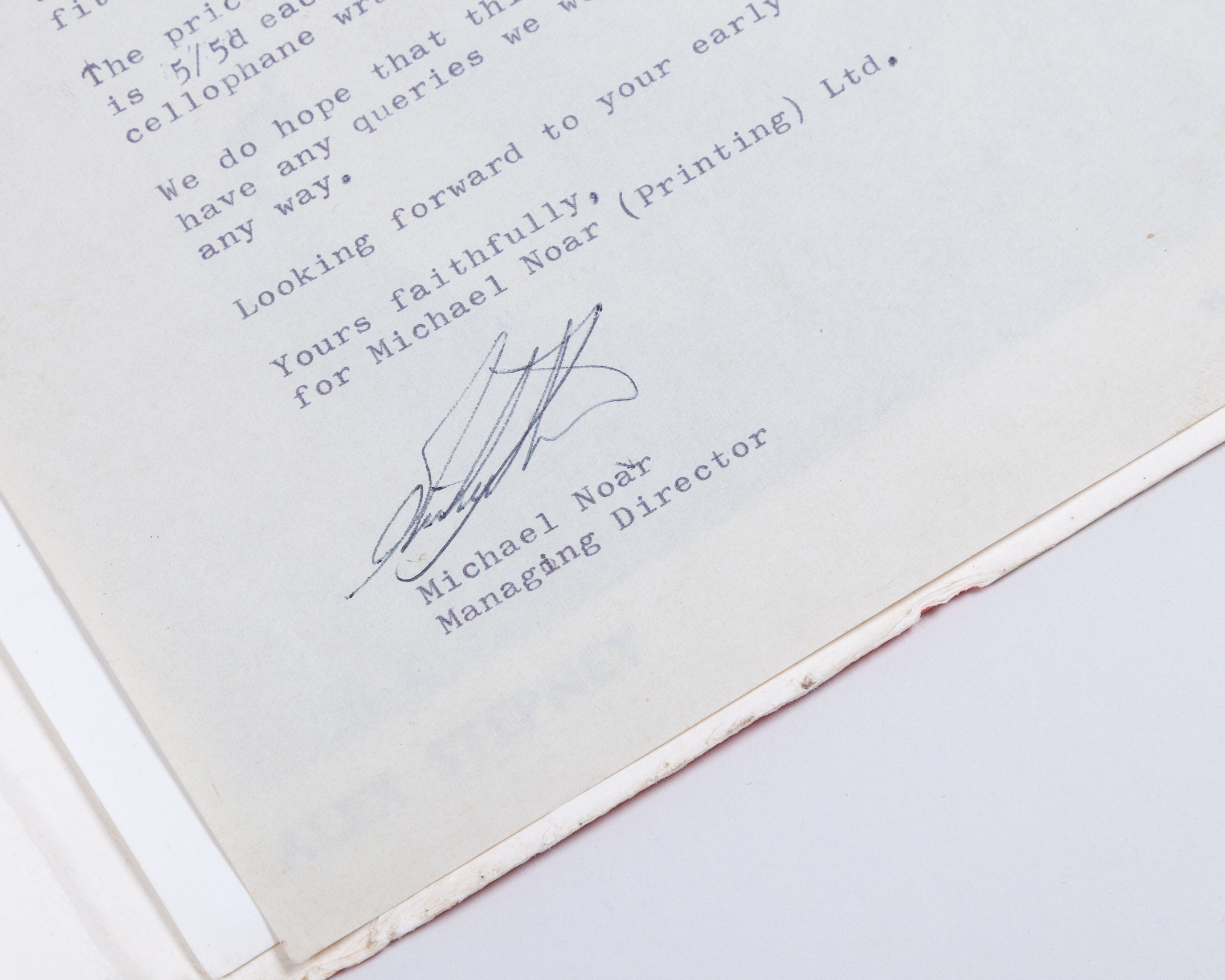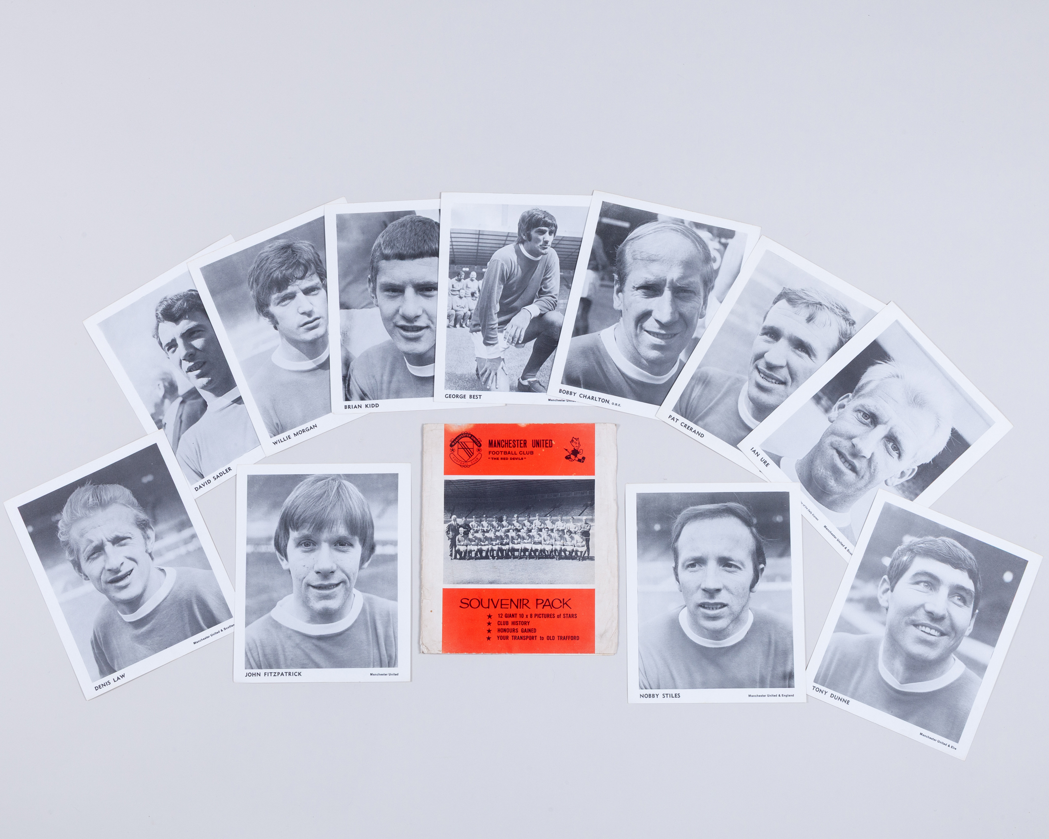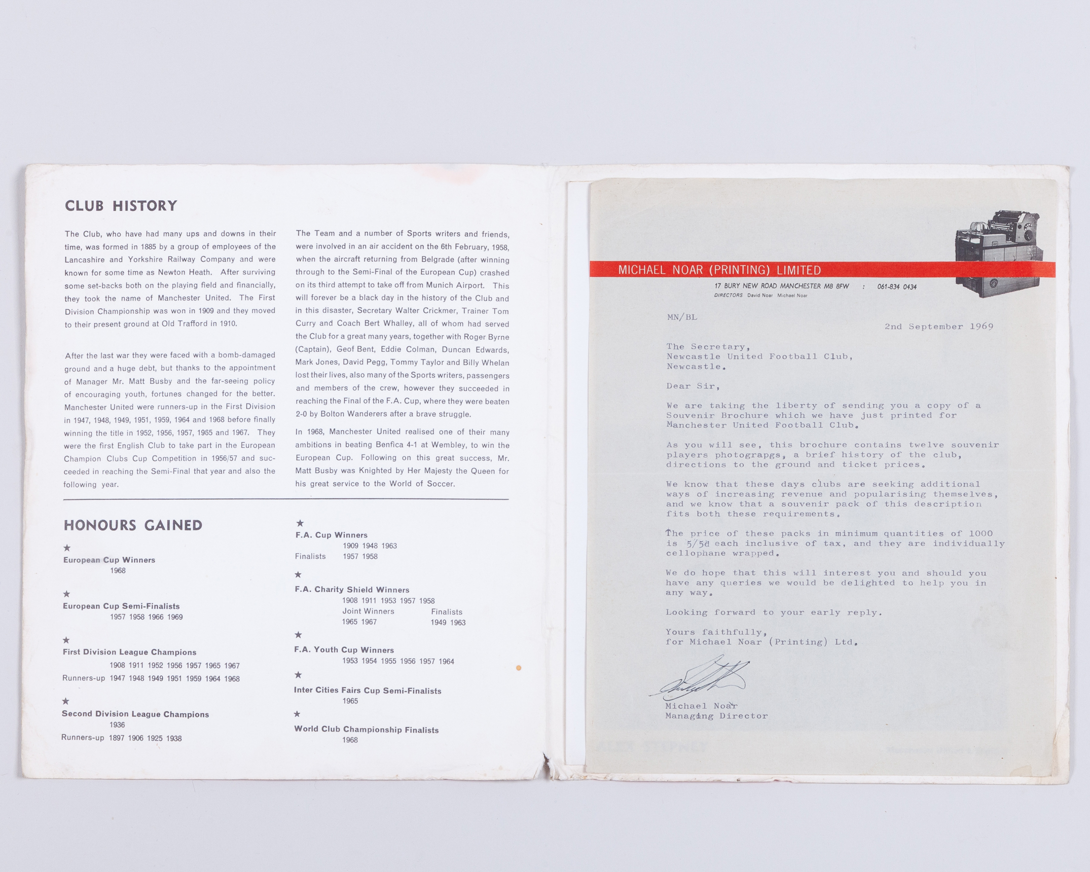 Rare Manchester United Souvenir Pack, 1969, the pack containing twelve player photos, with letter to Newcastle United from the Michael Noar Printing Ltd asking Newcastle if they would like a similar brochure