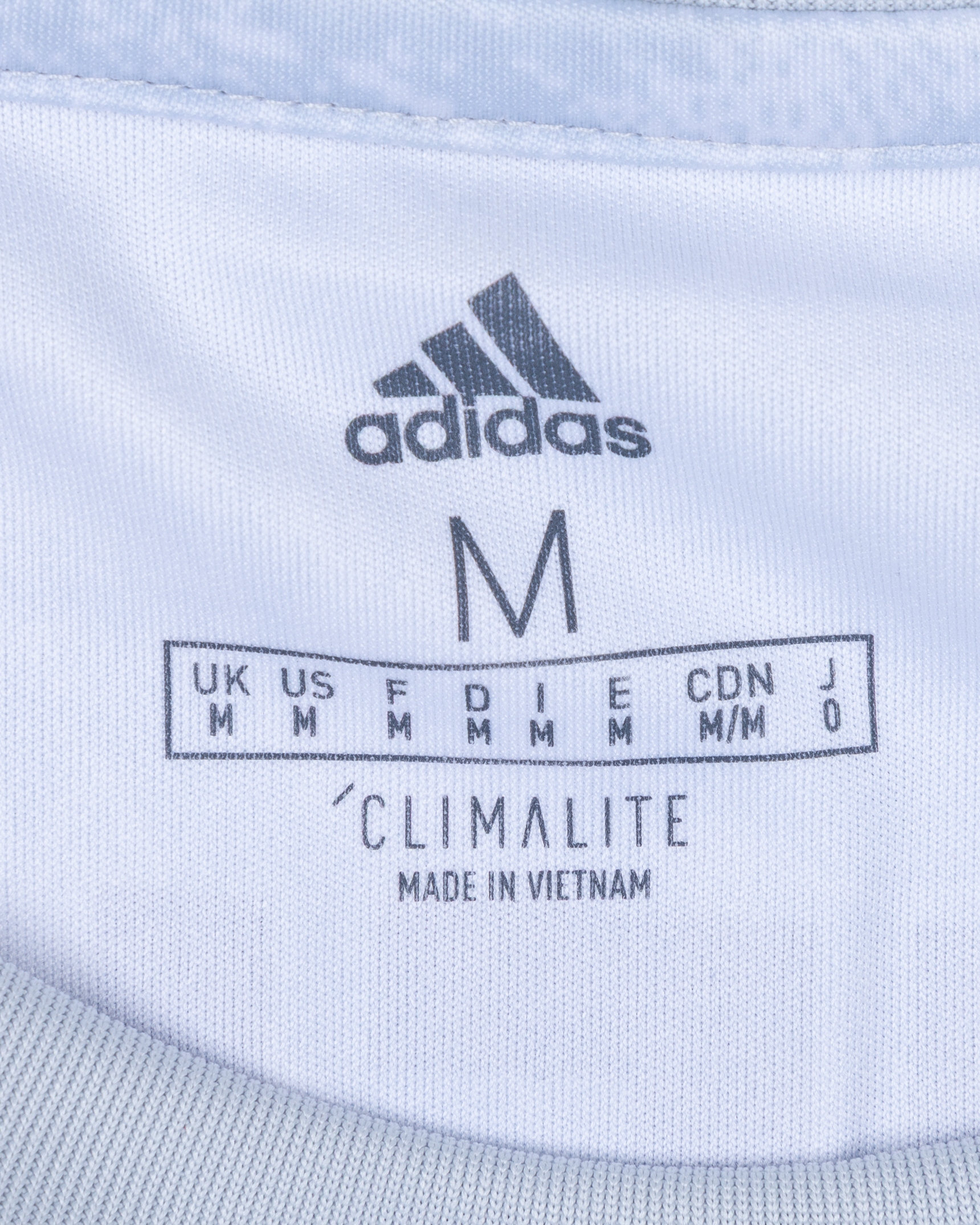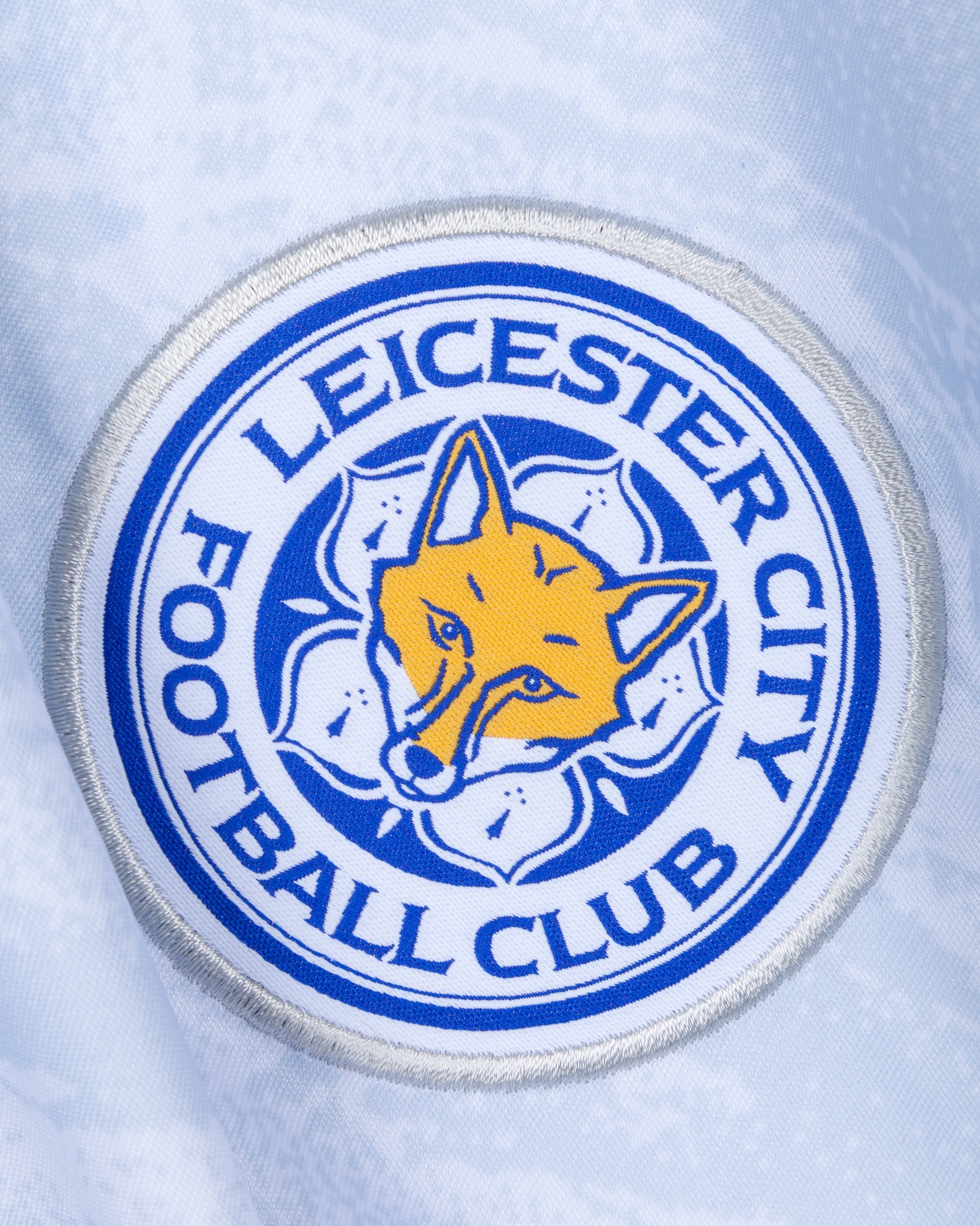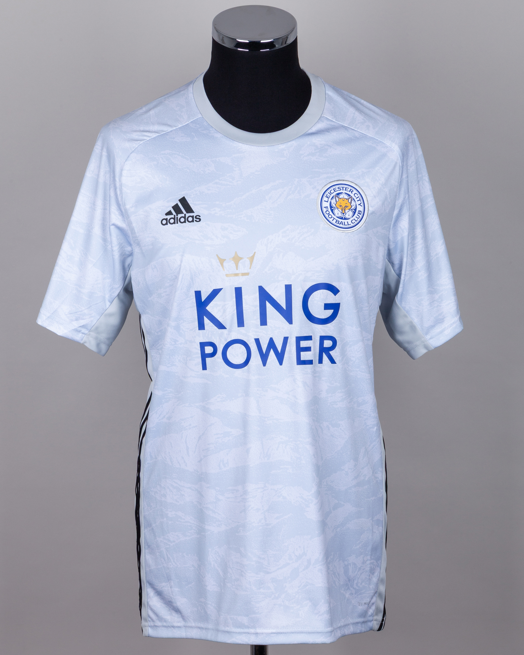 Kasper Schmeichel white and grey No.1 Leicester City v. Manchester United goalkeeper shirt, 2019, Adidas, M, with crew-neck collar and embroidered cloth badge inscribed LEICESTER CITY FOOTBALL CLUB, the reverse lettered SCHMEICHEL, the right sleeve with Premier League flash