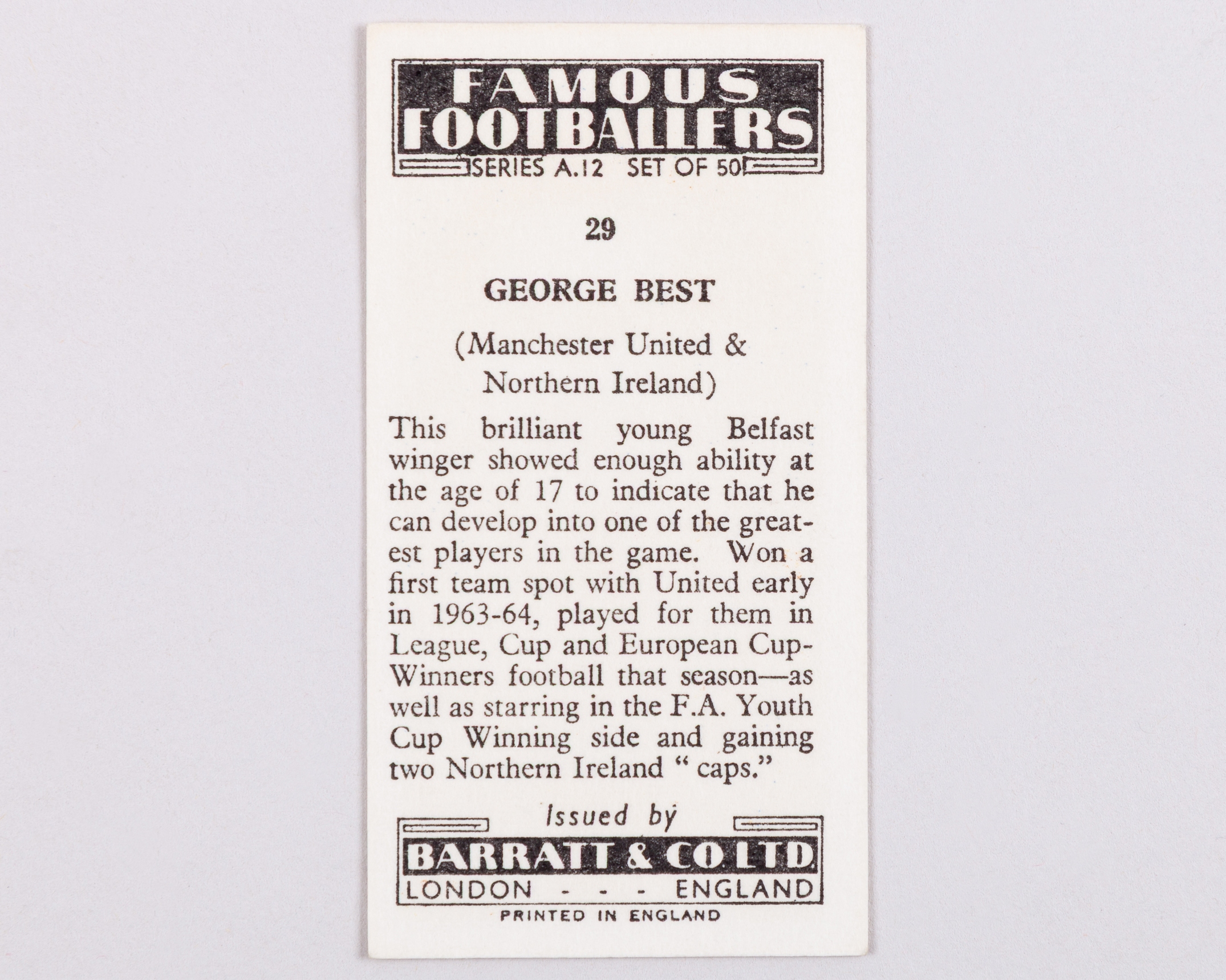 Extremely rare George Best 1964 Famous Footballers Card, No.29, by Barratt and Co