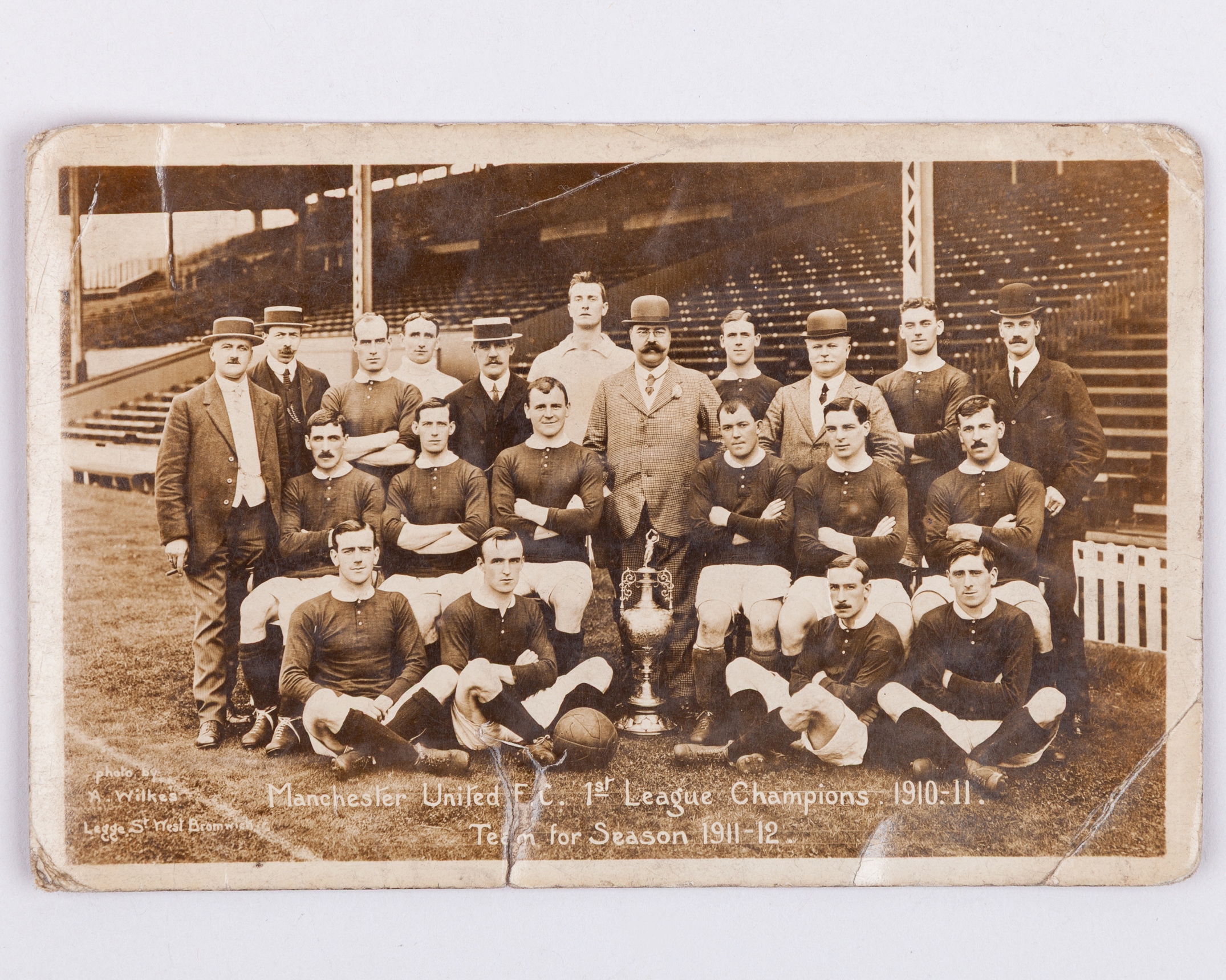 1910-11 Manchester United team line-up postcard, Manchester United FC 1st League Champions 1910-11, Team for season 1911-12, trophy shown with the team