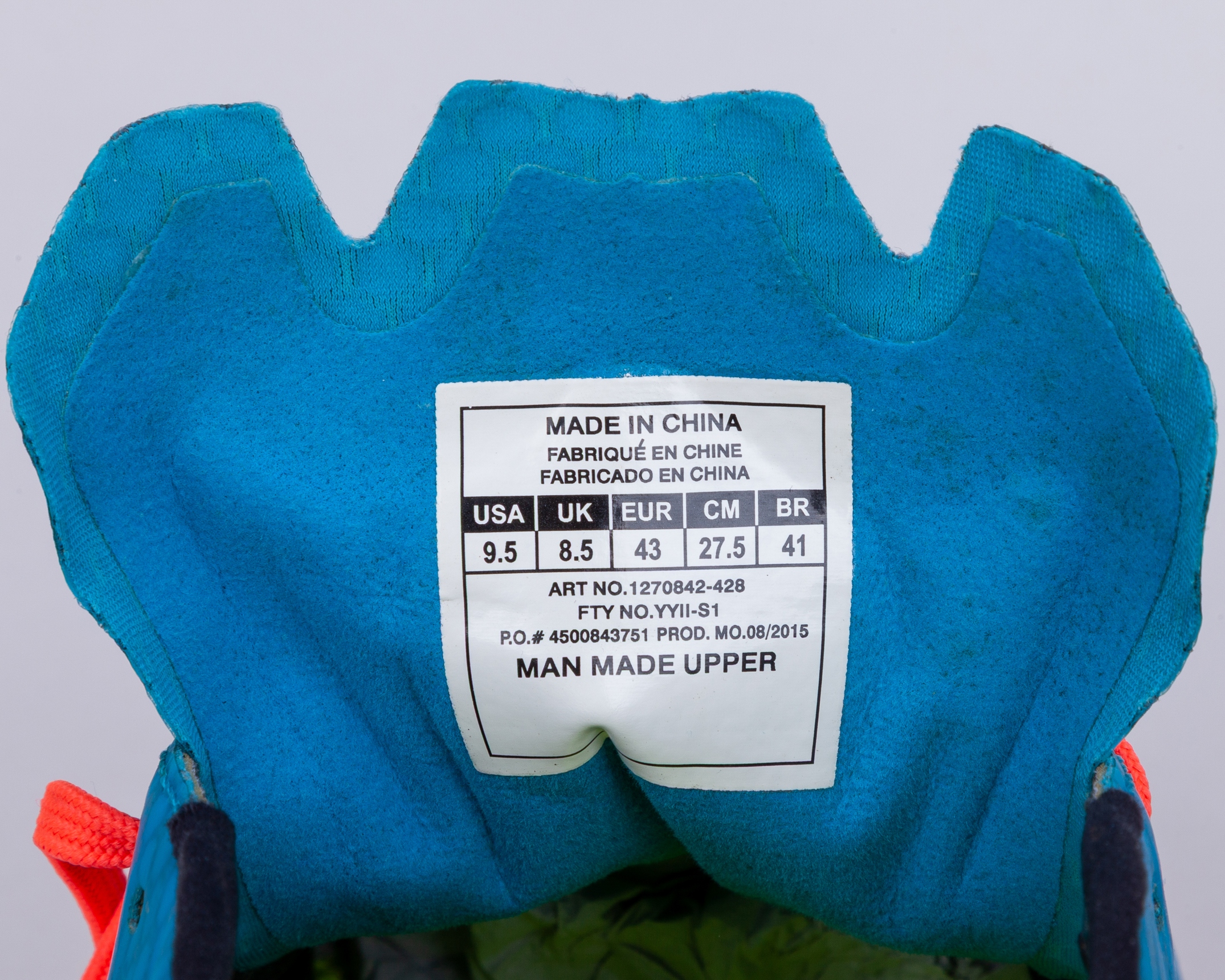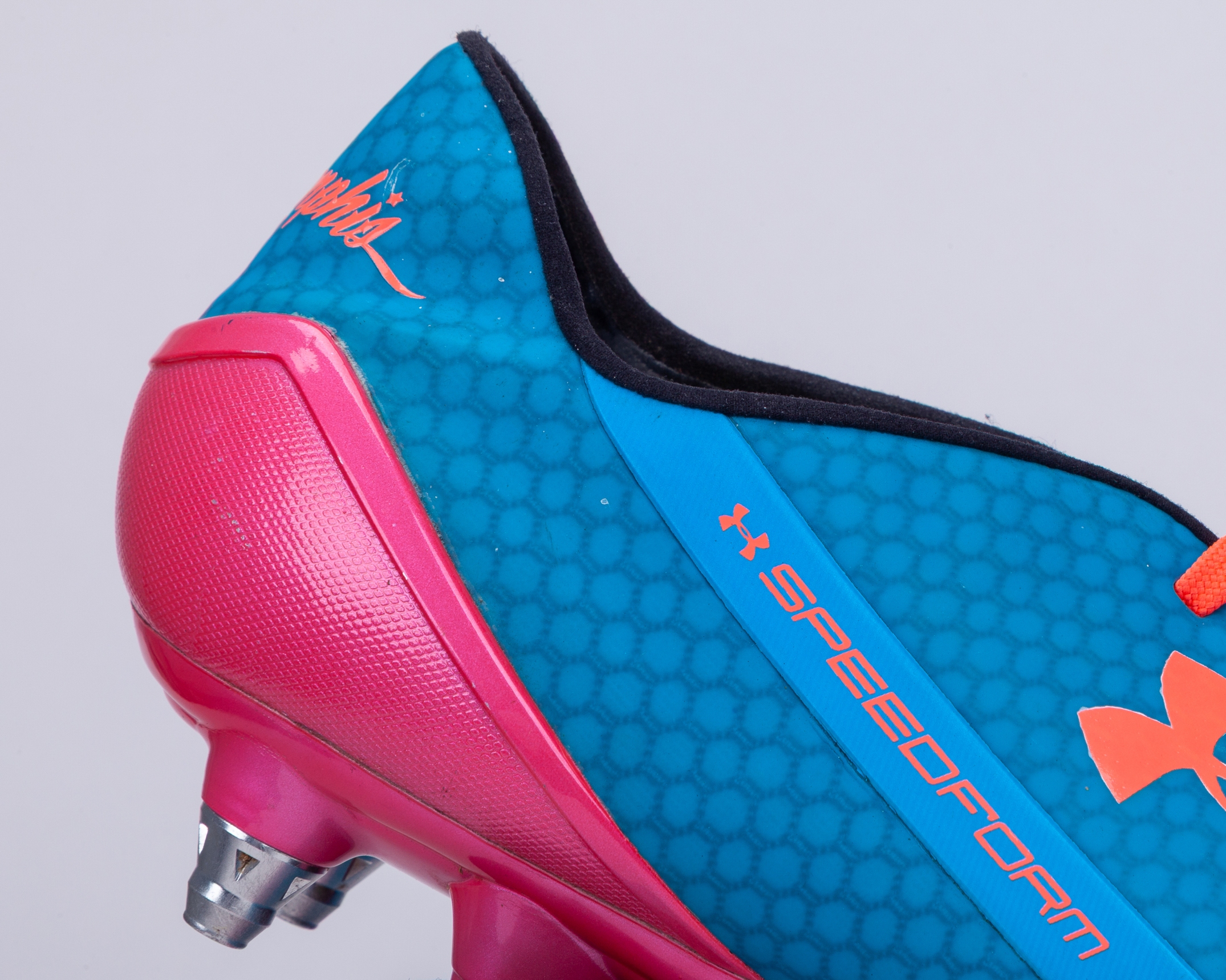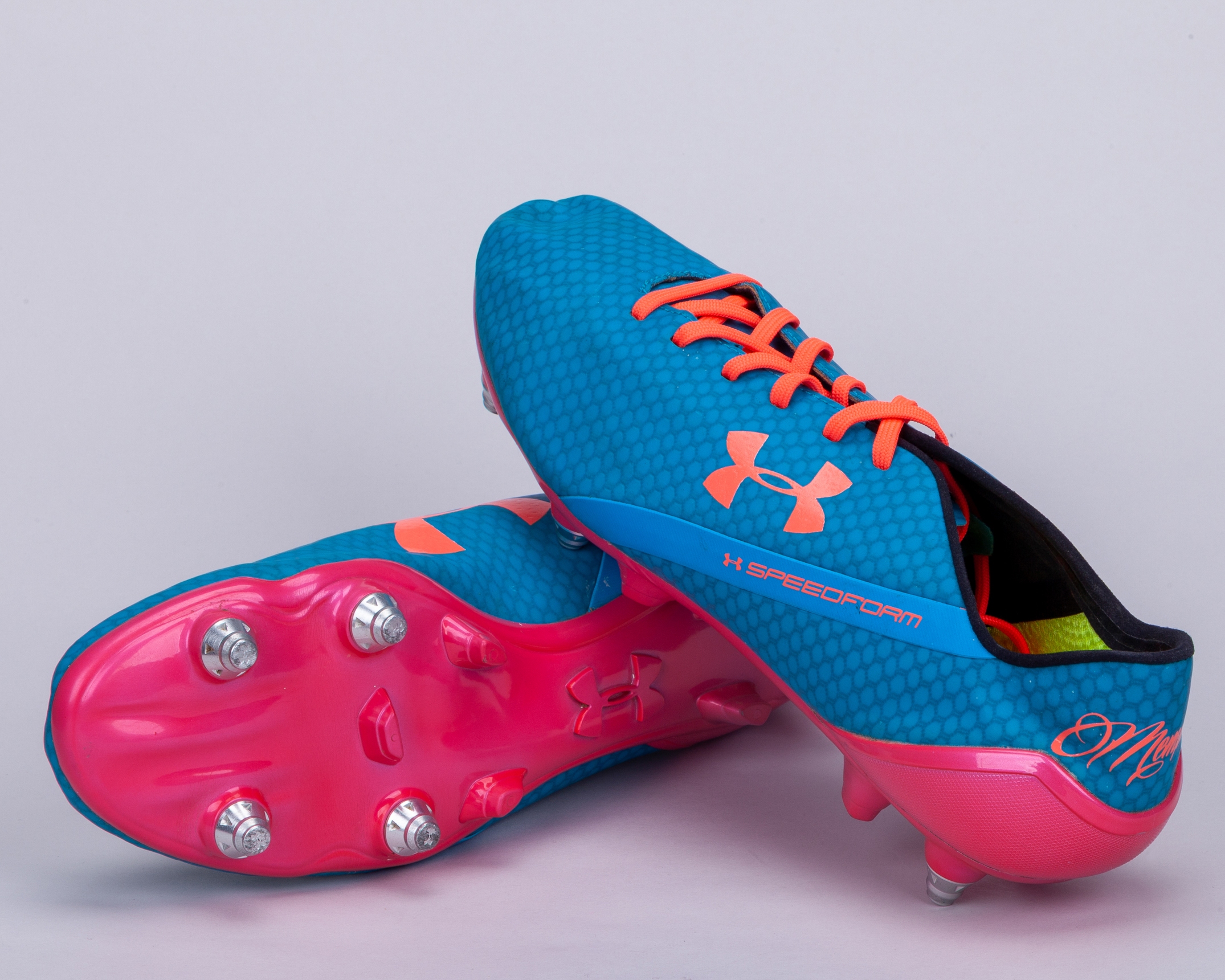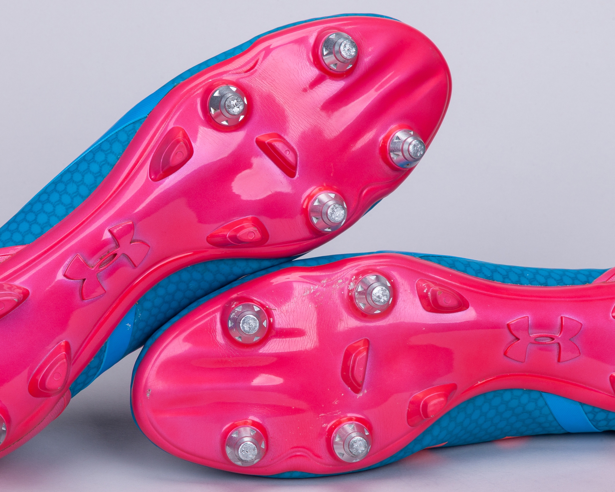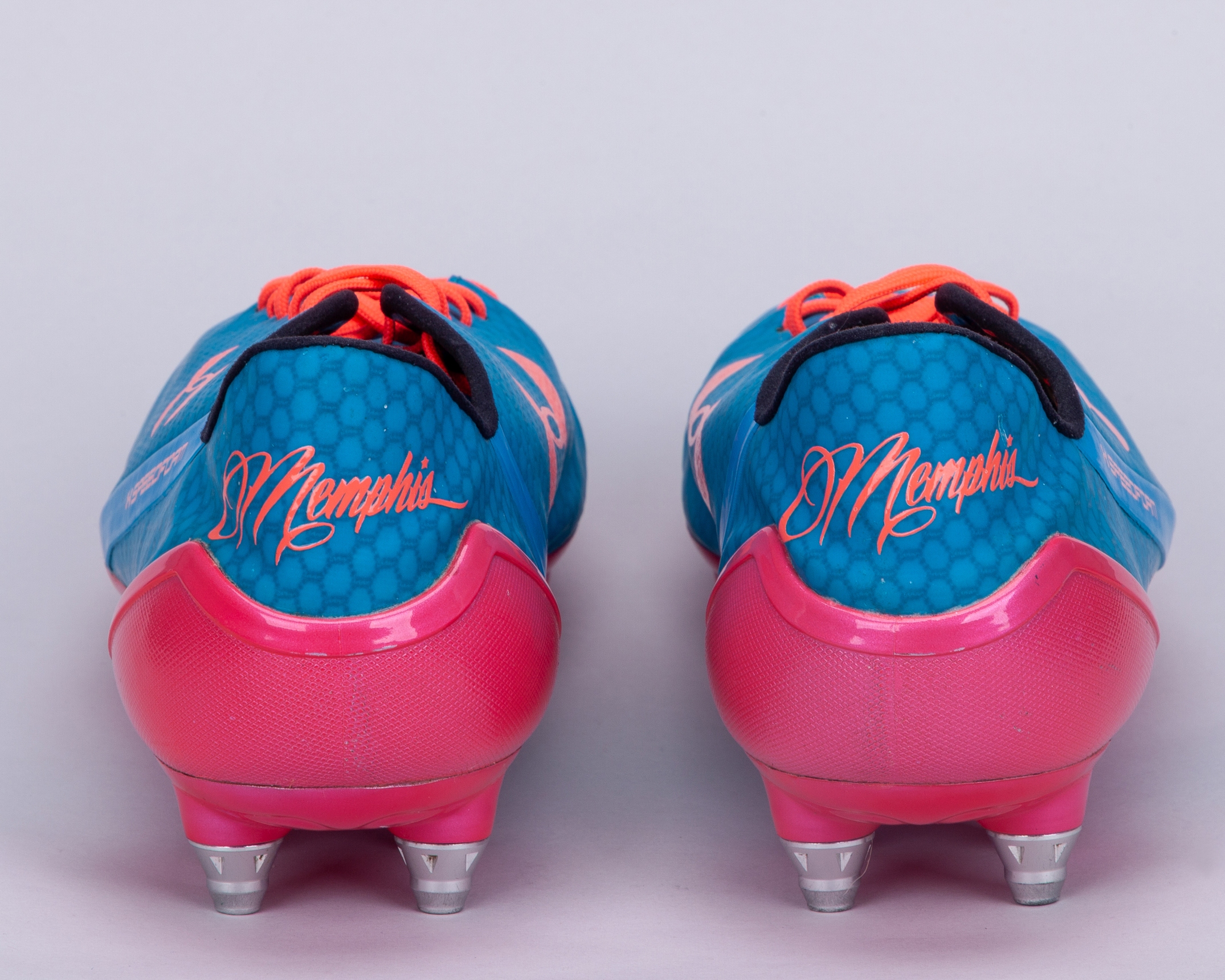 Memphis Depay blue, orange and pink Under Armour match worn football boots, 2015-16