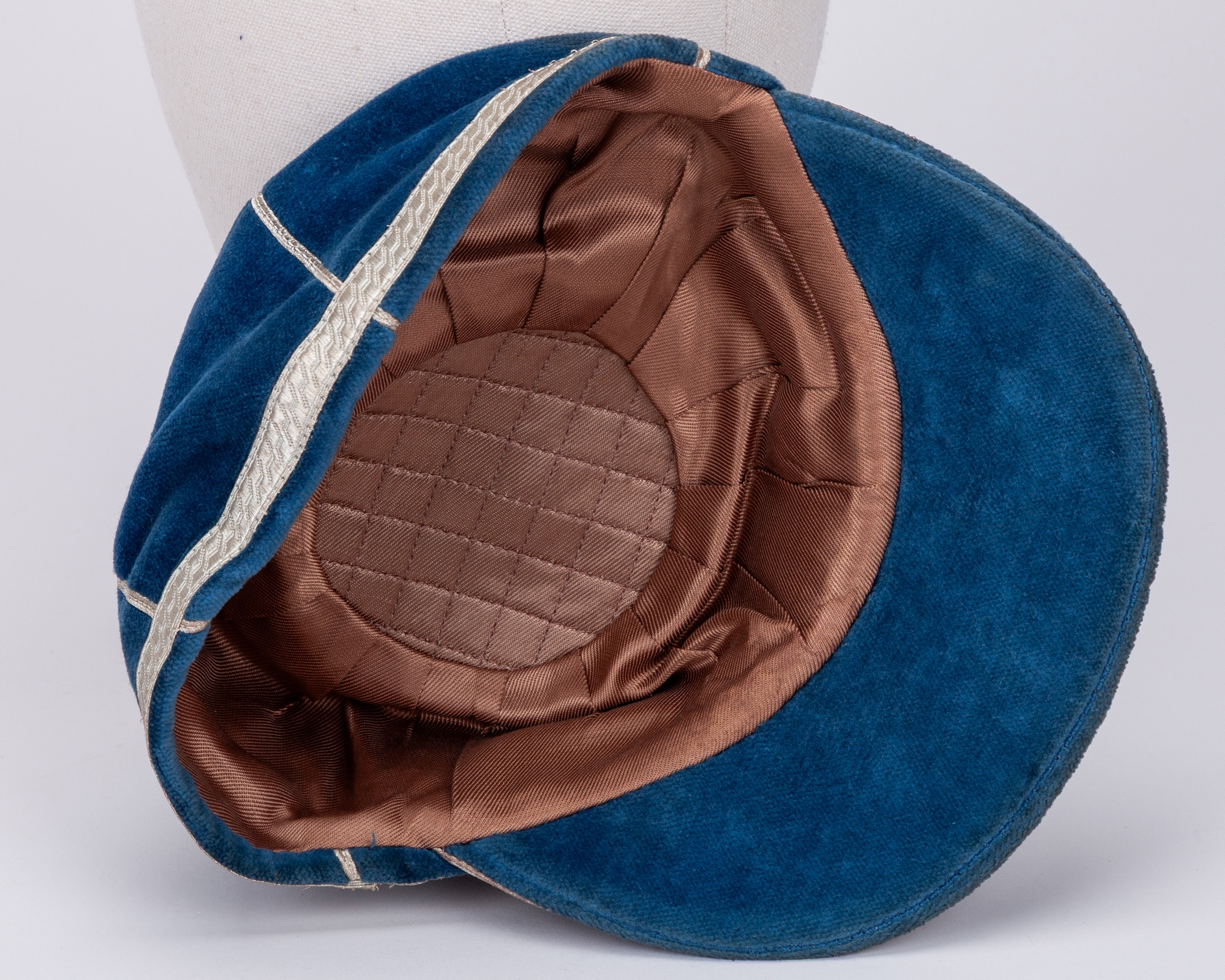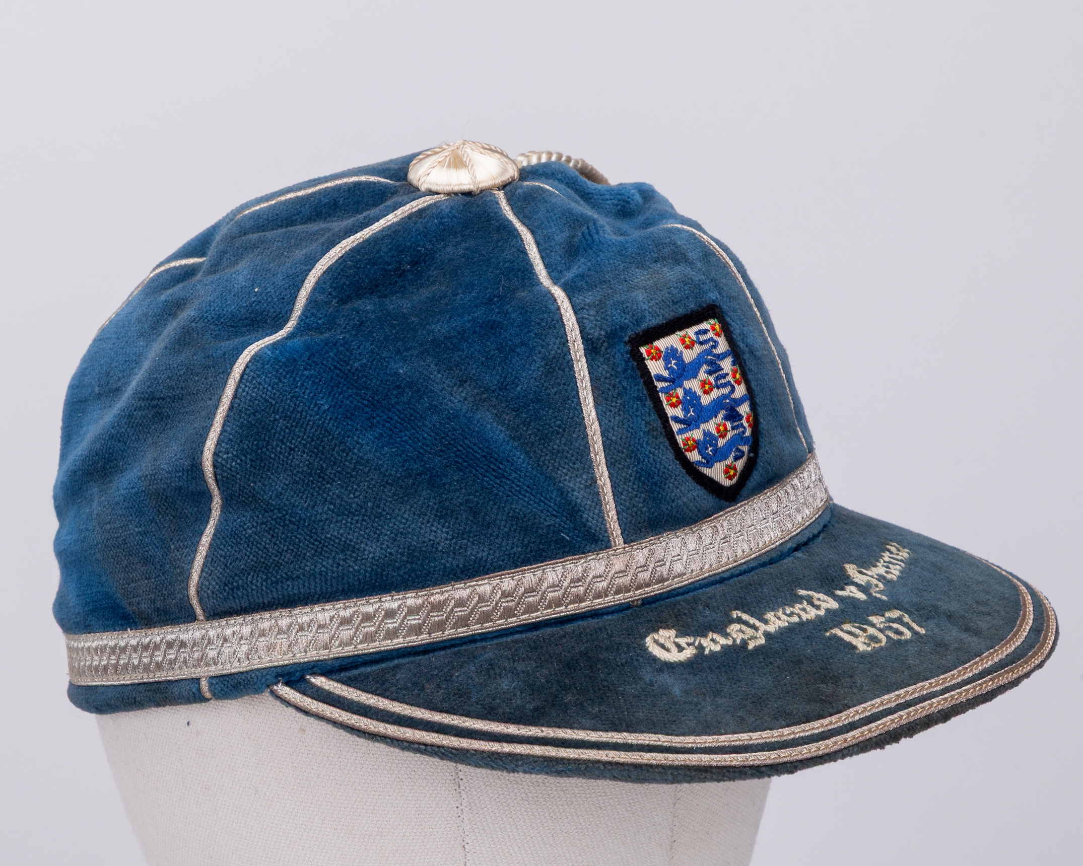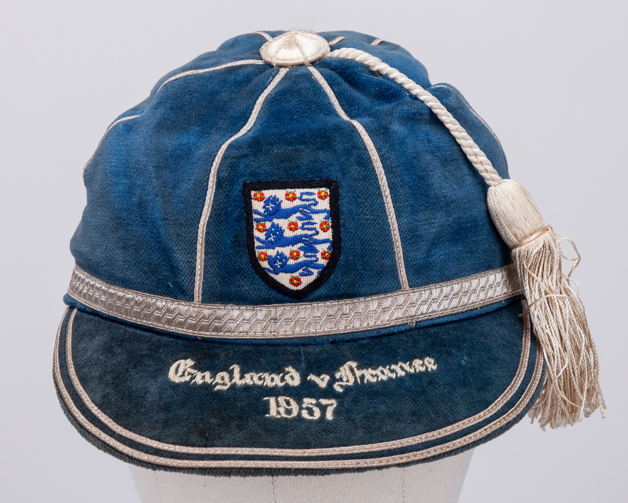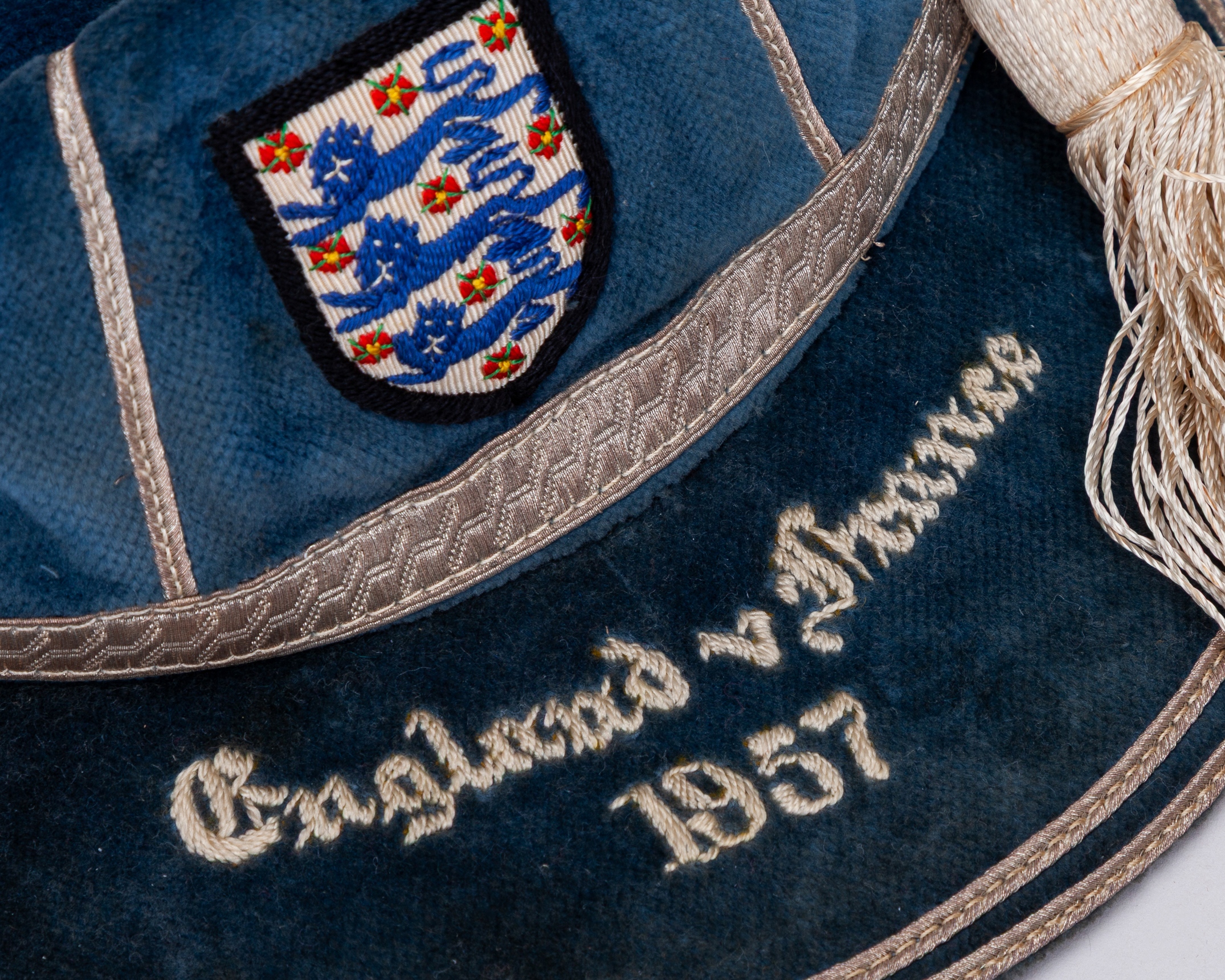 Tommy Taylor blue England v. France International cap, 1957, blue velvet cap with white tassel, and silver braiding inscribed England v. France 1957