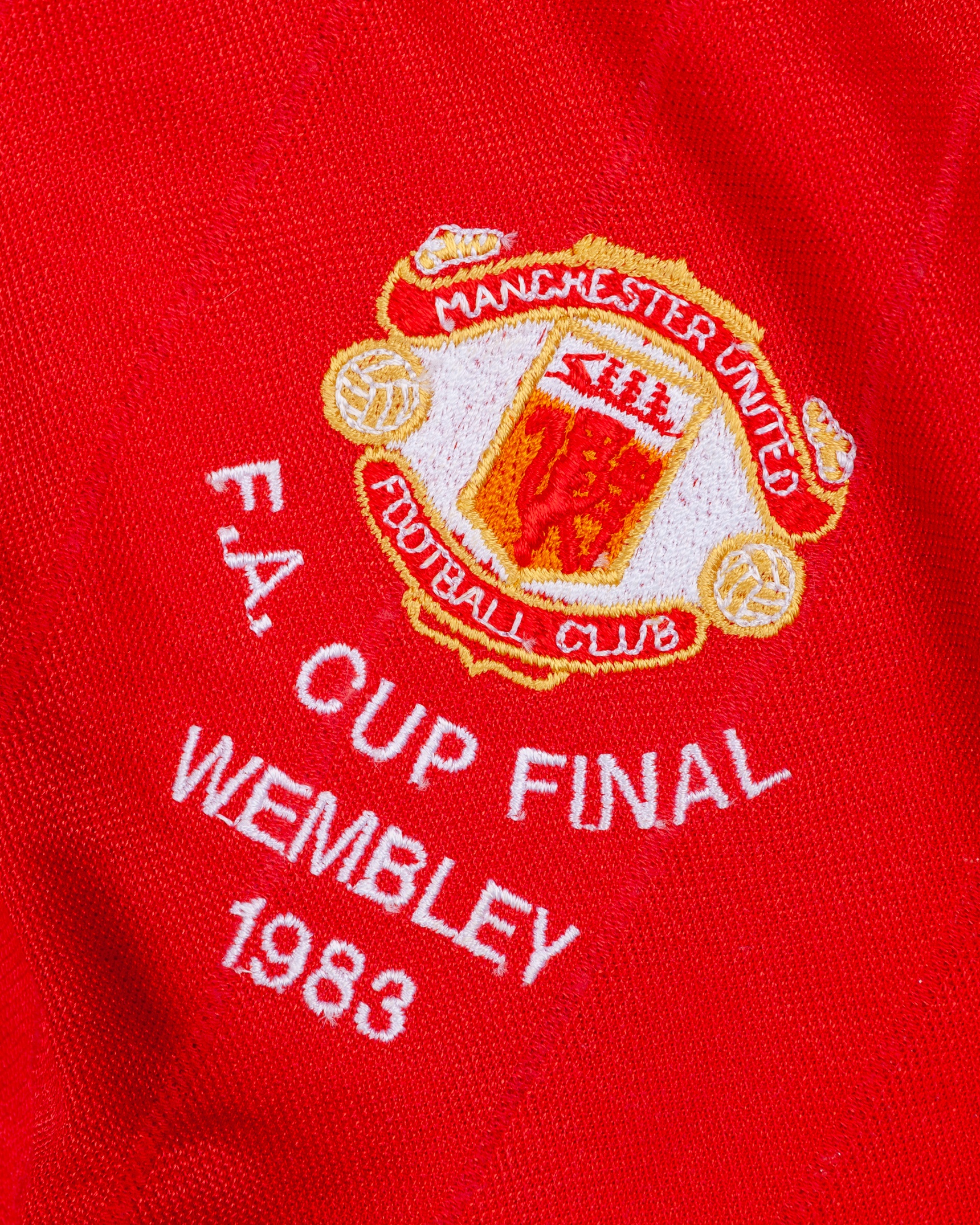 The above shirt was issued to Stapleton for the 1983 F.A.Cup Final, in the first match played on 21st May 1983 at Wembley, United and Brighton drew the match 2-2 and in the replay played 26th May 1983 at Wembley, United defeated Brighton 4-0