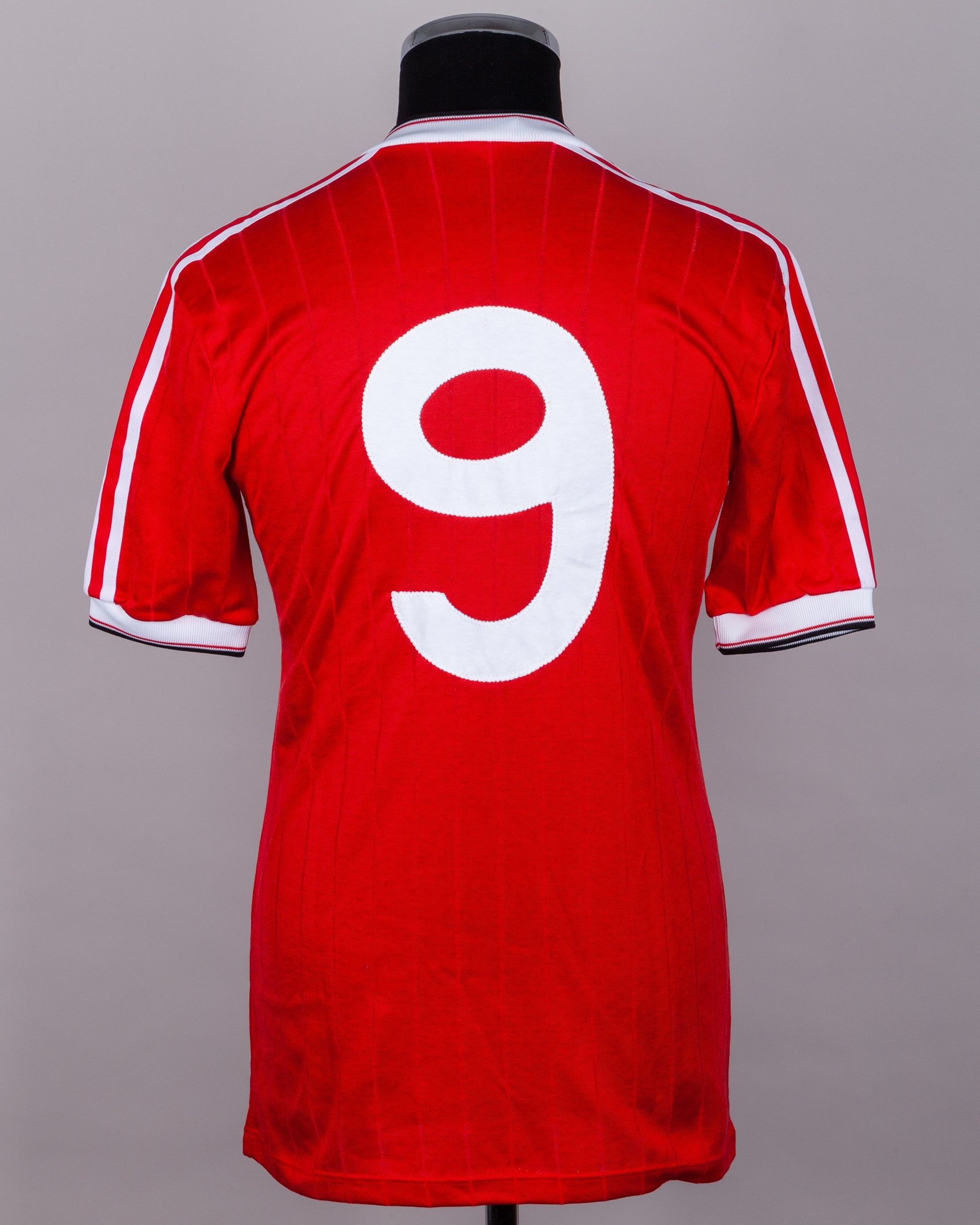 Frank Stapleton red and white No.9 Manchester United match issued short-sleeved shirt, 1983