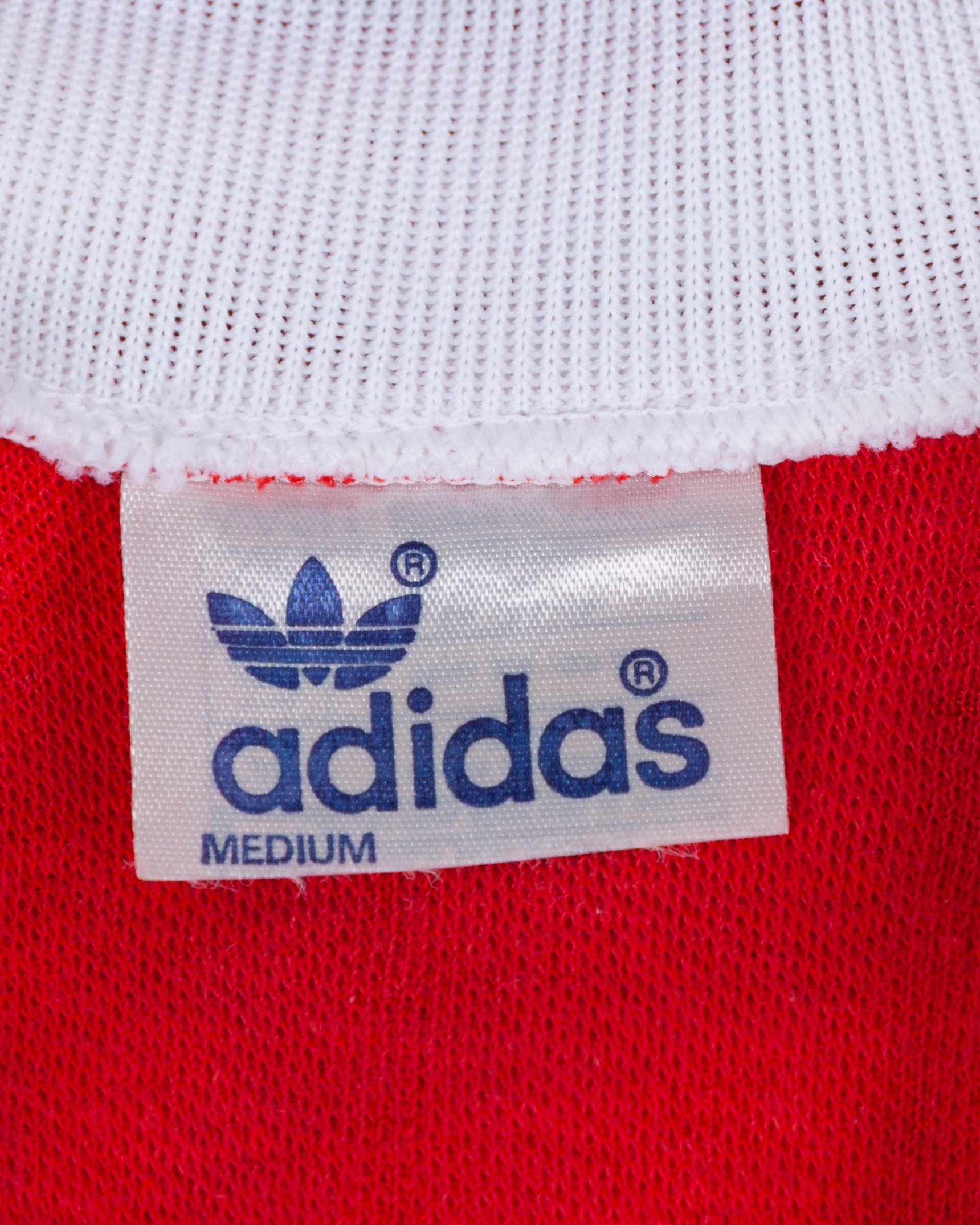 Frank Stapleton red and white No.9 Manchester United v. Brighton match issued short-sleeved shirt, 1983, Adidas, medium, with v-neck collar and embroidered badge inscribed MANCHESTER UNITED FOOTBALL CLUB F.A.CUP FINAL WEMBLEY 1983
