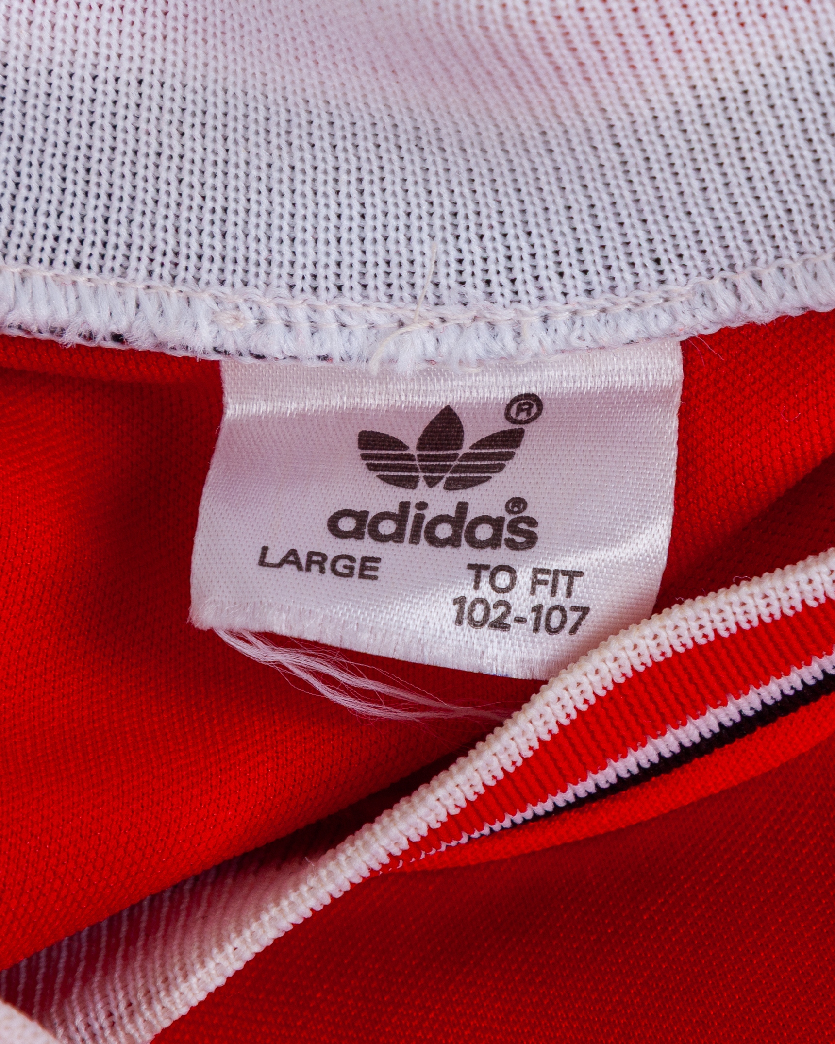 Frank Stapleton red, white and black No.10 Manchester United v. Everton match worn F.A.Cup final short-sleeved shirt, 1985, Adidas, Large, with v-neck collar and embroidered badge inscribed MANCHESTER UNITED F.A.CUP FINAL WEMBLEY 1985, staining