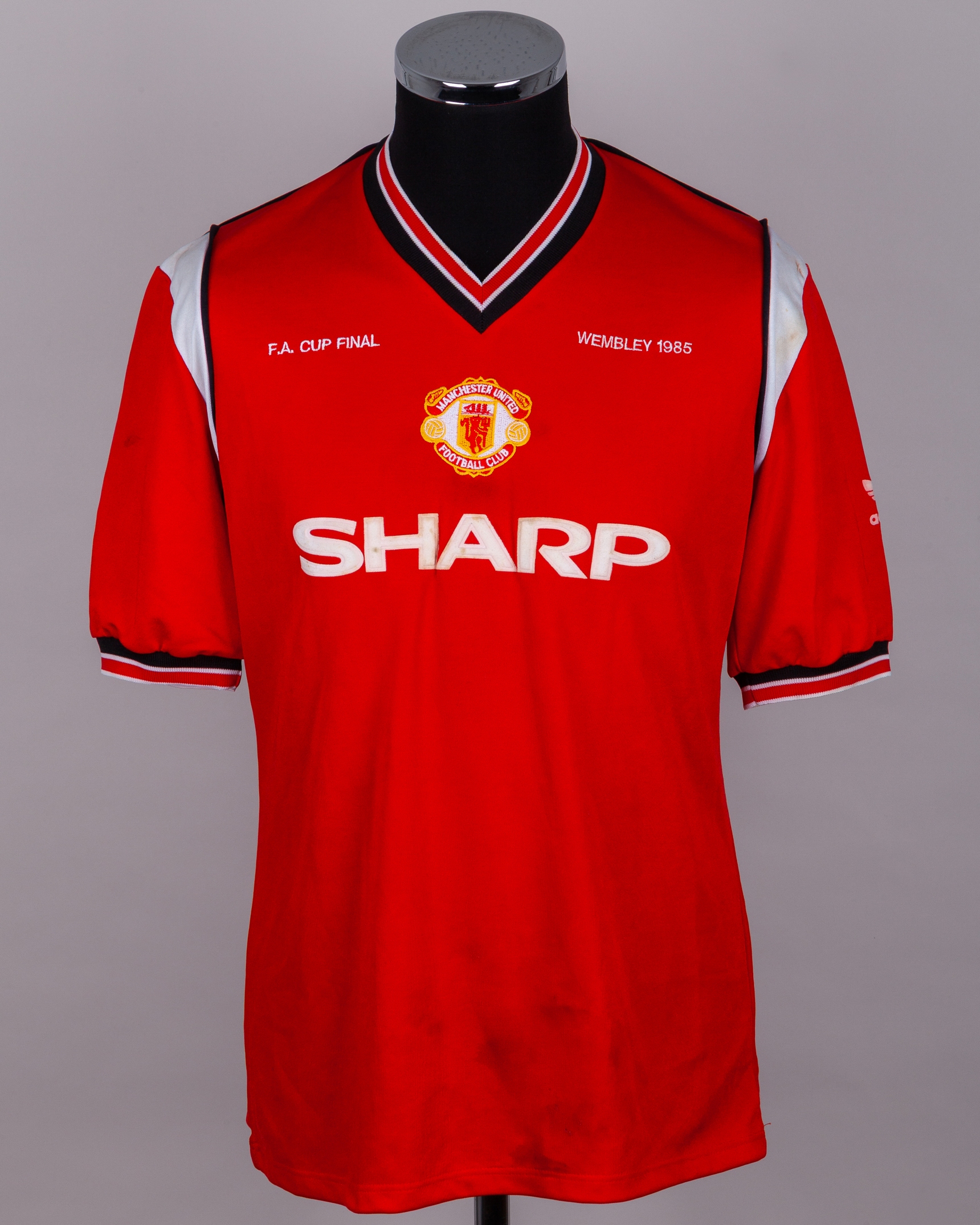 The above shirt was worn by Frank Stapleton in the 1985 F.A.Cup final against Everton played on 18th May 1985 at Wembley United defeating Everton 1-0 after extra time.