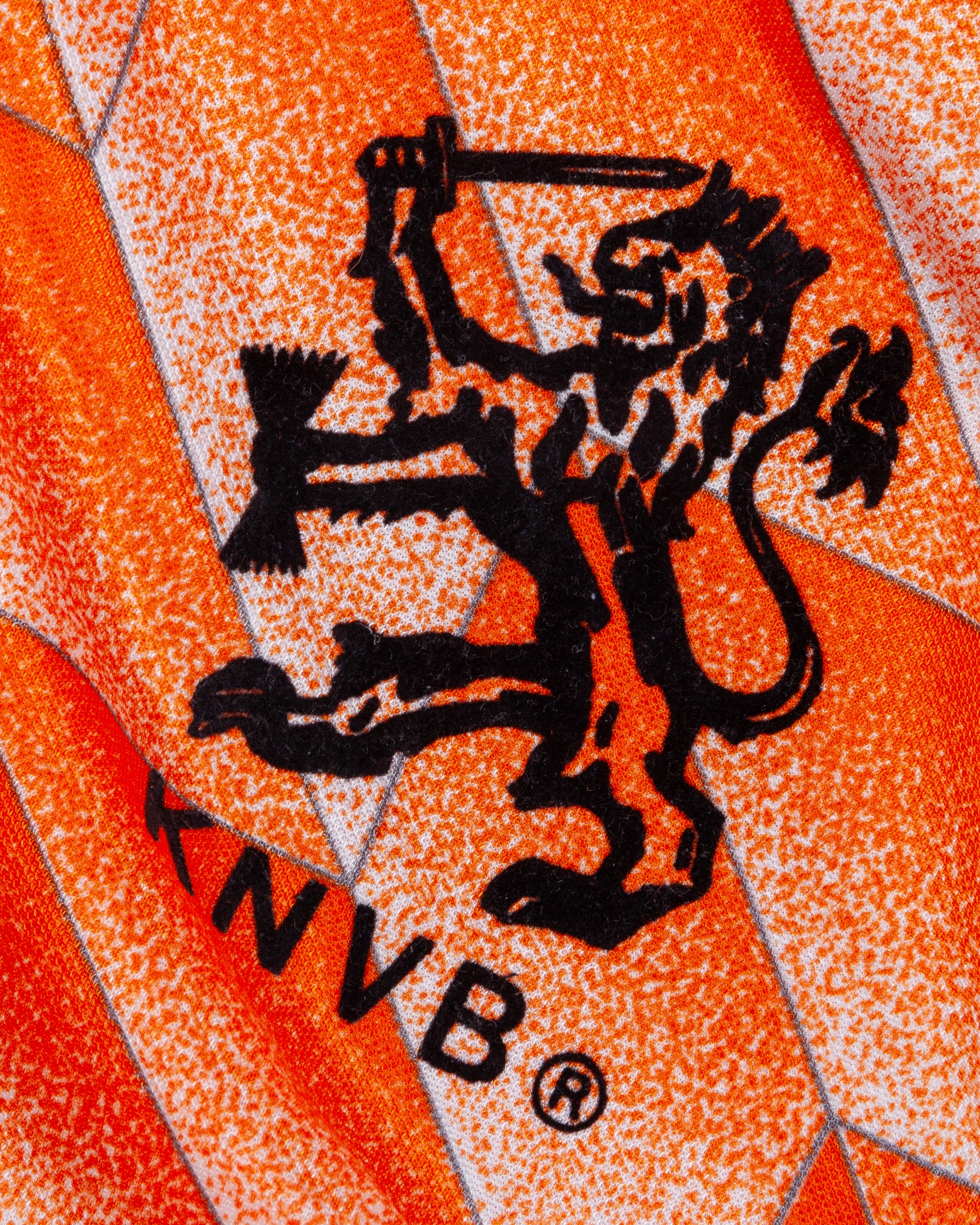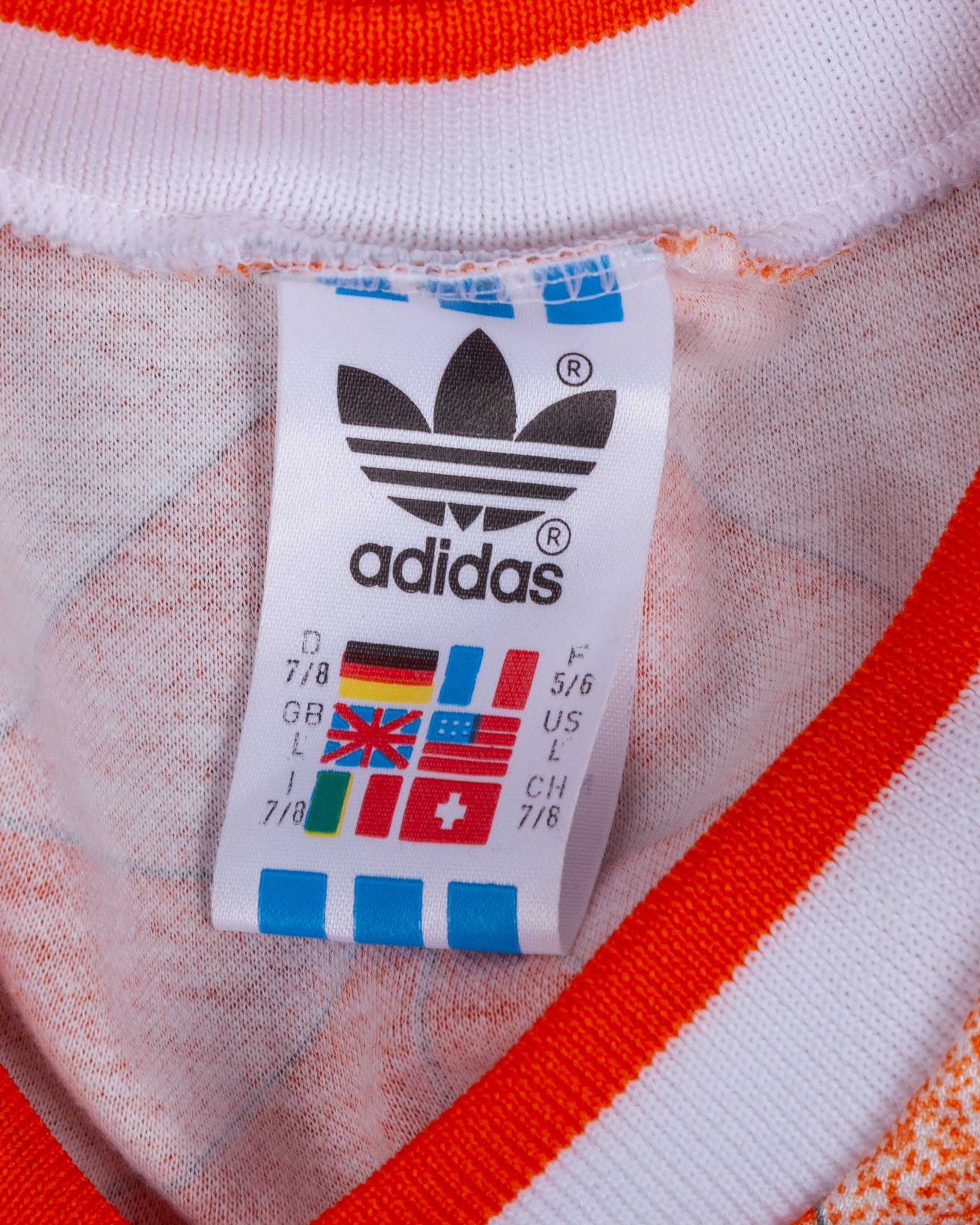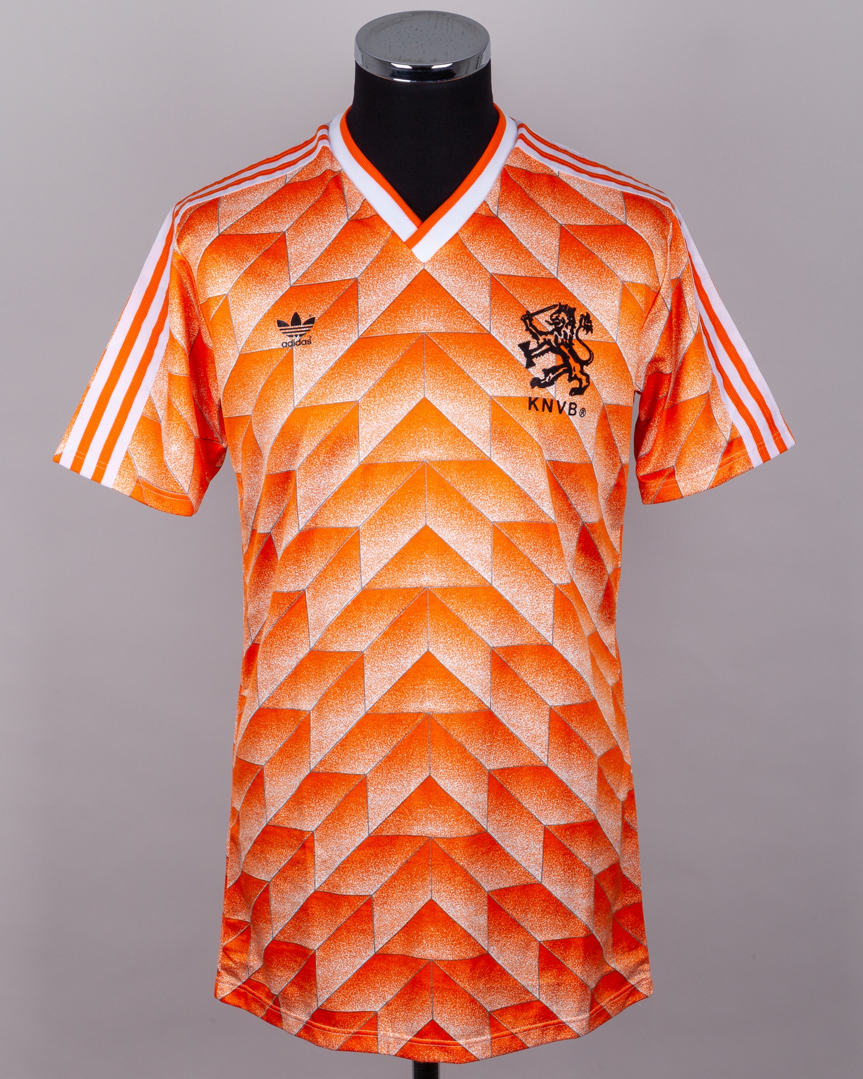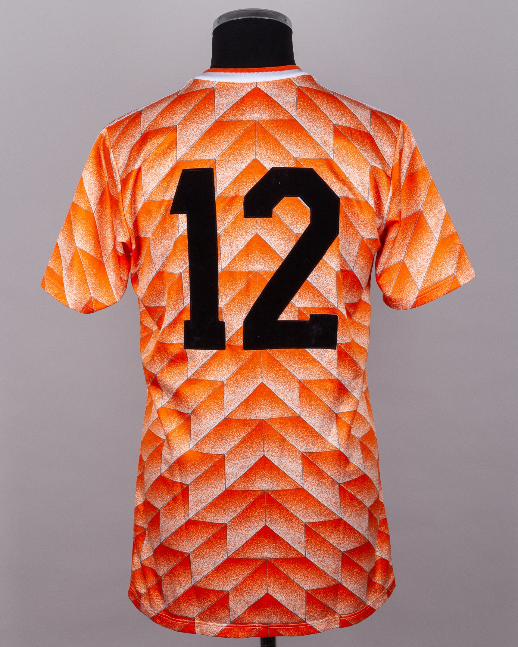 Marco Van Basten orange and white No.12 Holland v. Republic of Ireland Euro 1988 match issued short-sleeved shirt, 1988, Adidas, L, with v-neck collar and felt badge