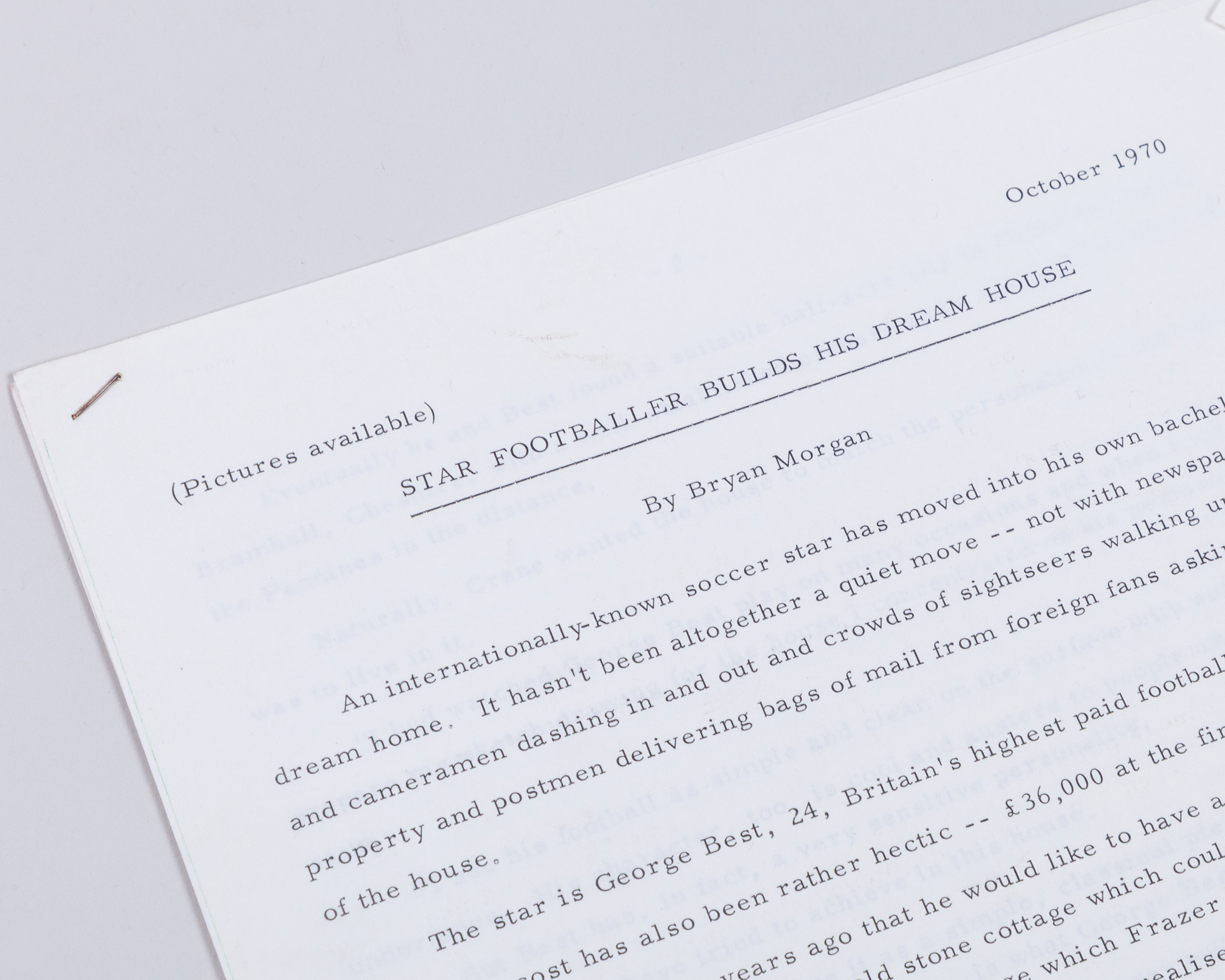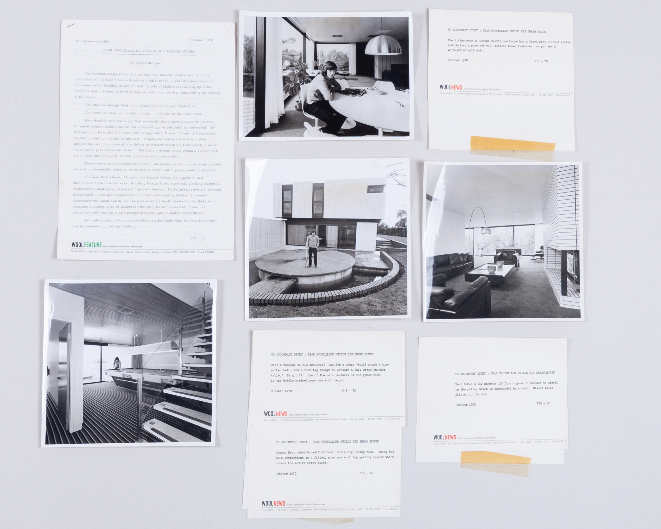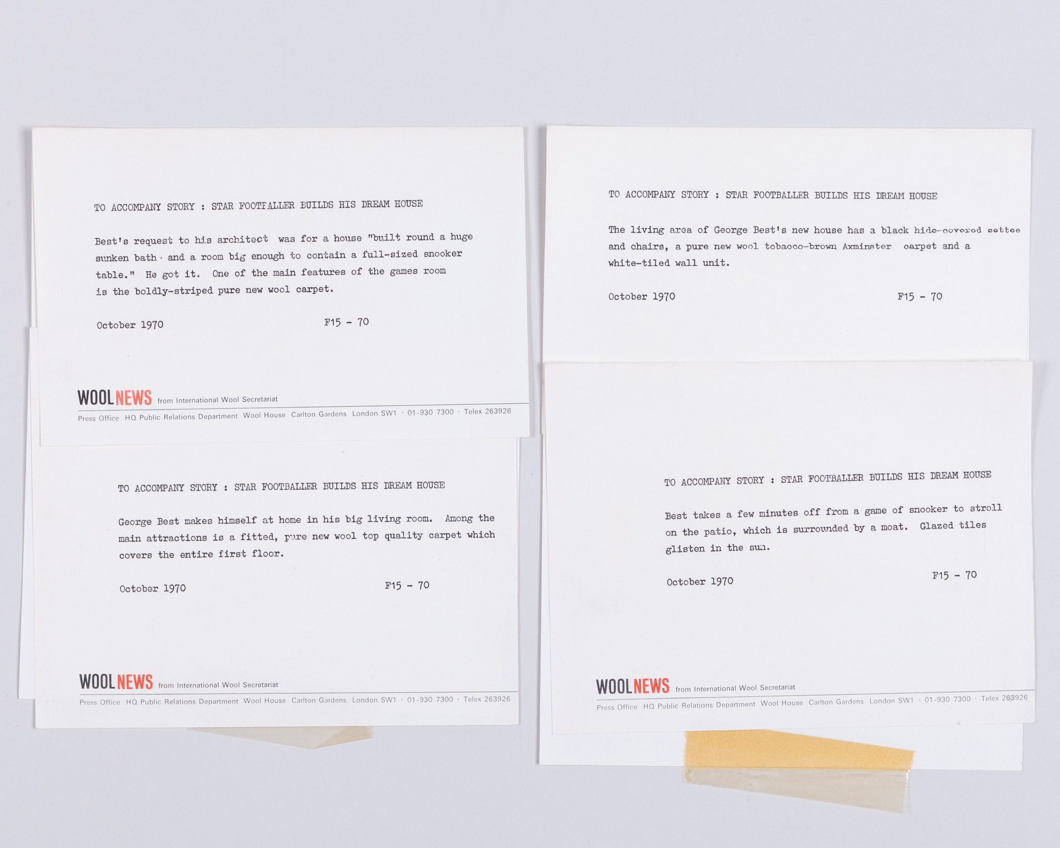 George Best four original photographs of George Best at his new home in Bramhall, 1970, with interesting press release