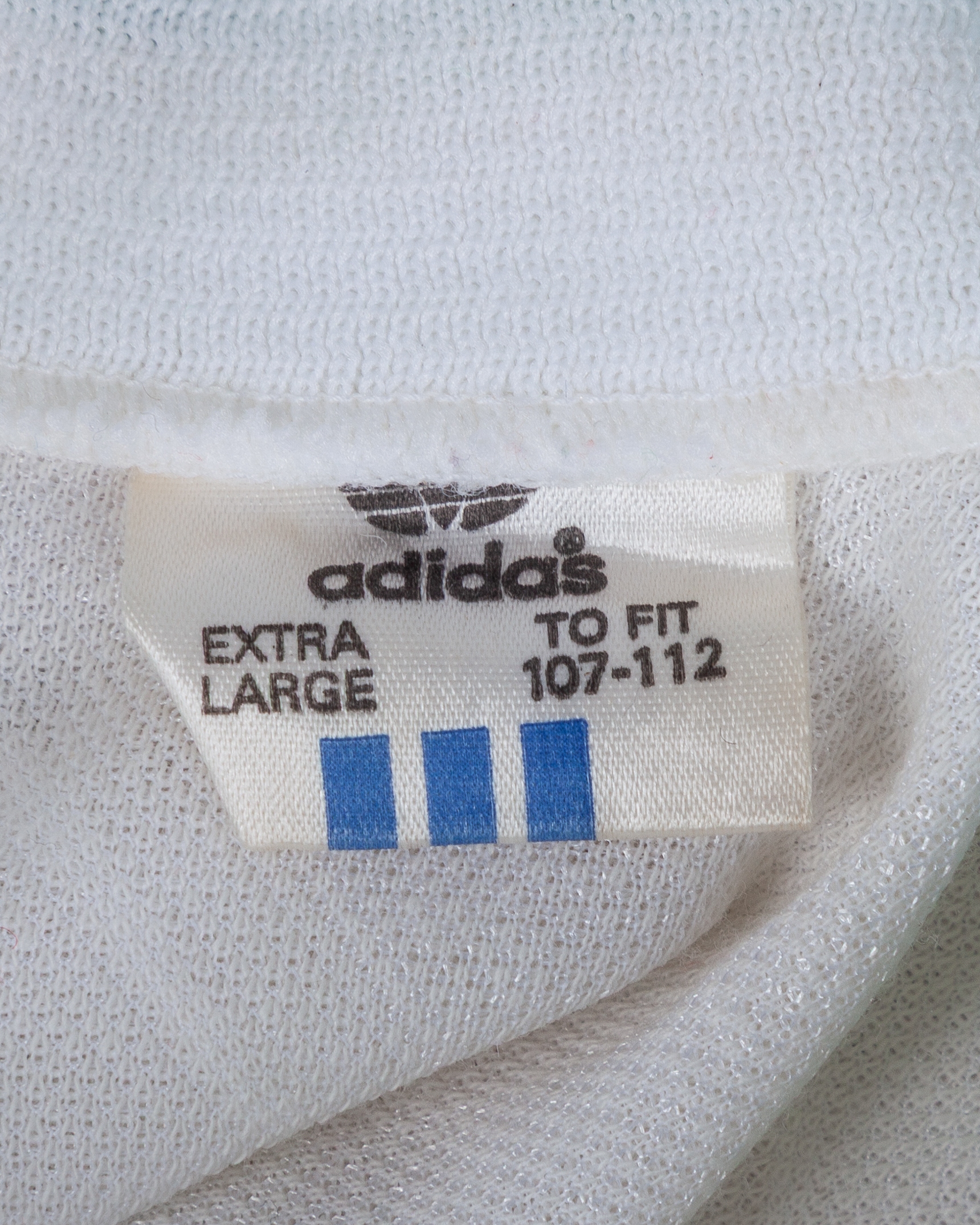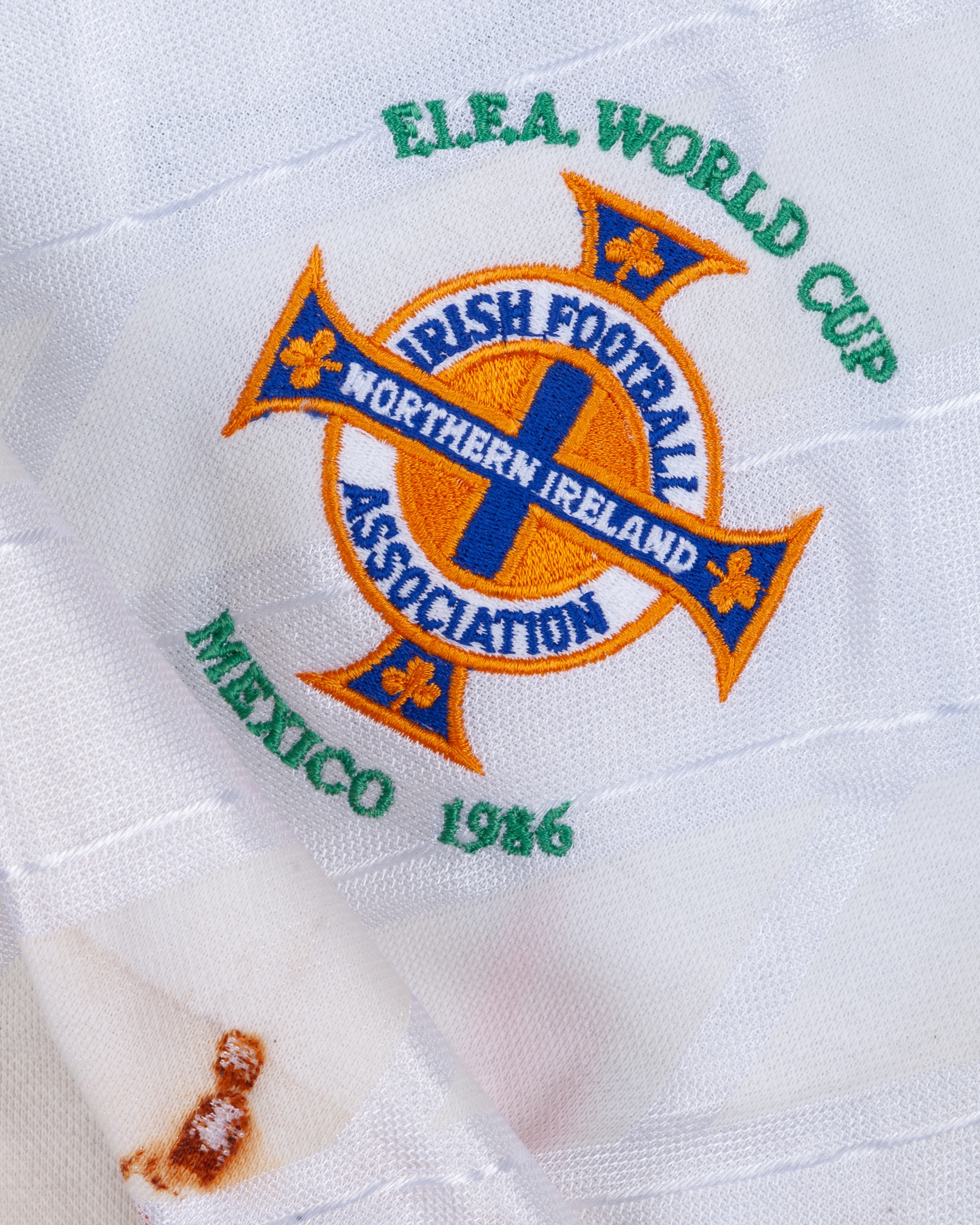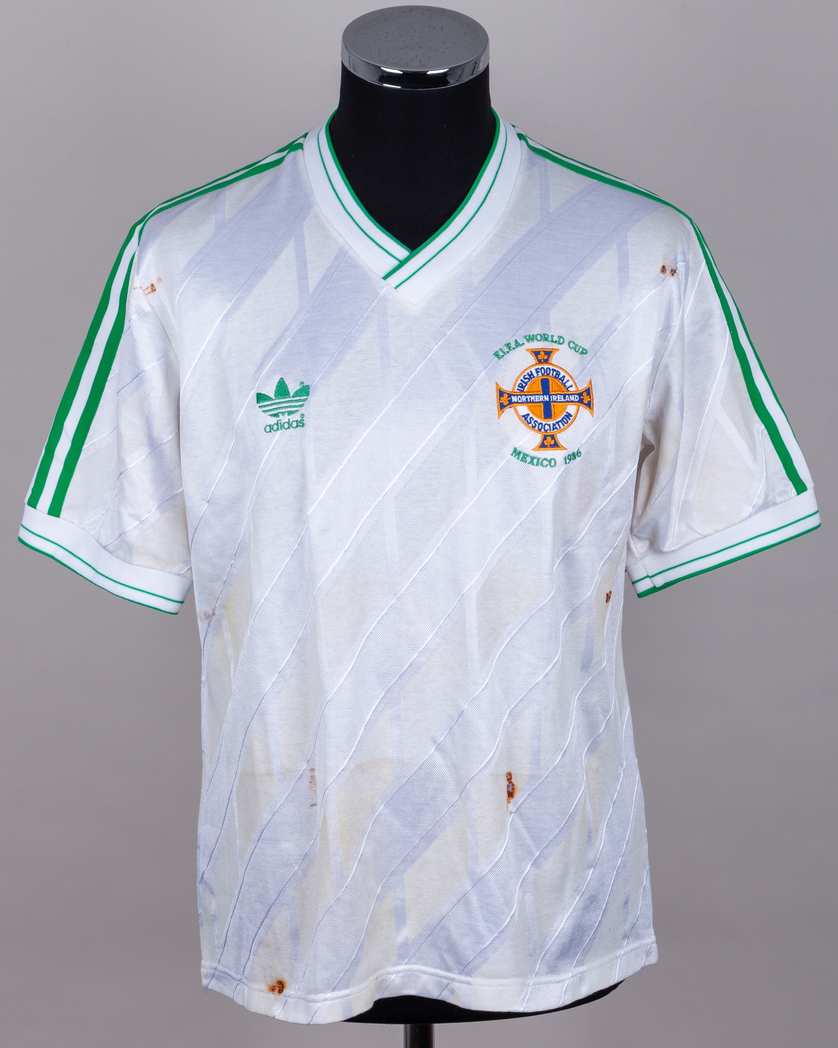 Sammy McIlroy white and green No.8 Northern Ireland World Cup match issued short-sleeved shirt, 1986, Adidas, Extra Large, with v-neck collar and embroidered badge, inscribed NORTHERN IRELAND IRISH FOOTBALL ASSOCIATION F.I.F.A. WORLD CUP MEXICO 1986, staining all over, shirt was previously framed, rust marks from pins