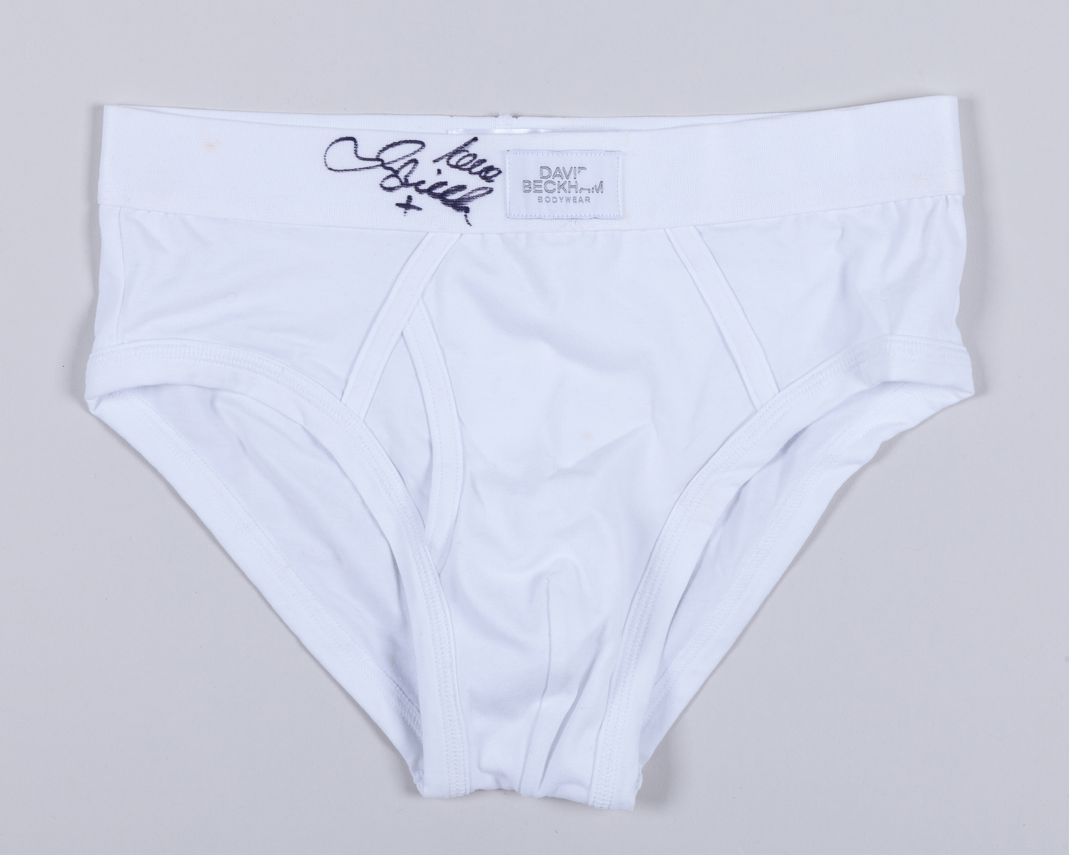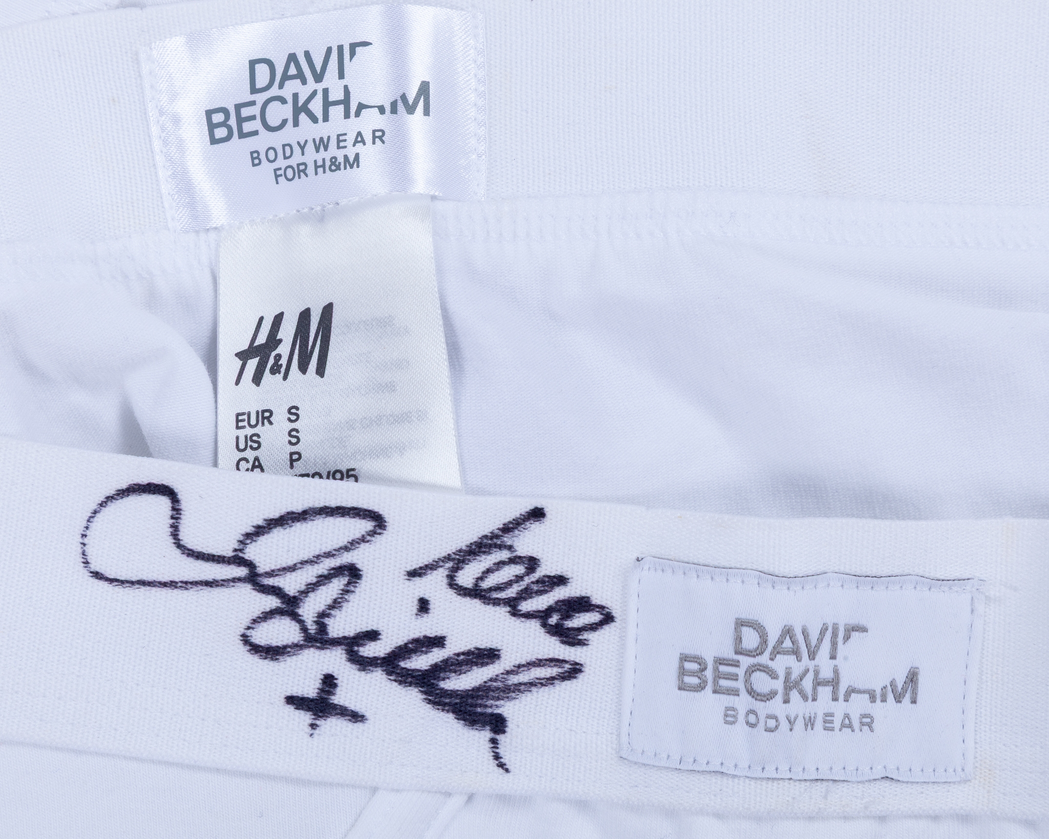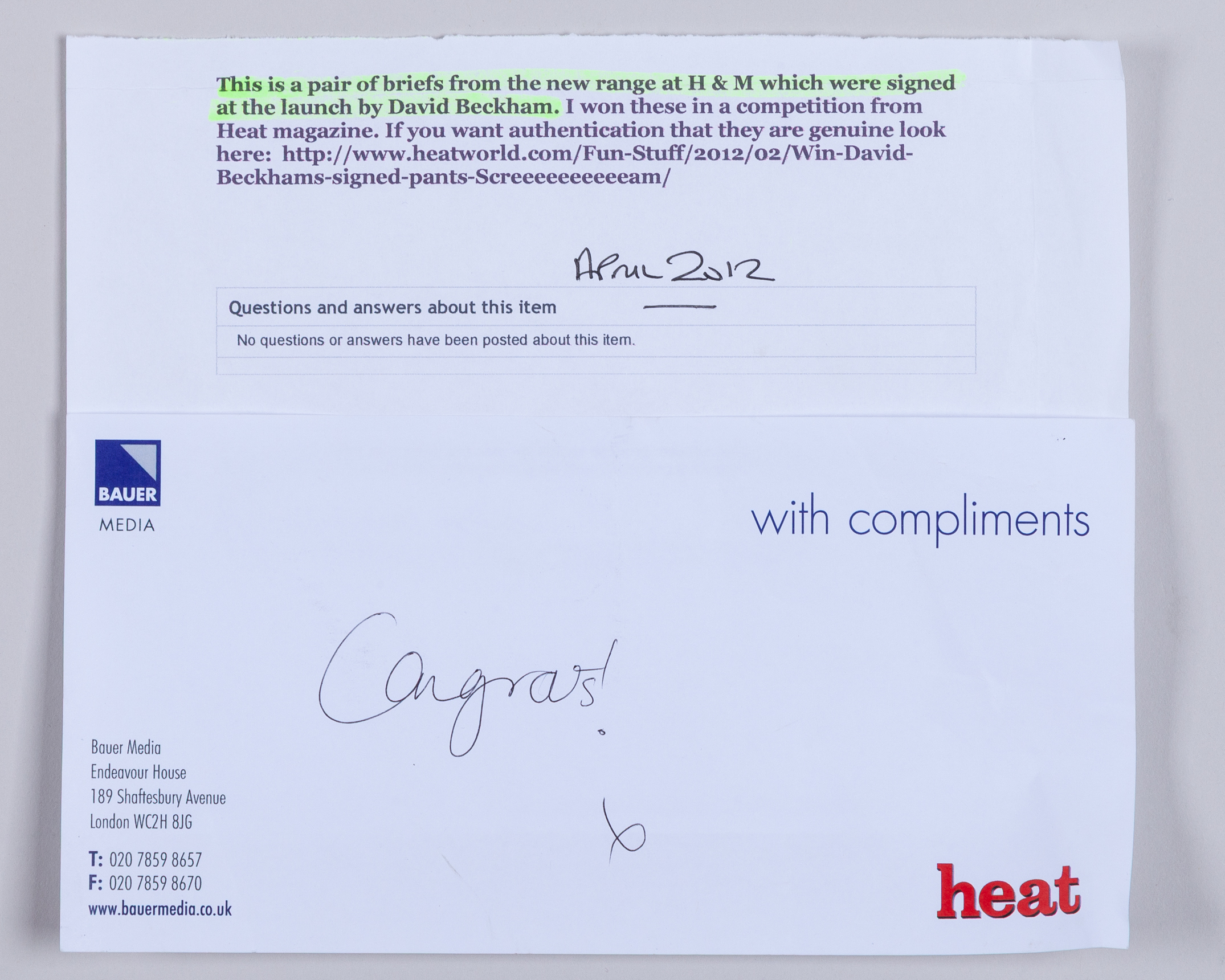David Beckham a pair of autographed briefs by H & M, won in a Heat Magazine competition, with Heat comp slip