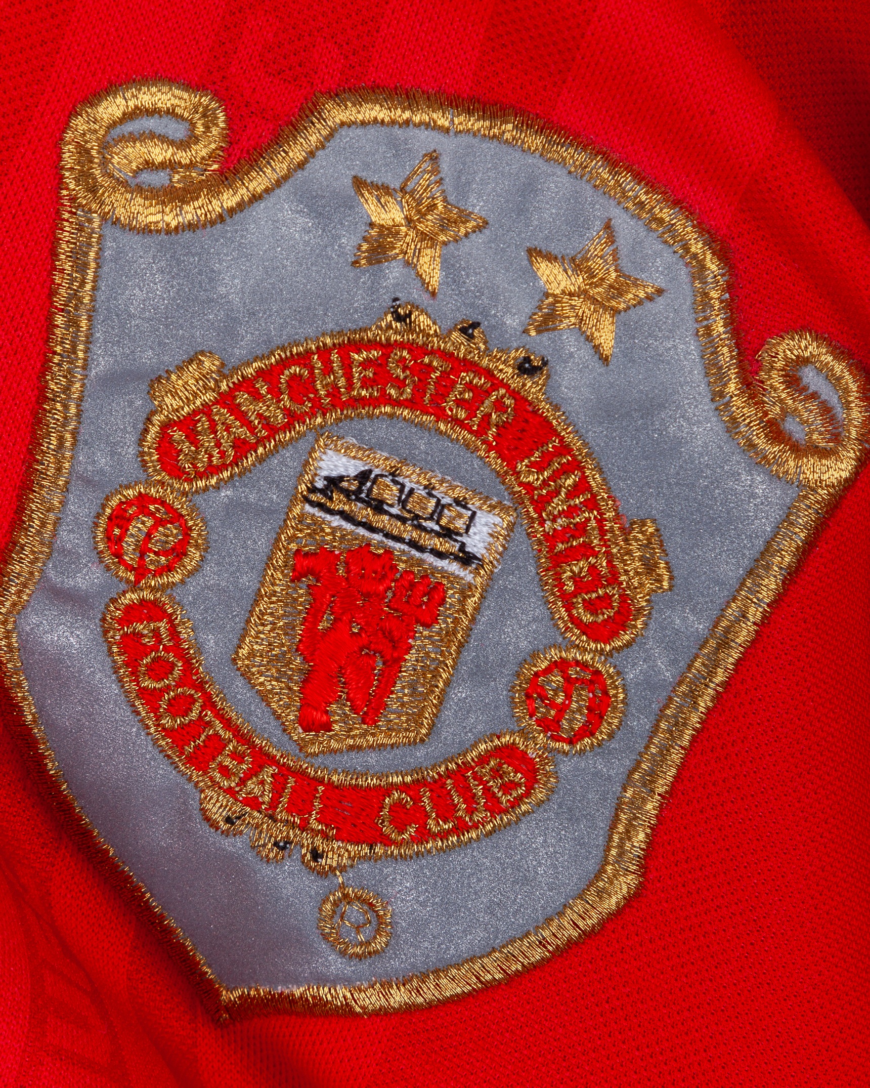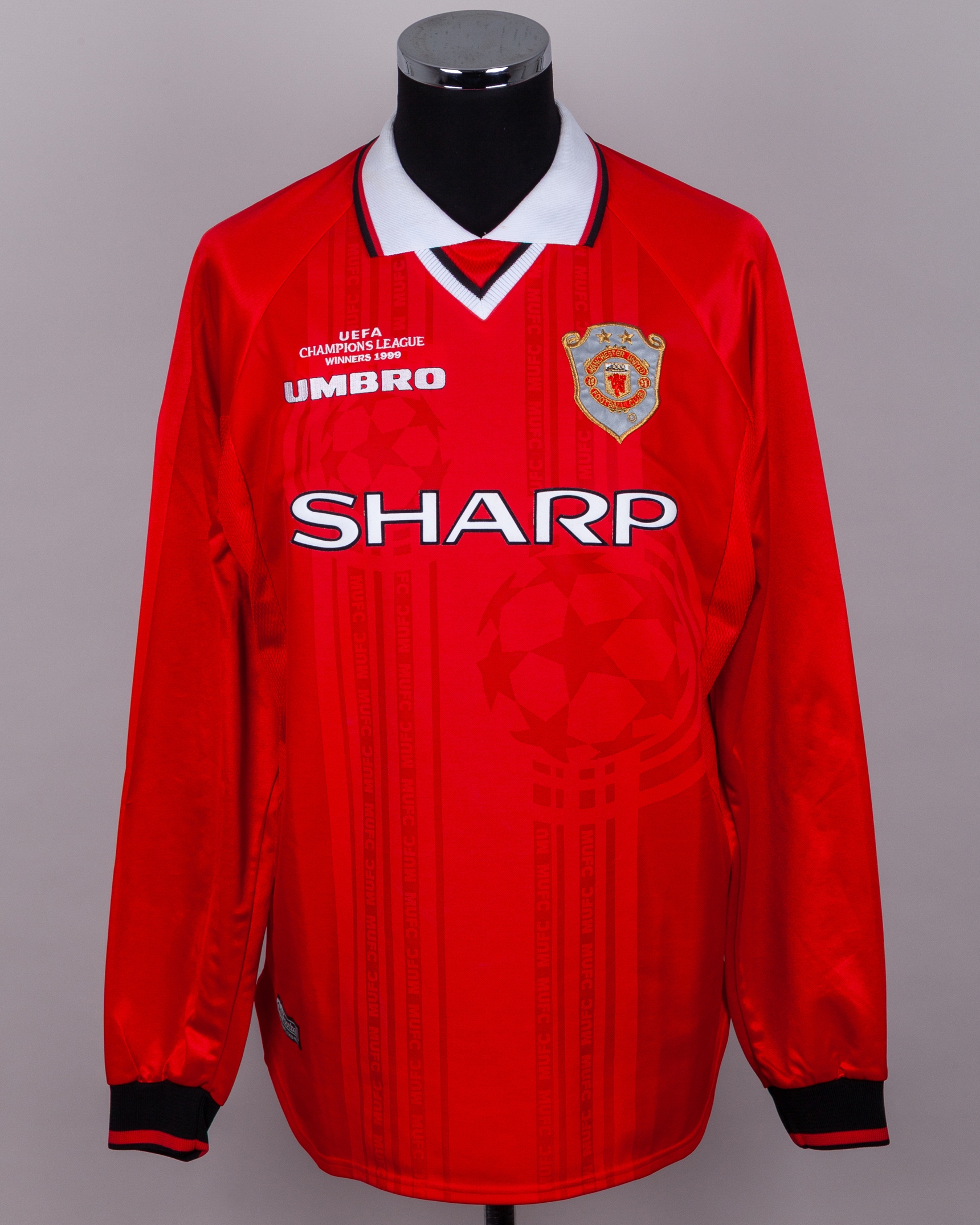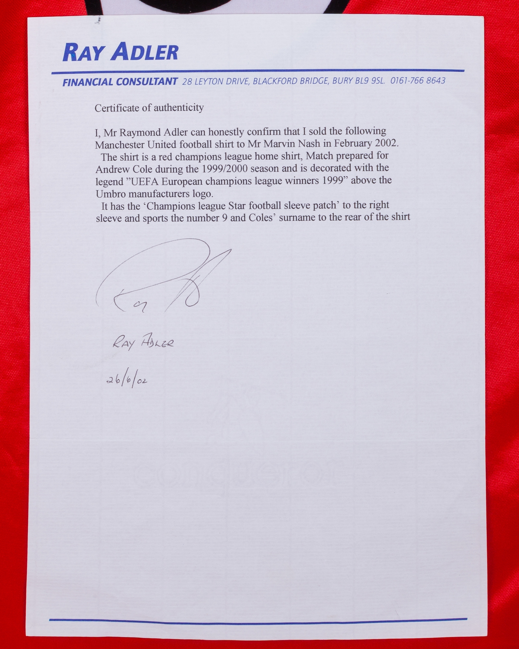 Andy Cole red No.9 Manchester United Champions League issued long-sleeved shirt, 1999-2000, Umbro, XL, with v-neck style collar and embroidered cloth badge inscribed MANCHESTER UNITED FOOTBALL CLUB UEFA CHAMPIONS LEAGUE WINNERS 1999, the reverse lettered COLE, the right sleeve with Champions League flash, with letter of provenance signed Ray Adler, with some pulls and small staining to lower front