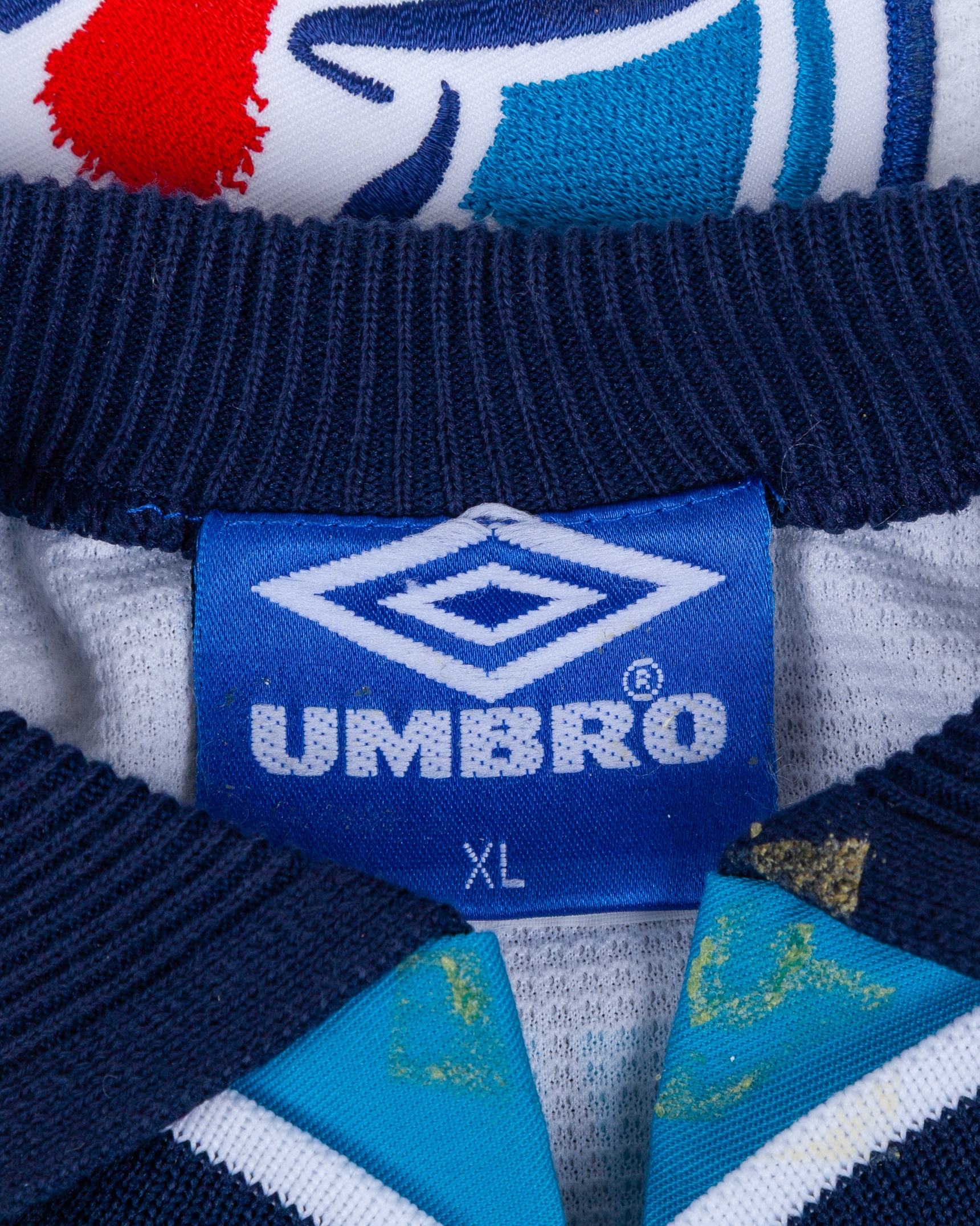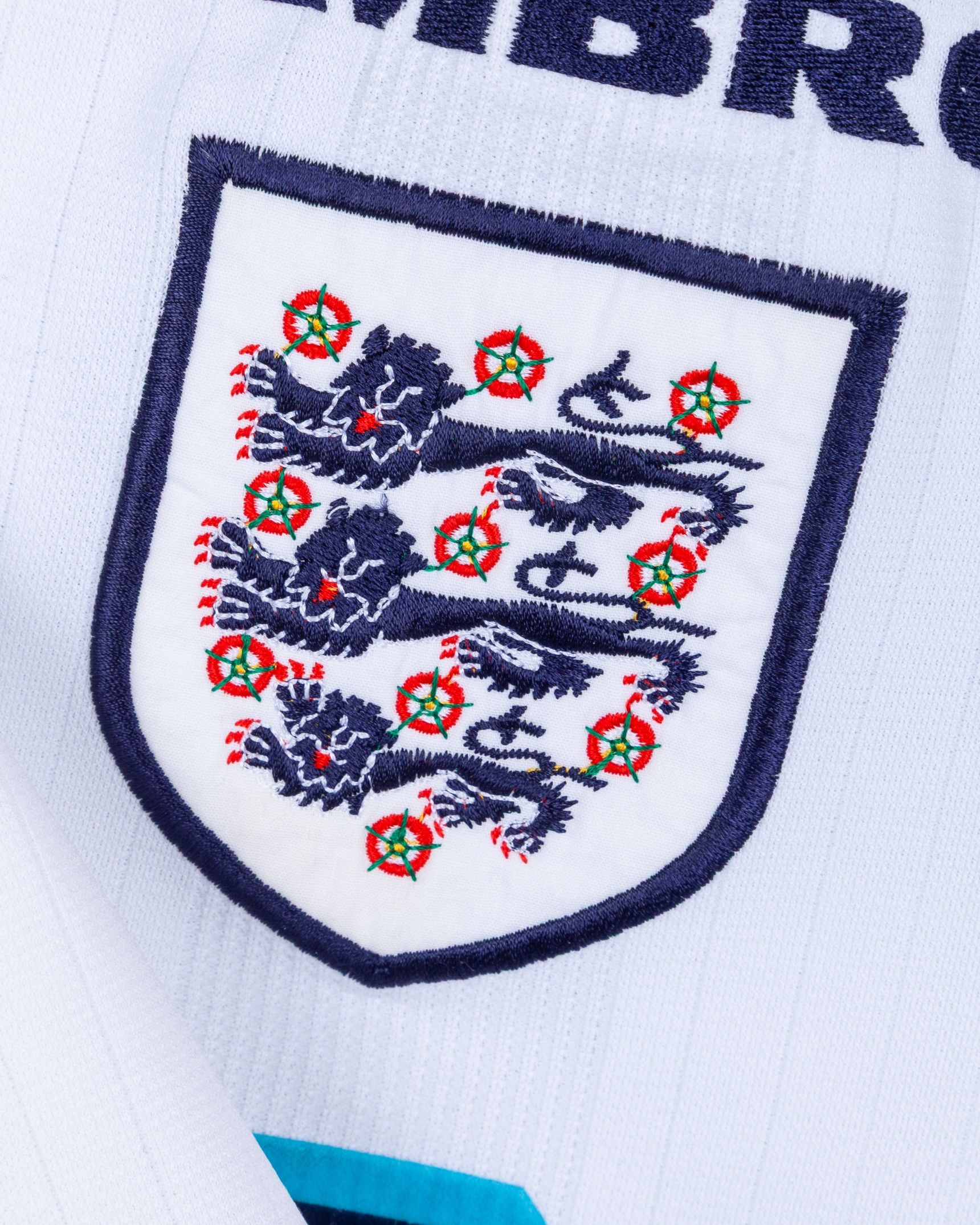 Gary Neville white England v. Scotland Euro 96 short-sleeved shirt, 1996, Umbro, XL with v-neck and embroidered three lion badge, the reverse lettered NEVILLE, the sleeves with Euro 96 flashes, the shirt was previously framed and shirt shows signs of framing