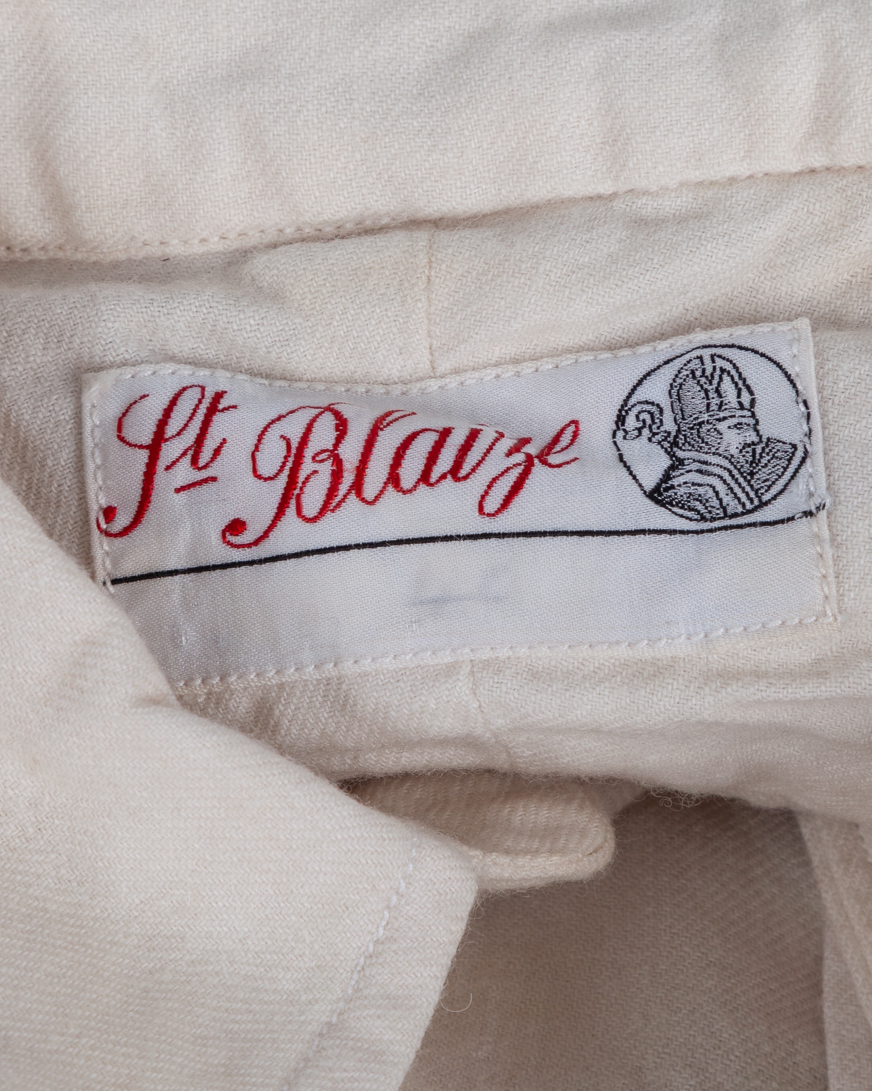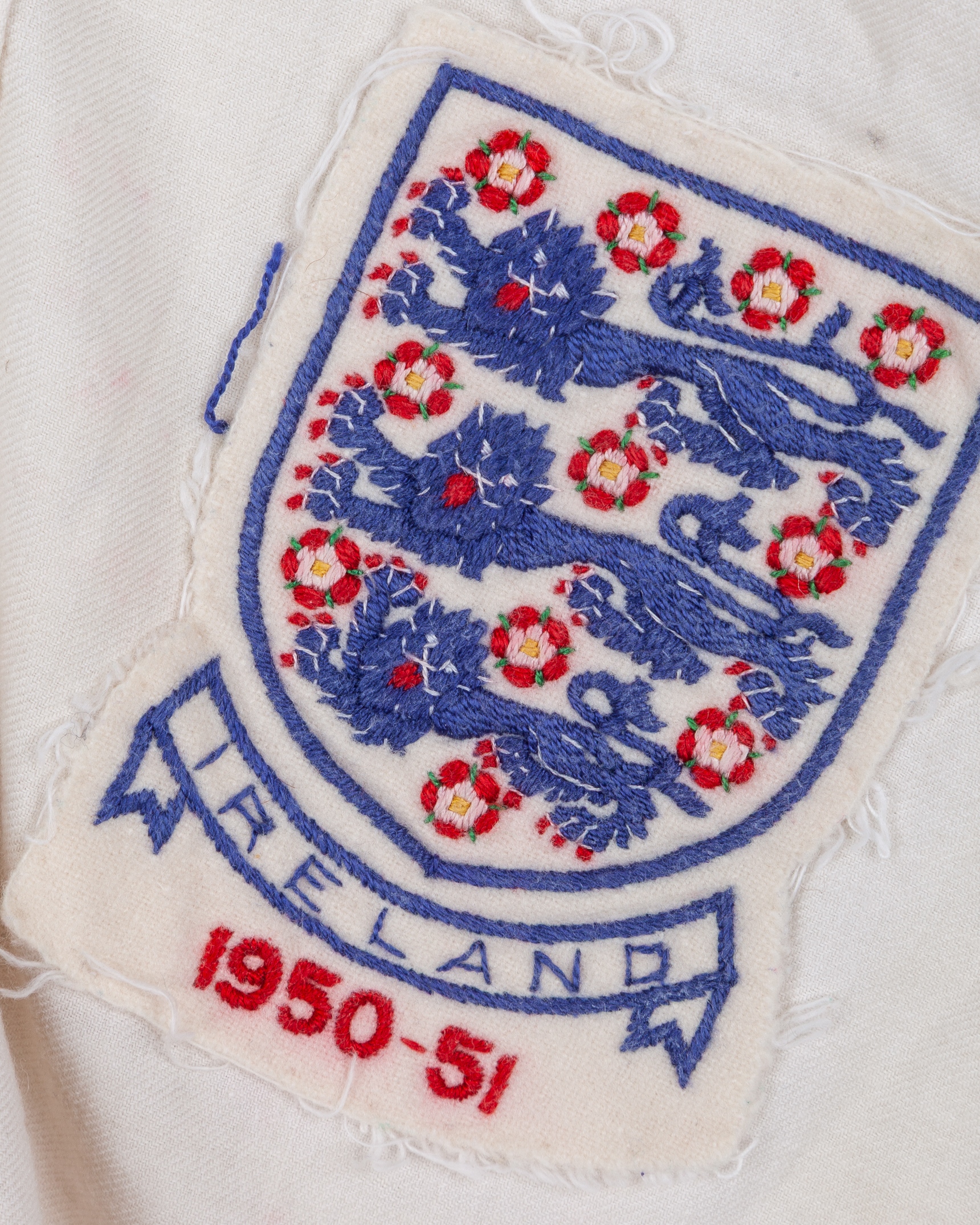 John Aston white No.3 England v. Northern Ireland match worn short-sleeved shirt, 1950, St Blaze, 40, with button-up collar and embroidered cloth badge inscribed IRELAND 1950-51, staining, some colour run
