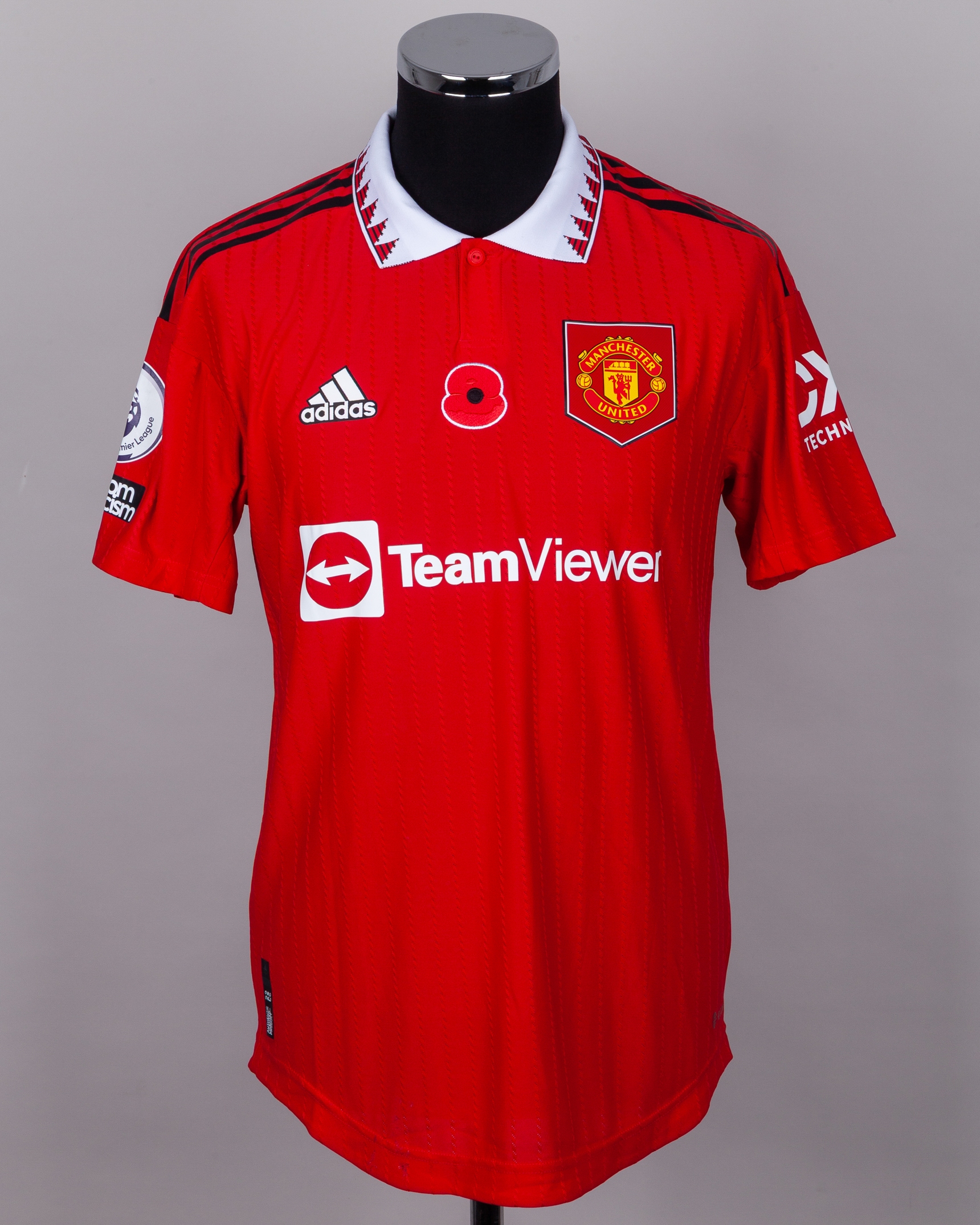 Donny Van De Beek red No.34 Manchester United issued short-sleeved shirt, 2022-23, Adidas, 6, with button-up collar and printed badge, with embroidered poppy, the reverse lettered VAN DE BEEK, the right sleeve with Premier League flash