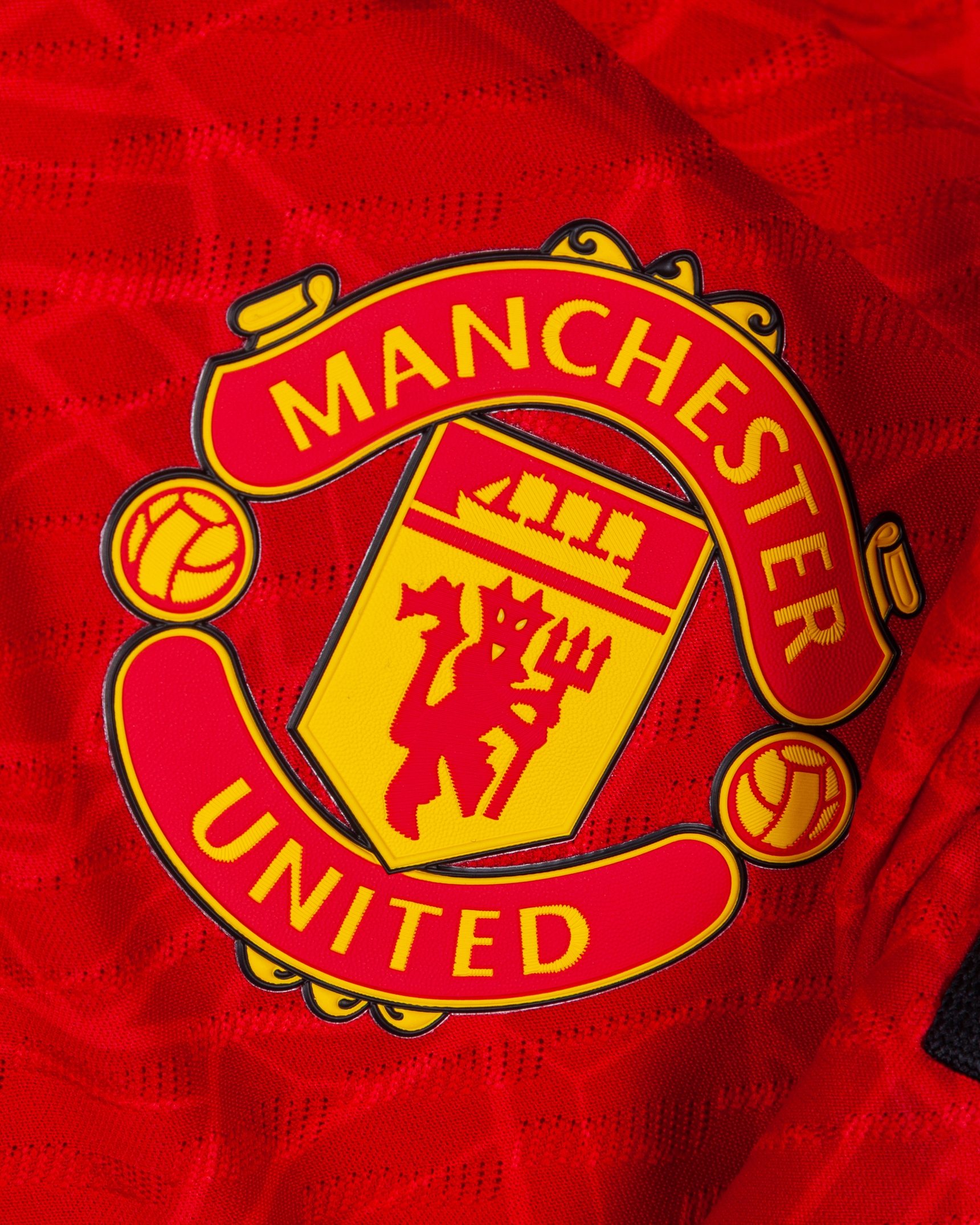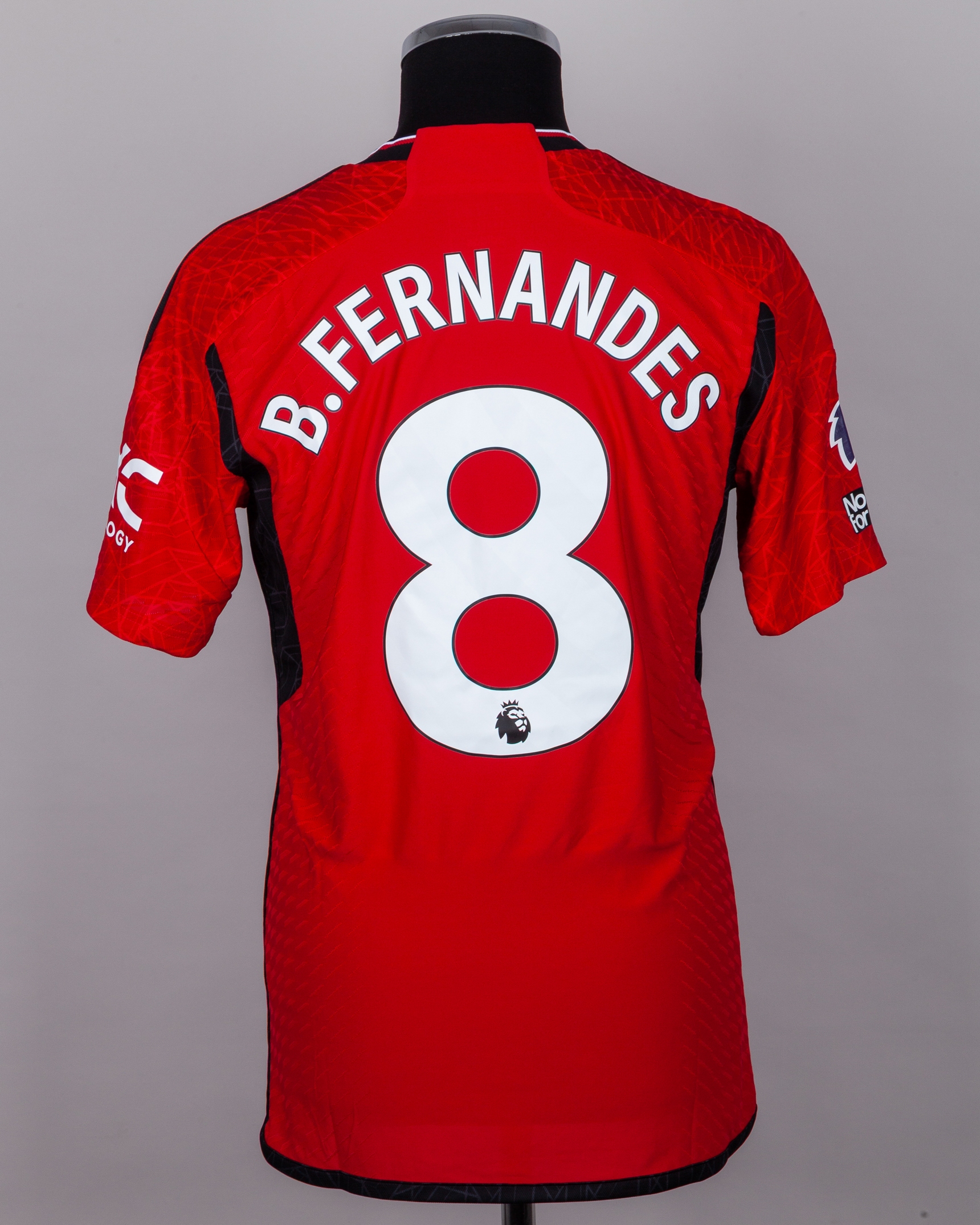 Bruno Fernandes red No.8 Manchester United match worn short-sleeved shirt, 2023-24, Adidas, M, with crew-neck collar and printed badge, the reverse lettered B. FERNANDES, the right sleeve with Premier League flash