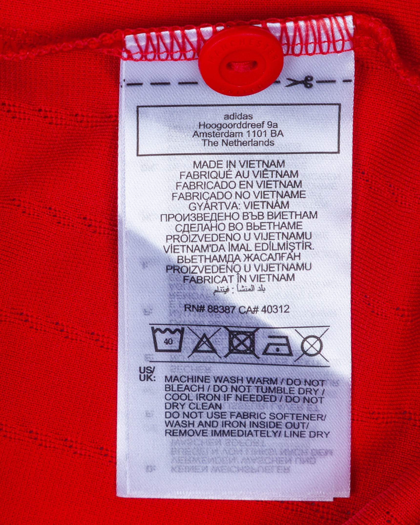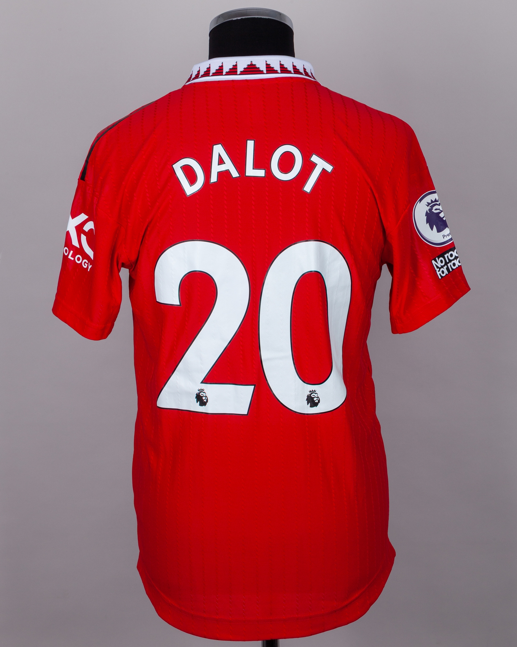 Diogo Dalot red No.20 Manchester United issued short-sleeved shirt, 2022-23, Adidas, 6, with button-up collar and printed badge, with embroidered poppy, the reverse lettered DALOT, the right sleeve with Premier League flash