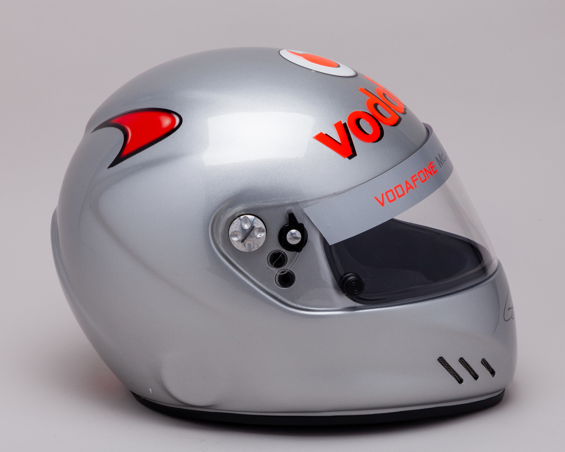 The helmet features the Vodafone McLaren Mercedes branding. The size sticker on the back of the helmet reads: 57 / M.