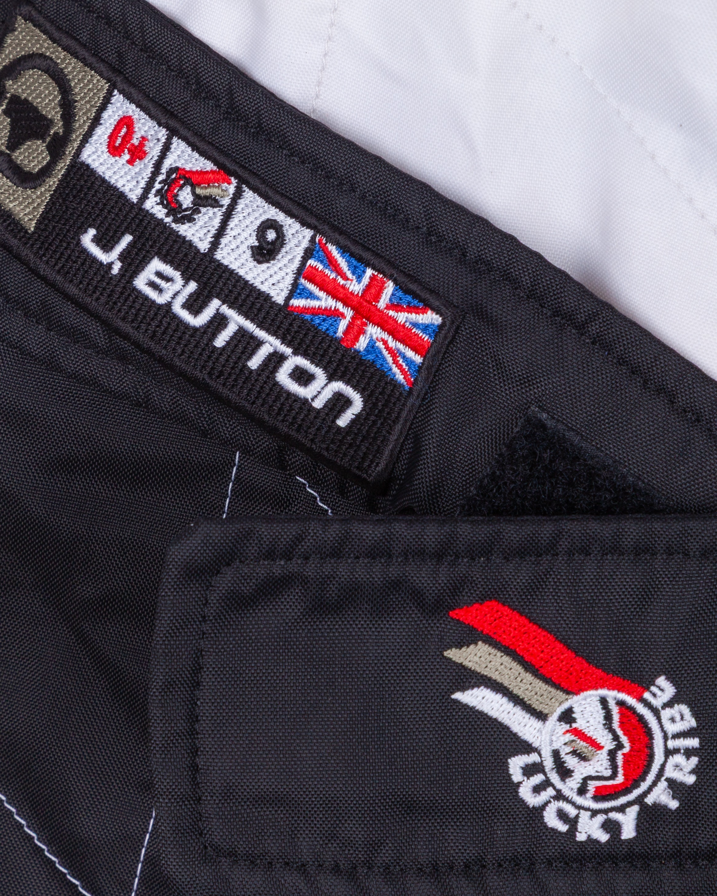 The suit is marked ‘JB2’ on the inside Alpinestars label. It has numerous sponsor branding and features Button's name and the British flag embroidered on the waist.