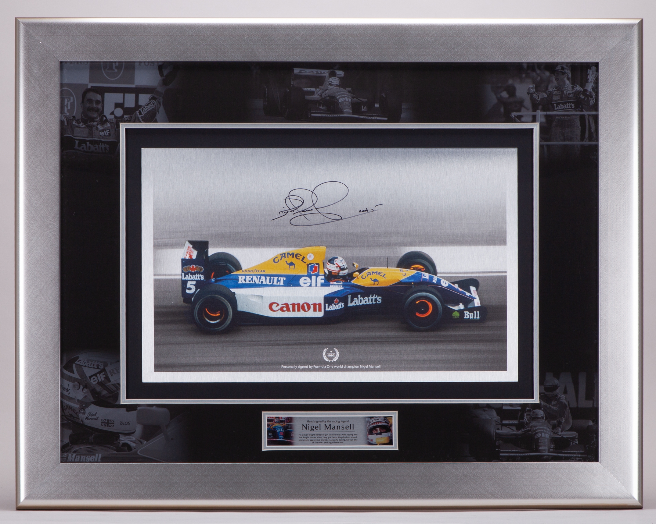 This is personally signed metal print of F1 World Champion Nigel Mansell. It has been professionally mounted and framed, complete with Nigel's Red 5 signature.