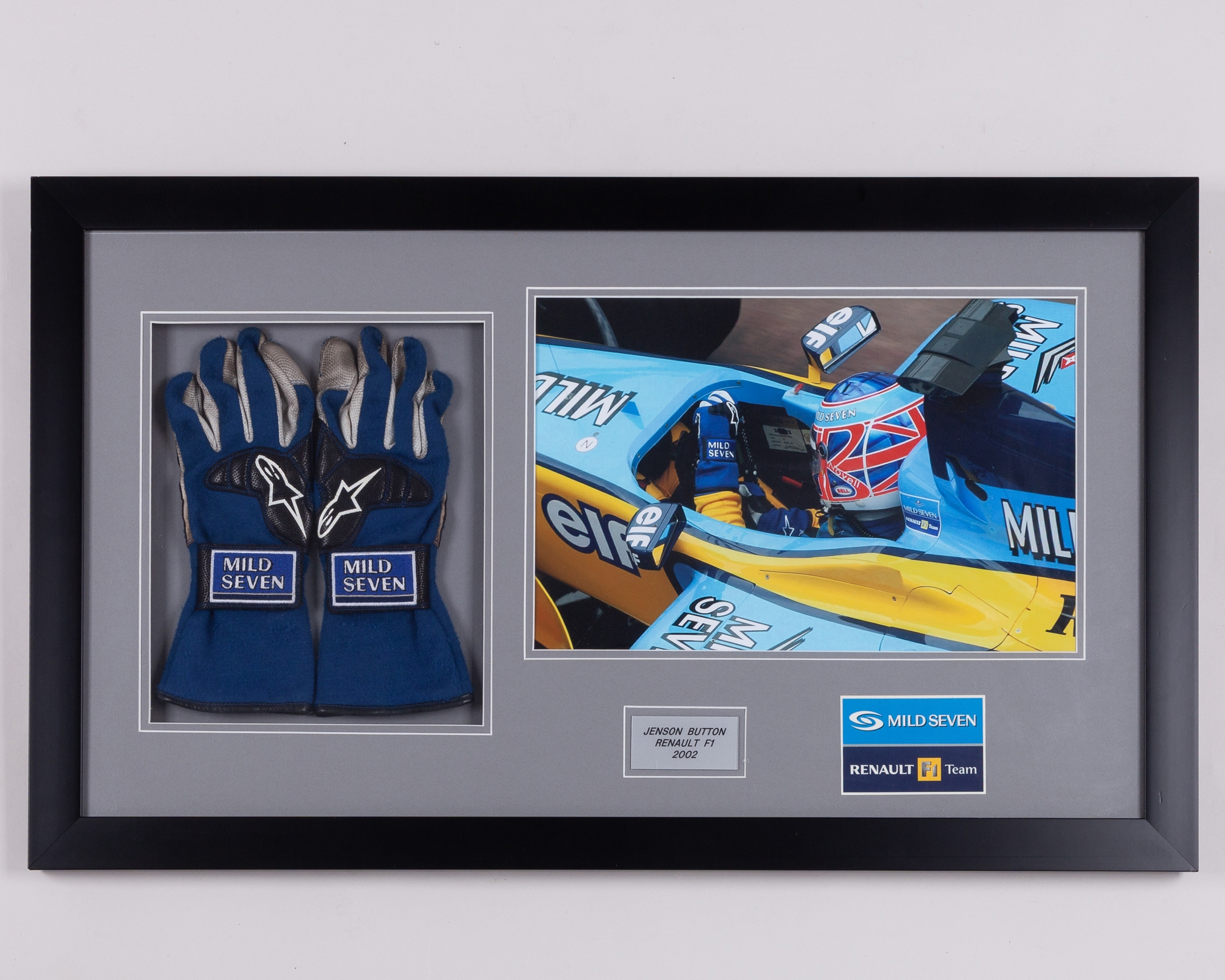 This professionally framed display features a pair of race-used gloves worn by F1 World Champion Jenson Button during the 2002 Formula One season with the Renault F1 Team.