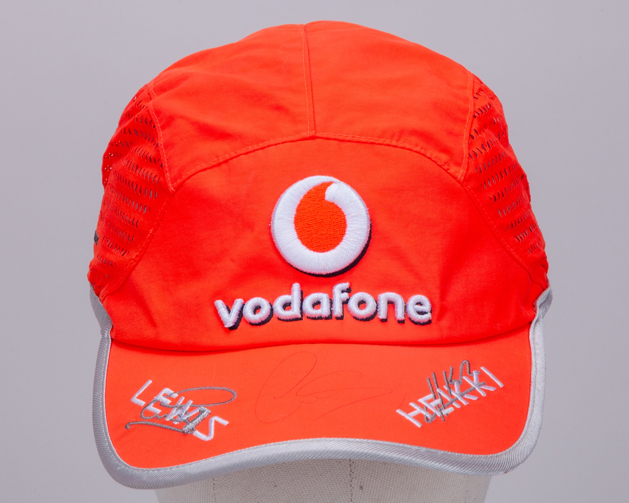 This exclusive Vodafone McLaren Mercedes team cap has been hand-signed by 7-time F1 World Champion Lewis Hamilton. Featuring the distinctive Vodafone McLaren Mercedes livery from Hamilton’s early career with the McLaren F1 Team.