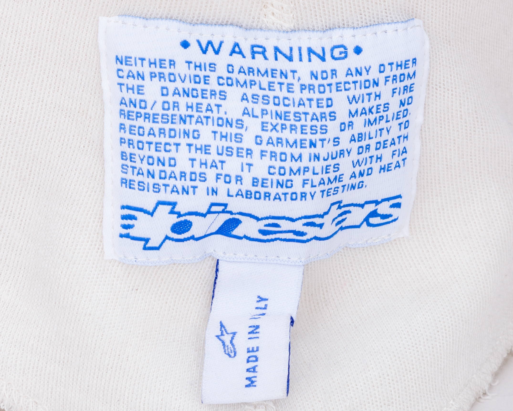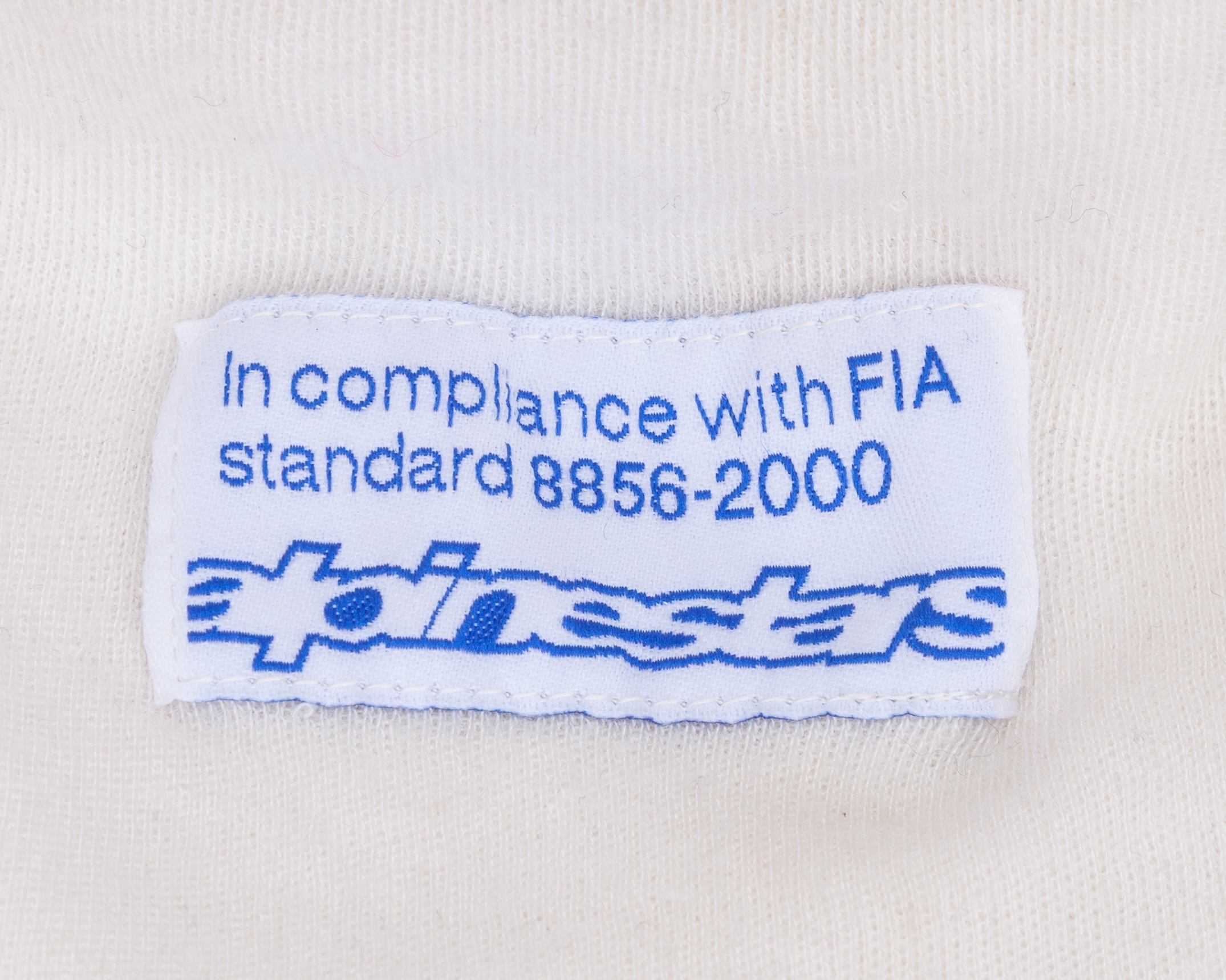 Crafted by Alpinestars, the label on the balaclava reads: In compliance with FIA standard 8856-2000.