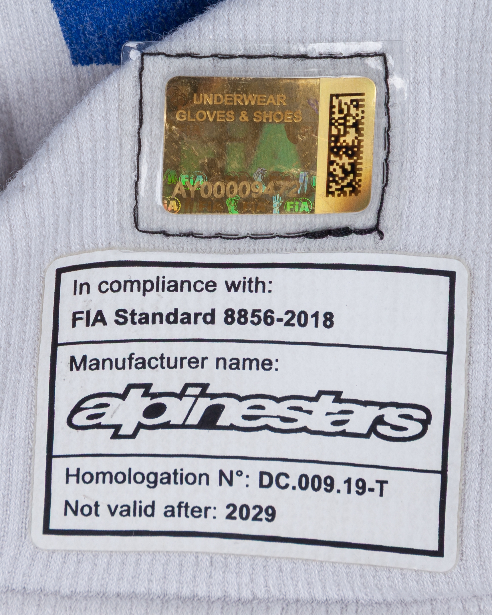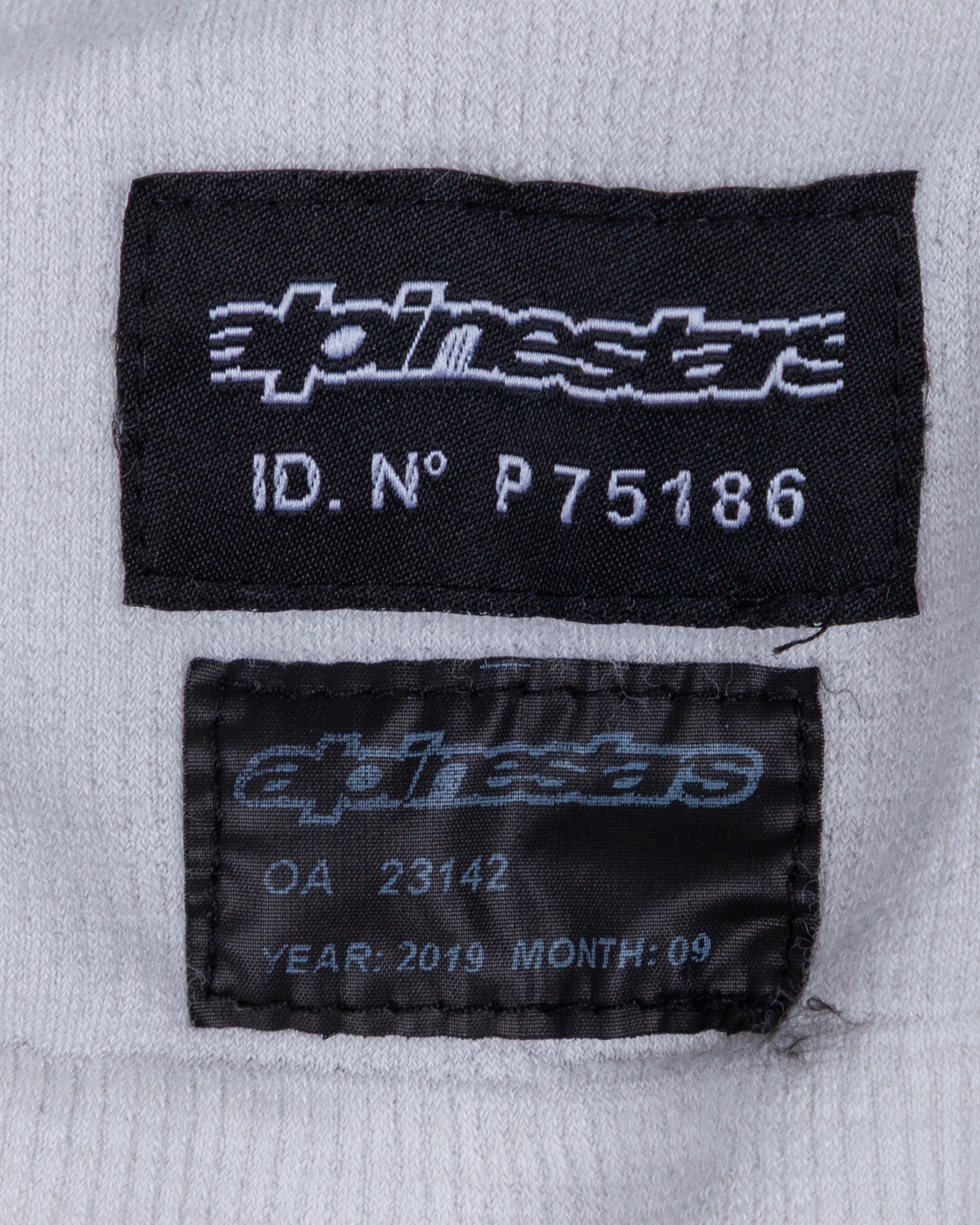 Crafted by Alpinestars, the label on the nomex top reads: In compliance with: FIA standard 8856-2018 / Homologation No: DC.009.19-T / Not valid after: 2029.