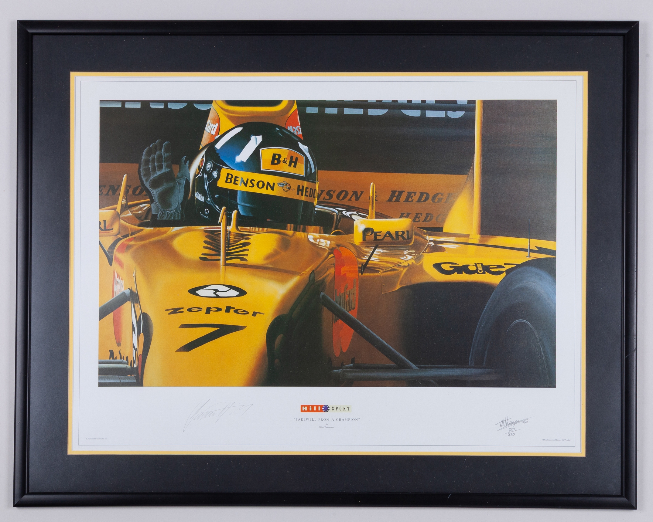 Personally hand-signed by Damon Hill and by the artist Mike Thompson. This print is limited edition number 353/950.