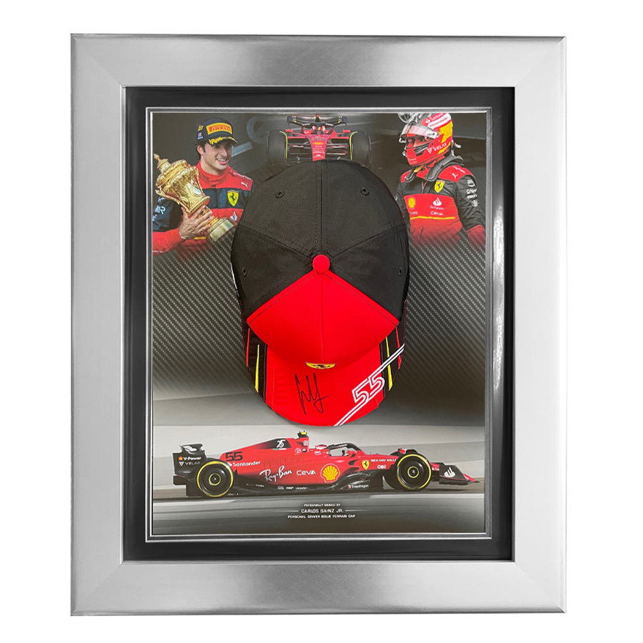 This driver issue cap has been personally signed by Carlos Sainz, and is professionally mounted and framed in a 3D stylish dome with background photo. The cap is from the year in which Carlos won his first race for Ferrari at the British Grand Prix.