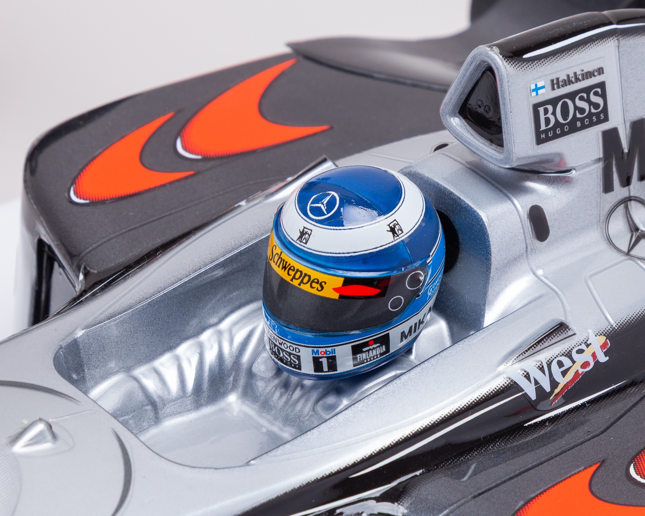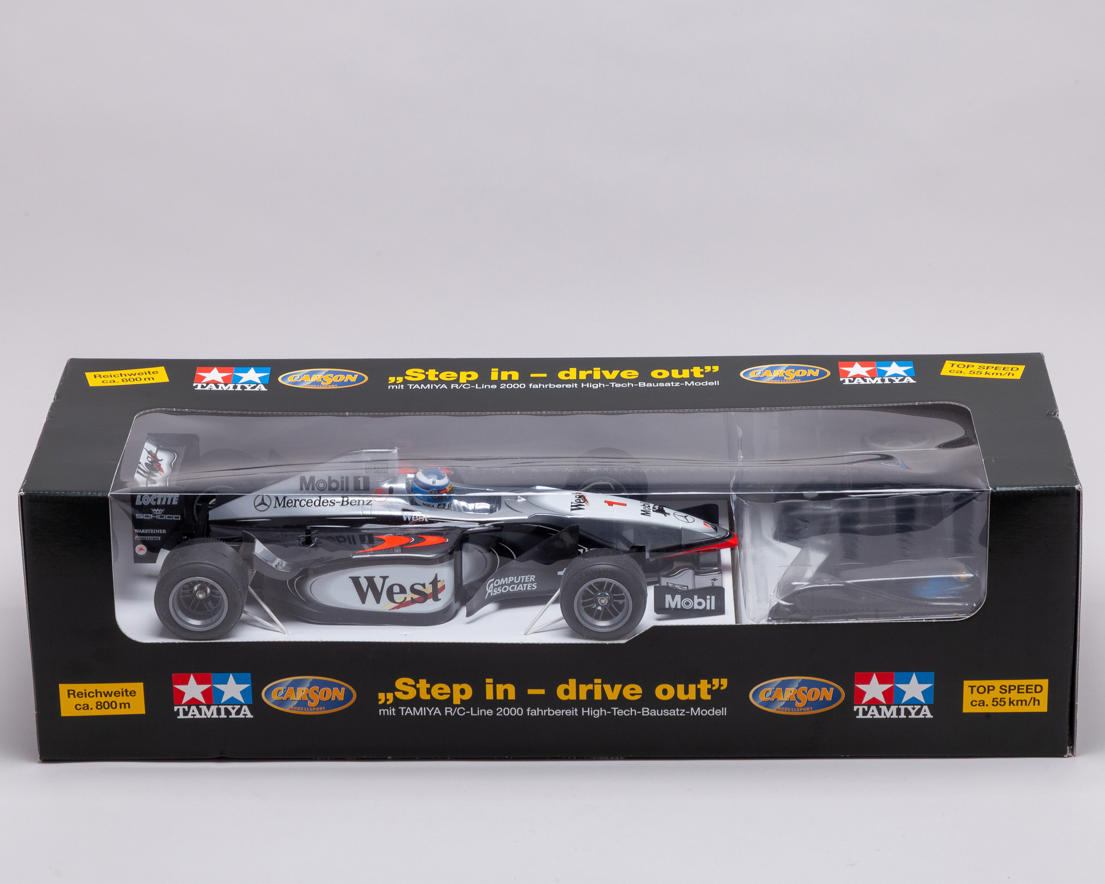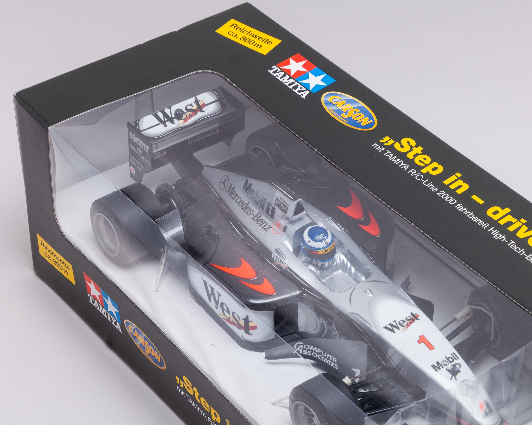 An exceptional Carson / Tamiya West McLaren Mercedes Formula 1 1:10 scale radio-controlled model, produced in Germany circa 2001 as part of the Tamiya R/C Line 2000 “Step-In Drive-Out” High-Tech Series, finished in authentic 2000–2001 Mika Häkkinen championship livery.