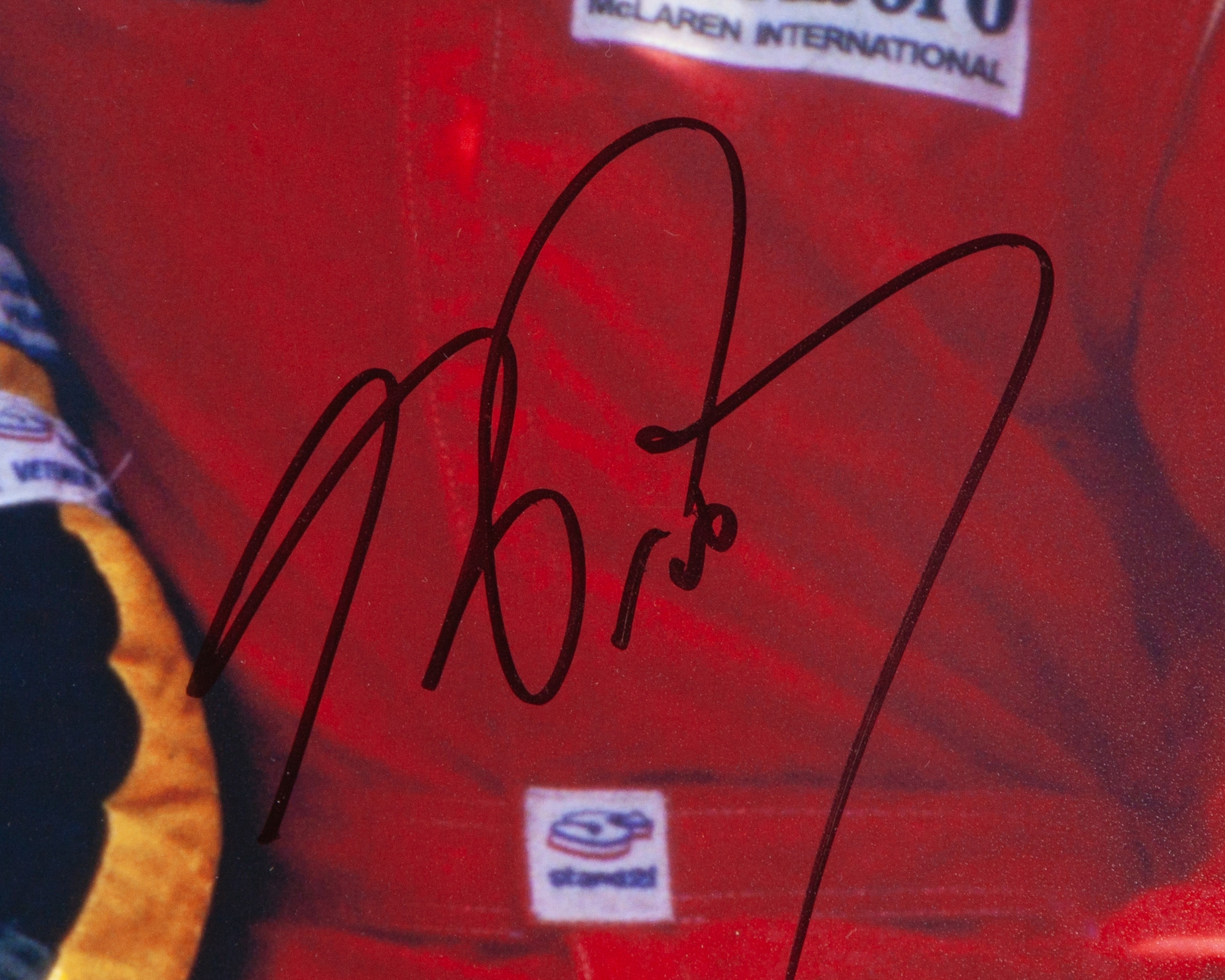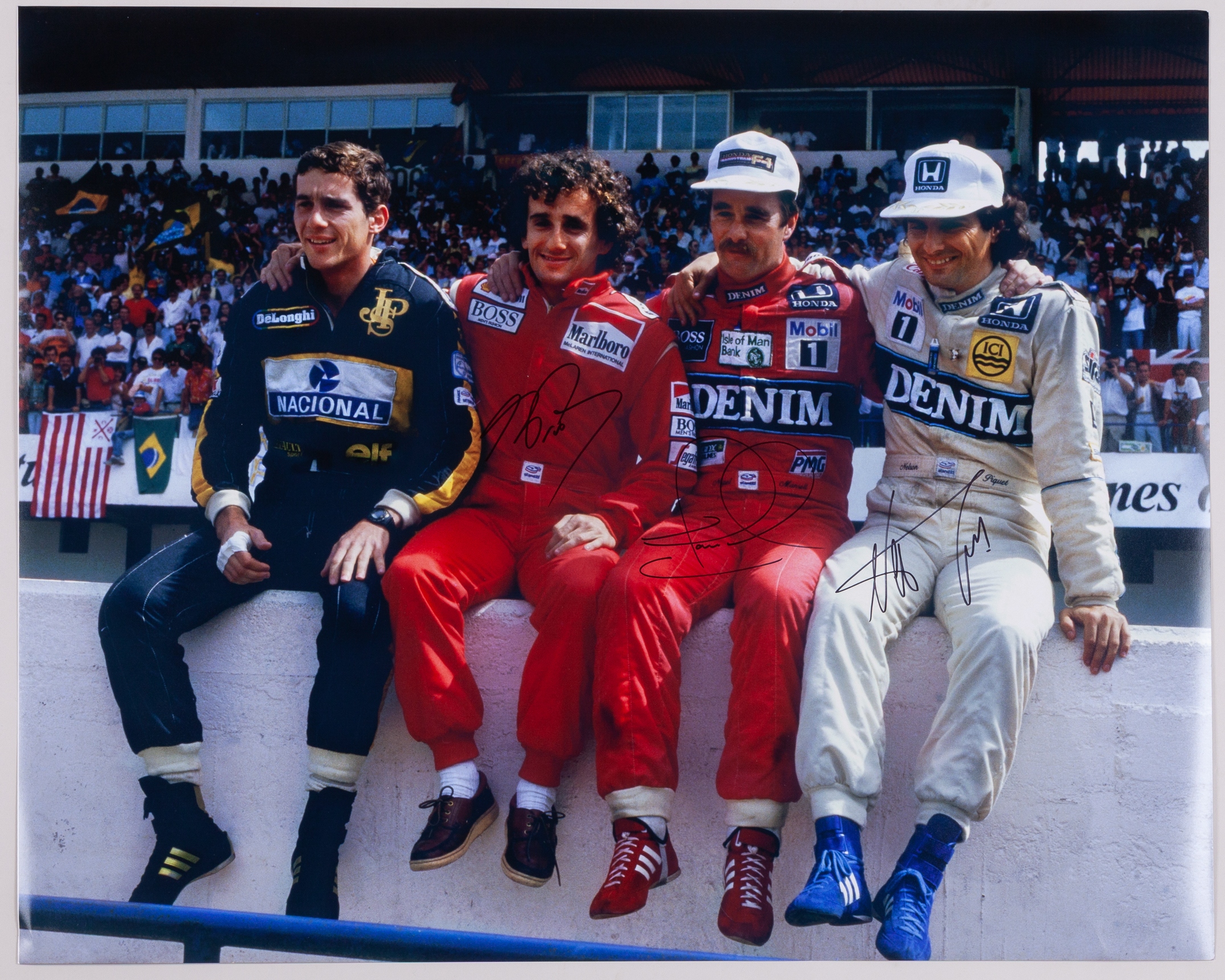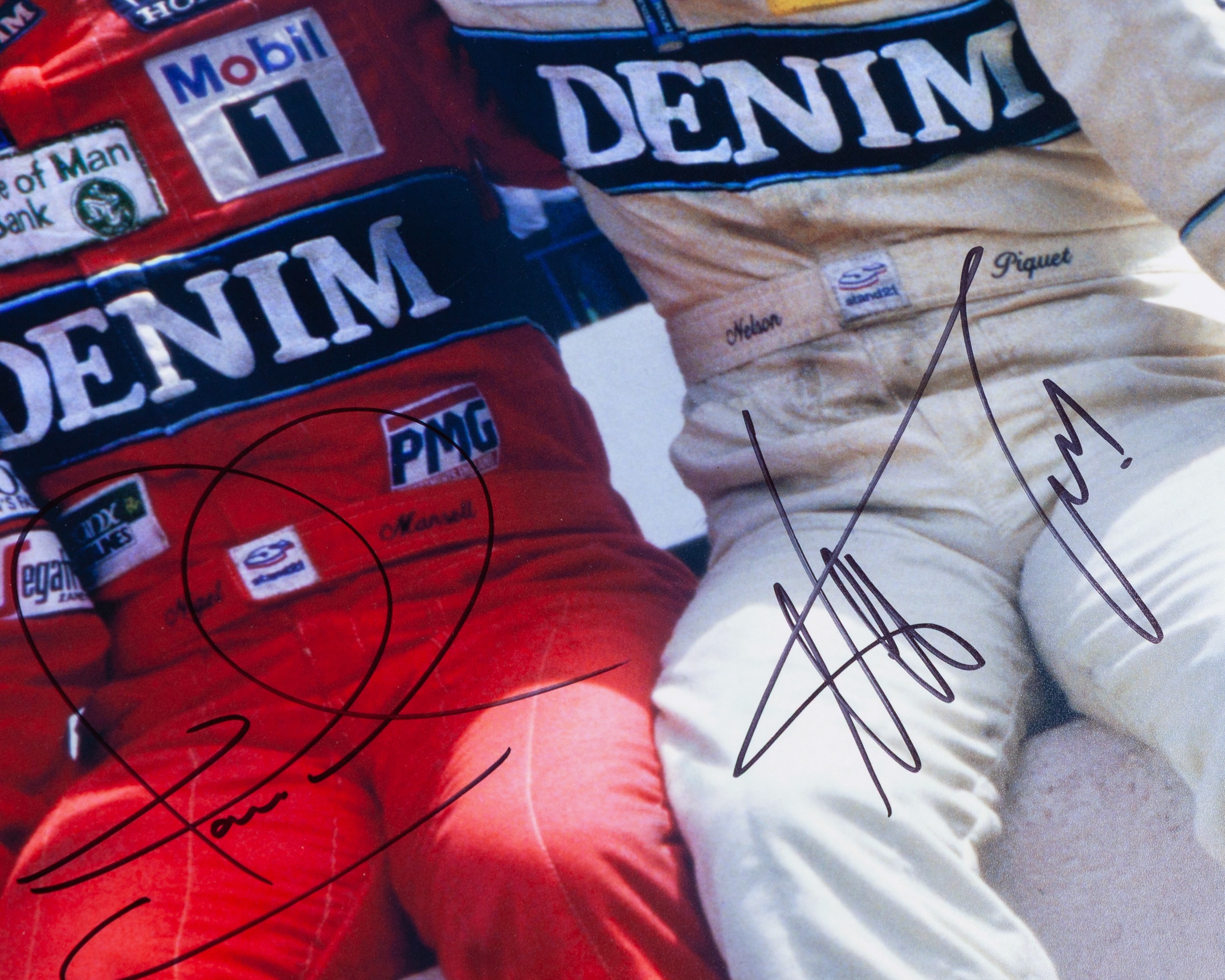 This “Wall of Champions” photo is personally signed by F1 World Champions Nigel Mansell, Alain Prost and Nelson Piquet.