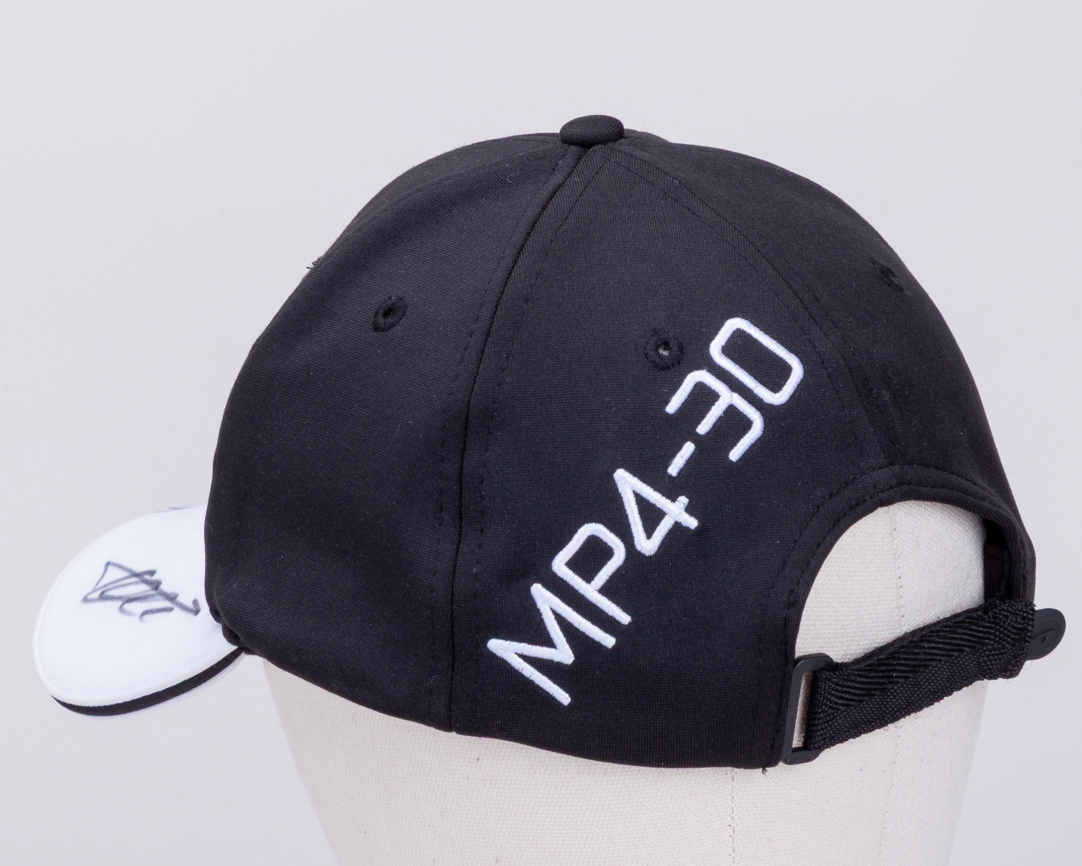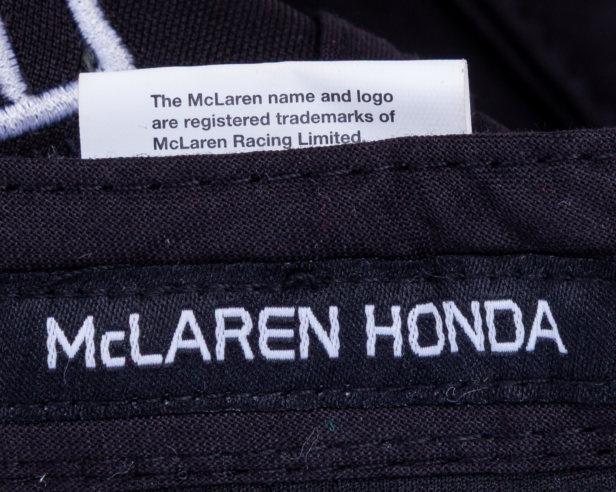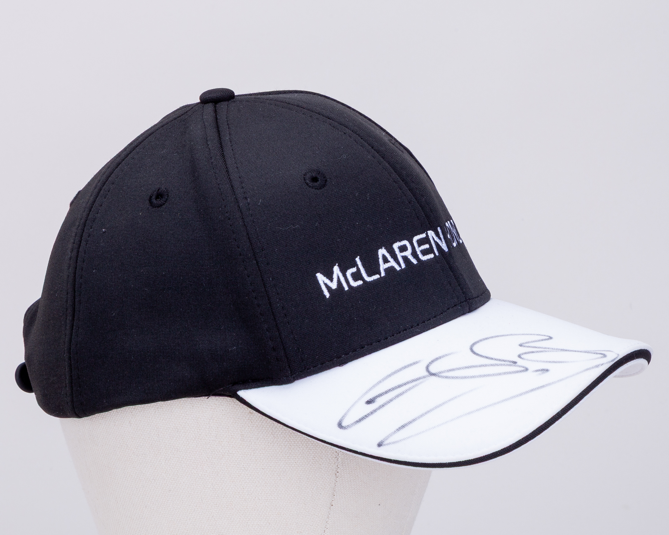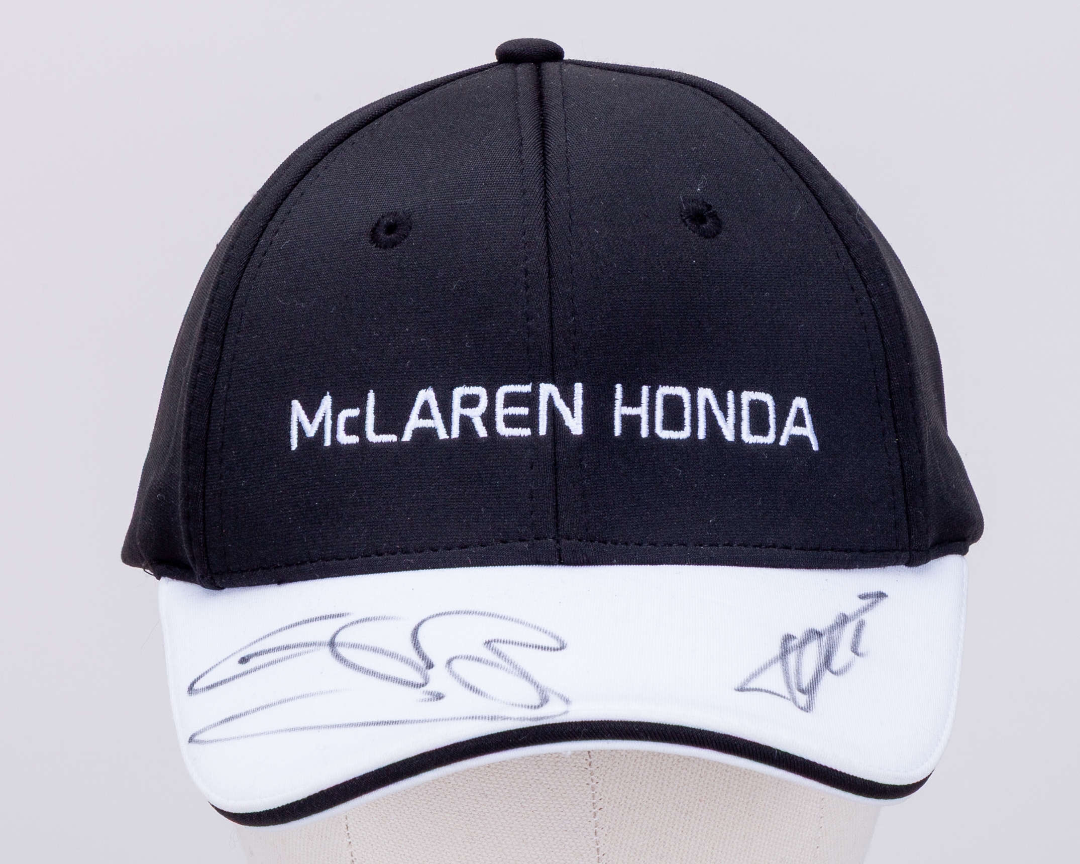 This is an official McLaren F1 Team cap, personally signed by 2-time World Champion Fernando Alonso and F1 World Champion Jenson Button.
