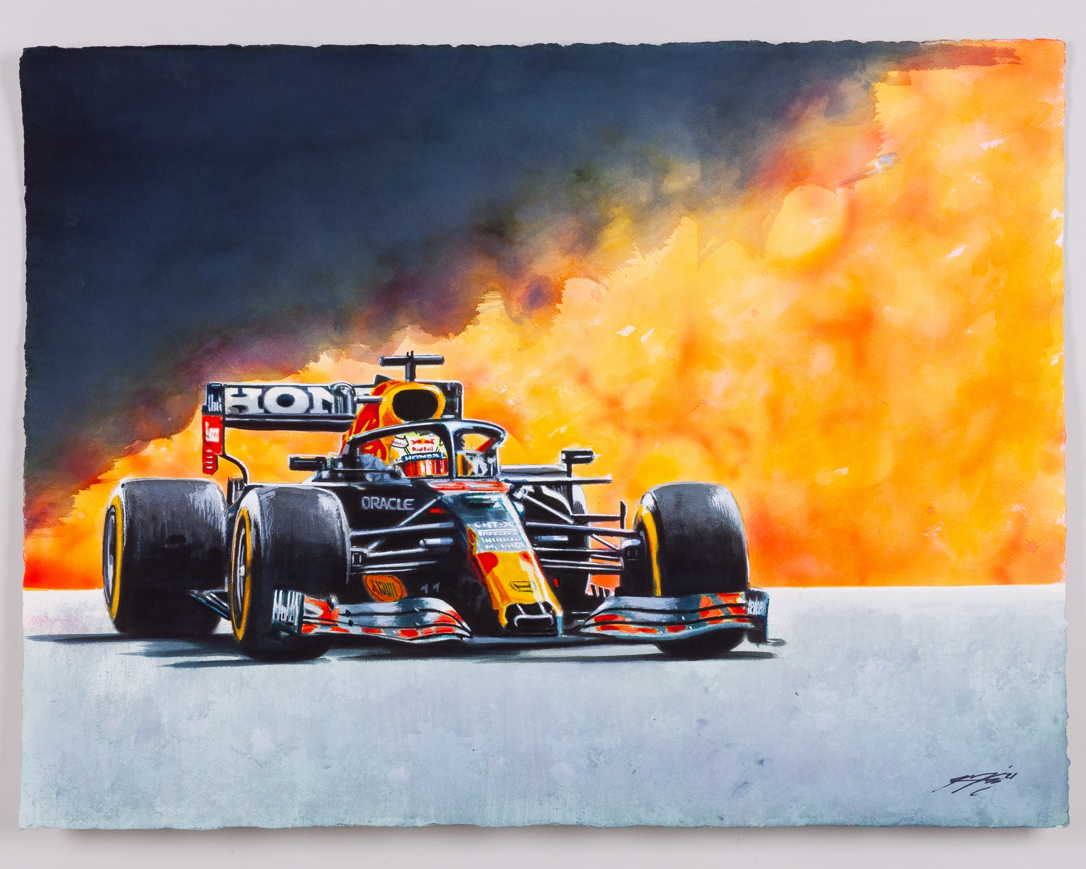 This stunning original watercolour painting by renowned motorsport artist Kevin Paige captures a defining moment in modern Formula One history - Max Verstappen’s 2021 World Championship-winning season with Red Bull Racing.