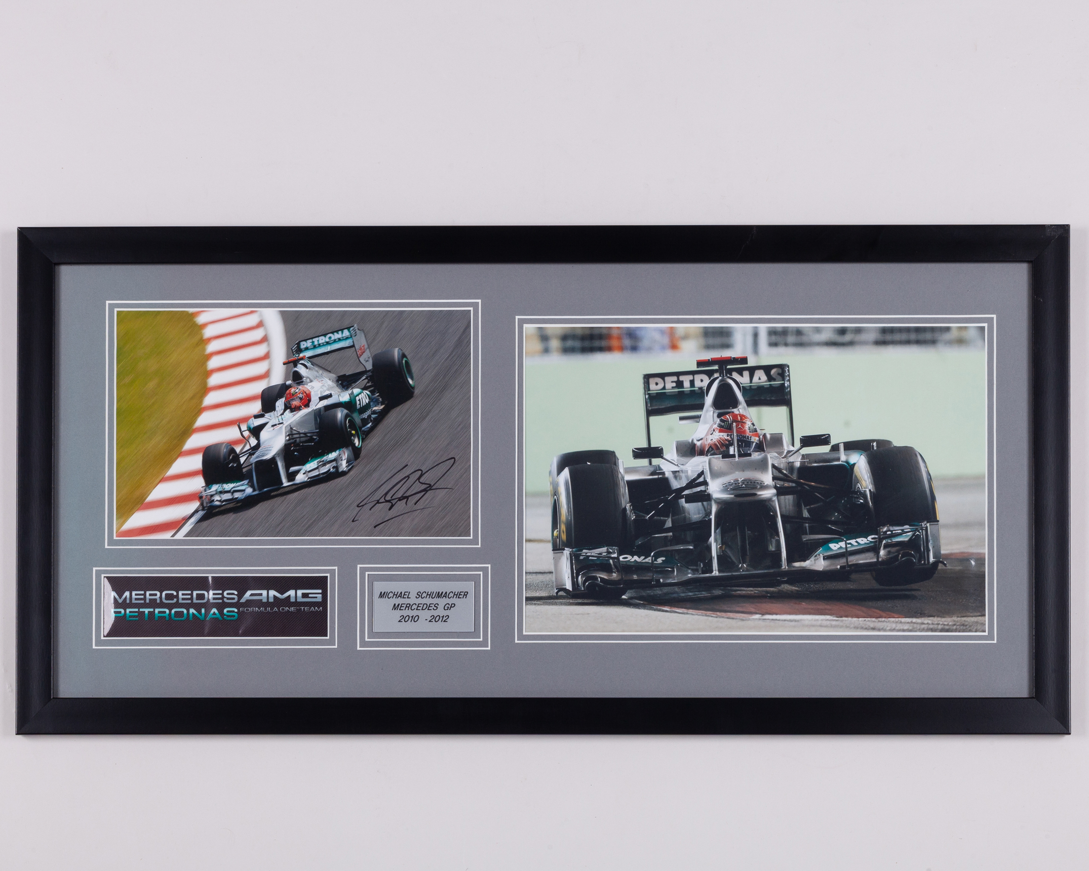 This framed picture display features the legendary Michael Schumacher during his time with the Mercedes-AMG Petronas Formula One Team, and is personally hand-signed by Schumacher himself.