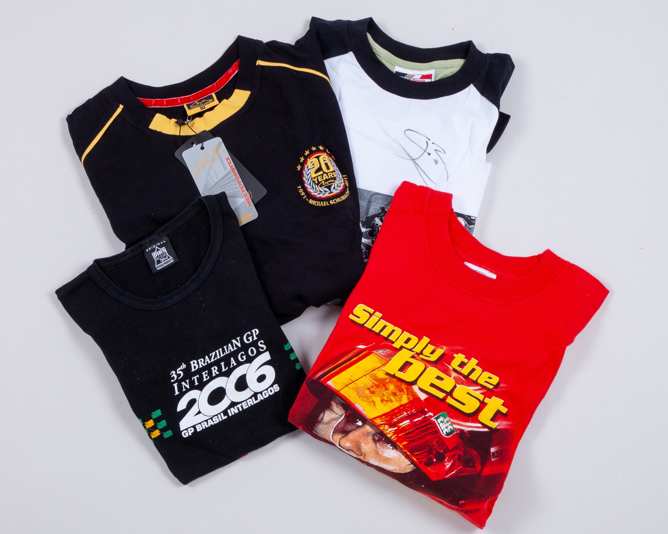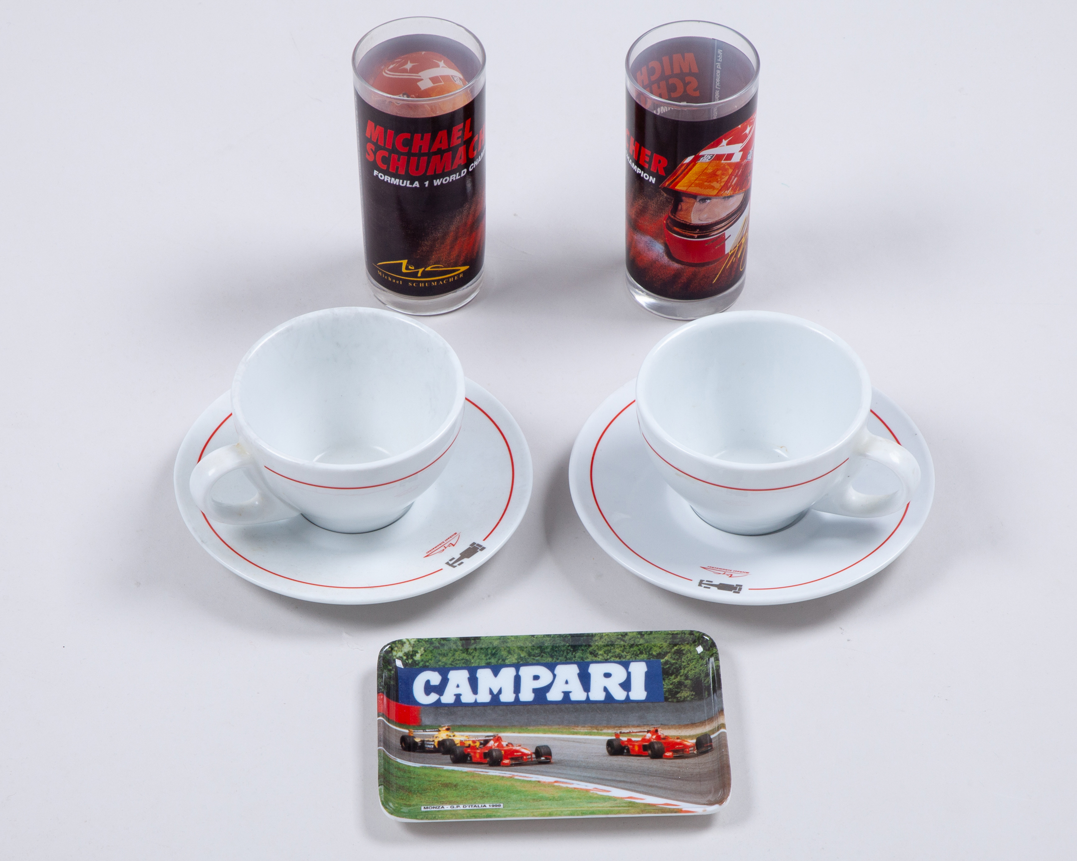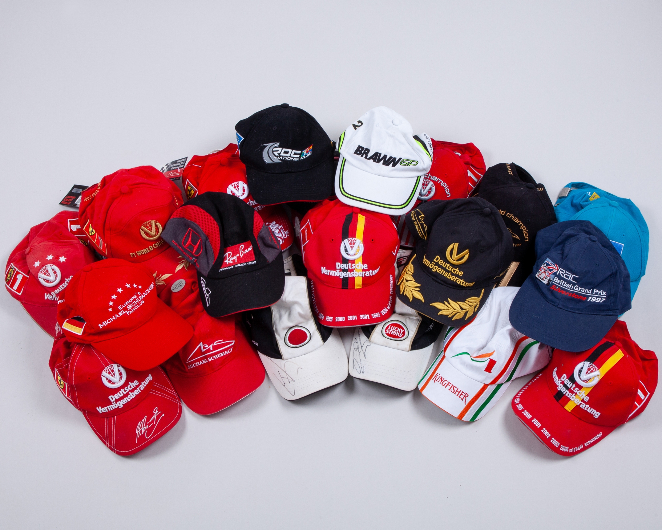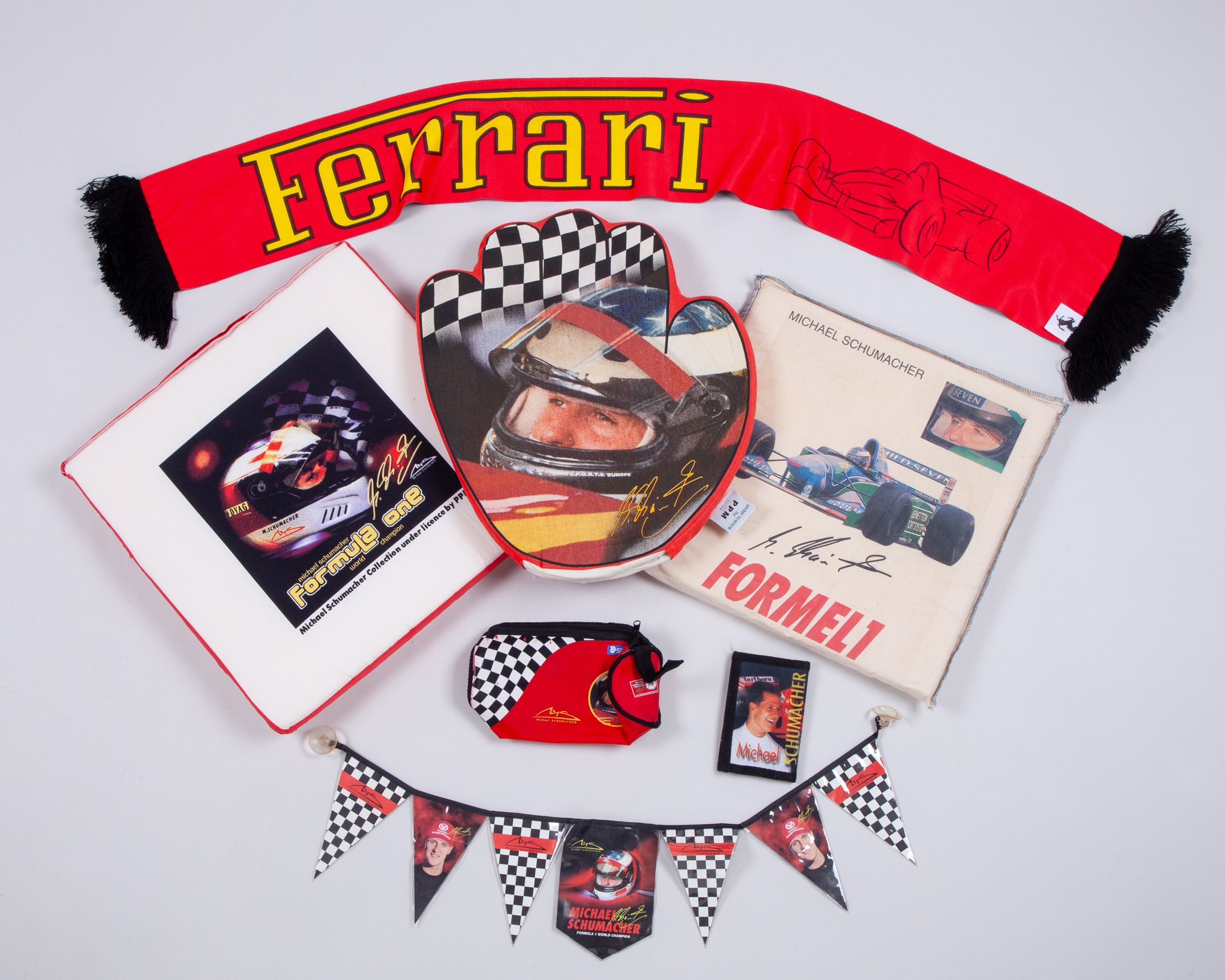 Includes team caps (mainly Michael Schumacher and Ferrari), jacket, t-shirts, calendars, a signed photo book, umbrella, mugs, plates, bags, Ferrari postcards and drink mats.